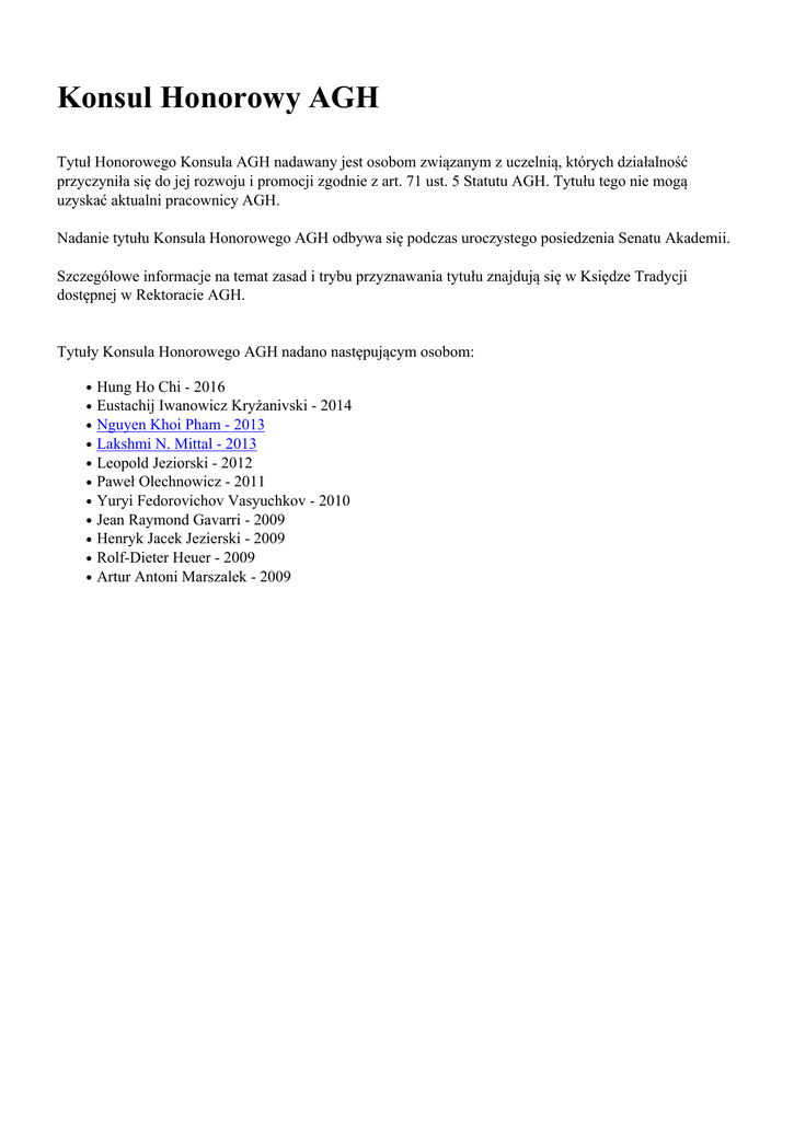 Konsul Honorowy AGH Tytuł Honorowego Konsula AGH nadawany jest osobom związanym z uczelnią, których działalność przyczyniła się do jej rozwoju i promocji zgodnie z art. 71 ust. 5 Statutu AGH. Tytułu tego nie mogą uzyskać aktualni pracownicy AGH. Nadanie tytułu Konsula Honorowego AGH odbywa się podczas uroczystego posiedzenia Senatu Akademii. Szczegółowe informacje na temat zasad i trybu przyznawania tytułu znajdują się w Księdze Tradycji dostępnej w Rektoracie AGH. Tytuły Konsula Honorowego AGH nadano następującym osobom: Hung Ho Chi - 2016 Eustachij Iwanowicz Kryżanivski - 2014 Nguyen Khoi Pham - 2013 Lakshmi N. Mittal - 2013 Leopold Jeziorski - 2012 Paweł Olechnowicz - 2011 Yuryi Fedorovichov Vasyuchkov - 2010 Jean Raymond Gavarri - 2009 Henryk Jacek Jezierski - 2009 Rolf-Dieter Heuer - 2009 Artur Antoni Marszalek - 2009