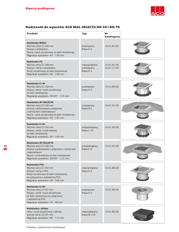Wpusty podłogowe Nadstawki do wpustów ACO WAL-SELECTA DN 50 i DN 70 Produkt Typ Nadstawka MEKU Wymiar ramy  148 mm Korpus z polietylenu Rama i ruszt szczelinowy ze stali nierdzewnej Regulacja wysokości: 42 - 130 mm Nadstawka PE Wymiar ramy  148 mm Korpus i rama z polietylenu Ruszt szczelinowy ze stali nierdzewnej Regulacja wysokości: 42 - 130 mm Nadstawka Cr-Ni Wymiar ramy  148 mm Korpus, rama i ruszt szczelinowy ze stali nierdzewnej Regulacja wysokości: 30/40* - 115 mm Nadstawka AV-SELECTA Wymiar ramy  148 mm Korpus z polipropylenu połączony z kołnierzem materiałowym Rama i ruszt szczelinowy ze stali nierdzewnej Regulacja wysokości: 55 - 130 mm Nadstawka Cr-Ni Wymiar ramy  150 mm Korpus, rama i ruszt kratowy ze stali nierdzewnej Regulacja wysokości: 55 - 130 mm 12 Nadstawka AV-SELECTA Wymiar ramy  148 mm Korpus z polipropylenu połączony z kołnierzem materiałowym Rama i ruszt kratowy ze stali nierdzewnej Regulacja wysokości: 30/40* - 115 mm Nadstawka PVC Wymiar ramy  150 mm Korpus i rama z PVC Ruszt szczelinowy ze stali nierdzewnej do połączenia z wykładziną PVC Regulacja wysokości: 40 - 105 mm Nadstawka Cr-Ni Wymiar ramy  157 mm Korpus, rama i ruszt szczelinowy ze stali nierdzewnej do połączenia z wykładziną PVC Regulacja wysokości: 23 - 98 mm Nadstawka z żeliwa ramy i ruszt szczelinowy z żeliwa, wymiar ramy: 197 mm Regulacja wysokości: 90 - 115 mm * Kołnierz z pierścieniem dociskowym Nr katalogowy przykręcany Klasa K 3 5141.81.00 nieprzykręcany przykręcany Klasa K 3 5141.87.00 5141.71.00 przykręcany Klasa K 3 5141.89.00 przykręcany Klasa K 3 5141.91.00 antypoślizgowy Klasa L 15 5141.92.00 antypoślizgowy Klasa K 3 5141.97.00 nieprzykręcany Klasa K 3 5141.86.00 przykręcany Klasa K 3 5141.96.00 nieprzykręcany Klasa M 125 5141.83.00 Wpusty podłogowe Nadstawki z rusztem ozdobnym do wpustów ACO WAL-SELECTA DN 50 i DN 70 Produkt Typ Nadstawka bez rusztu Wymiar ramy  148 mm Korpus z polietylenu, rama ze stali nierdzewnej Pasuje do wszystkich przykręcanych i nieprzykręcanych rusztów z wzorem Nr katalogowy 5141.81.10 Nadstawka bez rusztu z kołnierzem materiałowym Wymiar ramy  148 mm Korpus z polietylenu, rama ze stali nierdzewnej Pasuje do wszystkich przykręcanych i nieprzykręcanych rusztów z wzorem 5141.91.10 Ruszt Mondo nieprzykręcany przykręcany 5141.08.21 5141.07.21 Ruszt Quadrato nieprzykręcany przykręcany 5141.08.22 5141.07.22 Ruszt Linea nieprzykręcany przykręcany 5141.08.23 5141.07.23 Ruszt Wellness nieprzykręcany przykręcany 5141.08.24 5141.07.24 13 Ruszt Classic nieprzykręcany przykręcany 5141.08.25 5141.07.25 Ruszt Arco nieprzykręcany przykręcany 5141.08.26 5141.07.26 Ruszt Pop nieprzykręcany przykręcany 5141.08.27 5141.07.27 Ruszt Wave nieprzykręcany przykręcany 5141.08.28 5141.07.28