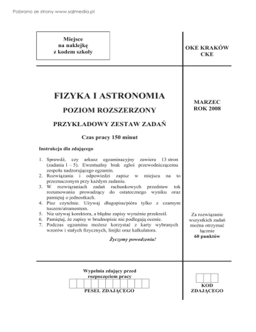 Pobrano ze strony www.sqlmedia.pl Miejsce na naklejkĊ z kodem szkoáy OKE KRAKÓW CKE FIZYKA I ASTRONOMIA POZIOM ROZSZERZONY MARZEC ROK 2008 PRZYKàADOWY ZESTAW ZADAē Czas pracy 150 minut Instrukcja dla zdającego 1. SprawdĨ, czy arkusz egzaminacyjny zawiera 13 stron (zadania 1 – 5). Ewentualny brak zgáoĞ przewodniczącemu zespoáu nadzorującego egzamin. 2. Rozwiązania i odpowiedzi zapisz w miejscu na to przeznaczonym przy kaĪdym zadaniu. 3. W rozwiązaniach zadaĔ rachunkowych przedstaw tok rozumowania prowadzący do ostatecznego wyniku oraz pamiĊtaj o jednostkach. 4. Pisz czytelnie. UĪywaj dáugopisu/pióra tylko z czarnym tuszem/atramentem. 5. Nie uĪywaj korektora, a báĊdne zapisy wyraĨnie przekreĞl. 6. PamiĊtaj, Īe zapisy w brudnopisie nie podlegają ocenie. 7. Podczas egzaminu moĪesz korzystaü z karty wybranych wzorów i staáych fizycznych, linijki oraz kalkulatora. ĩyczymy powodzenia! Za rozwiązanie wszystkich zadaĔ moĪna otrzymaü áącznie 60 punktów Wypeánia zdający przed rozpoczĊciem pracy PESEL ZDAJĄCEGO KOD ZDAJĄCEGO Pobrano ze strony www.sqlmedia.pl Przykáadowy zestaw zadaĔ z fizyki i astronomii Poziom rozszerzony 2 Zadanie 1. Jacht – Ğluza wodna (12 pkt) Podczas wakacyjnego rejsu jeden z jego uczestników wykorzystując fakt, Īe jacht, na którym siĊ znajdowaá wpáynąá do komory Ğluzy wodnej*), umieĞciá na szalce bardzo czuáej wagi sprĊĪynowej kamieĔ o masie 1 kg i obserwowaá wskazania wagi. Wyniki obserwacji ilustruje poniĪszy wykres, który przedstawia uproszczoną zaleĪnoĞü wskazaĔ wagi od czasu. Po otwarciu Ğluzy poziom wody w komorze podnosiá siĊ jednostajnie przez pierwsze trzynaĞcie sekund do momentu jej zamkniĊcia. Efekty związane z bezwáadnoĞcią jachtu byáy obserwowane w pierwszej i czternastej sekundzie obserwacji. Przyjmij, Īe wartoĞü przyspieszenia ziemskiego w miejscu dokonywania pomiaru jest równa 9,80 m/s2 oraz, Īe w czasie piątej sekundy jacht unosiá siĊ wzglĊdem dna z prĊdkoĞcią o staáej wartoĞci 0,25 m/s. F, N 10,30 10,05 9,80 9,55 9,30 0 1 2 3 4 5 6 7 8 9 10 11 12 13 14 t, s *) ĝluza wodna – urządzenie na kanale Īeglownym umoĪliwiające przepáywanie jednostek páywających (np. statki, barki, jachty) miĊdzy dwoma zbiornikami o róĪnych poziomach wody, zawierające komorĊ wodną ograniczoną ruchomymi zamkniĊciami. 1.1 (2 pkt) Zapisz, analizując wykres, peáne nazwy rodzajów ruchów, jakimi podnosiá siĊ jacht w pierwszej i czternastej sekundzie ruchu. 1. ........................................................................................................................................... 2. ........................................................................................................................................... 1.2 (2 pkt) Oblicz wartoĞü siáy wyporu dziaáającej na jacht w piątej sekundzie obserwacji wiedząc, Īe caákowita masa jachtu wynosi 1500 kg. OdpowiedĨ krótko uzasadnij. Pobrano ze strony www.sqlmedia.pl Przykáadowy zestaw zadaĔ z fizyki i astronomii Poziom rozszerzony 3 1.3 (3 pkt) Zapisz, w jakich przedziaáach czasu (spoĞród przedstawionych na wykresie), gáĊbokoĞü zanurzenia jachtu byáa najwiĊksza i najmniejsza. OdpowiedĨ uzasadnij. 1.4 (3 pkt) Narysuj wykres przedstawiający zaleĪnoĞü wartoĞci prĊdkoĞci podnoszenia jachtu wzglĊdem dna od czasu. Na wykresie nanieĞ odpowiednie wartoĞci liczbowe. Wykres sporządĨ dla caáego czasu obserwacji. 1.5 (2 pkt) Oblicz róĪnicĊ poziomów wody w Ğluzie. Pobrano ze strony www.sqlmedia.pl Przykáadowy zestaw zadaĔ z fizyki i astronomii Poziom rozszerzony 4 Zadanie 2. Akwarium (14 pkt) Podczas zajĊü koáa biologicznego uczeĔ miaá za zadanie, wykorzystując lupĊ, obserwowaü niewielkiego Ğlimaka znajdującego siĊ na wewnĊtrznej Ğcianie akwarium (rys.). Drgająca powierzchnia wody w akwarium uniemoĪliwiaáa bezpoĞrednią obserwacjĊ, wobec czego uczeĔ postanowiá zanurzyü soczewkĊ w wodzie i obserwowaü obraz Ğlimaka na przeciwlegáej Ğcianie akwarium pokrytej cienką warstwą glonów, wykorzystując ją jako ekran (matówkĊ). Po silnym oĞwietleniu Ğlimaka uzyskaá dla dwóch ustawieĔ lupy, wáoĪonej do akwarium, ostre obrazy Ğlimaka. W lupie zastosowano cienką symetryczną dwuwypukáą szklaną soczewkĊ o bezwzglĊdnym 3 i ogniskowej w powietrzu wynoszącej 7,5 cm. Przyjmij, Īe 2 odlegáoĞü pomiĊdzy Ğlimakiem i jego obrazem na przeciwlegáej Ğcianie wynosiáa 125 cm, 4 oraz, Īe bezwzglĊdny wspóáczynnik zaáamania wody jest równy . 3 wspóáczynniku zaáamania Ğlimak 2.1 (4 pkt) Oblicz ogniskową soczewki w wodzie. soczewka glony Pobrano ze strony www.sqlmedia.pl Przykáadowy zestaw zadaĔ z fizyki i astronomii Poziom rozszerzony 5 2.2 (4 pkt) Narysuj konstrukcjĊ powstawania rzeczywistego powiĊkszonego obrazu Ğlimaka w opisanej sytuacji. 2.3 (6 pkt) Oblicz odlegáoĞü pomiĊdzy dwoma poáoĪeniami soczewki w wodzie, dla których uczeĔ uzyskaá ostre obrazy Ğlimaka. Do obliczeĔ przyjmij, Īe ogniskowa soczewki w wodzie wynosi 30 cm. Pobrano ze strony www.sqlmedia.pl 6 Przykáadowy zestaw zadaĔ z fizyki i astronomii Poziom rozszerzony Zadanie 3. Akcelerator (14 pkt) W elektrostatycznym liniowym akceleratorze Van de Graffa przyspieszano protony do energii 5 MeV. Podczas przyspieszania w jednorodnym polu elektrycznym na drodze 25 m protony uzyskiwaáy prĊdkoĞü koĔcową o wartoĞci 3·107 m/s. NatĊĪenie prądu elektrycznego wiązki protonów, opuszczających ten akcelerator i kierowanych na tarczĊ pomiarową, wynosiáo 40 ȝA. W obliczeniach potraktuj przyspieszane protony nierelatywistycznie, pomiĔ ich początkową energiĊ kinetyczną, oraz przyjmij, Īe wszystkie przyspieszone protony zostają pocháoniĊte przez tarczĊ pomiarową. 3.1 (3 pkt) Oblicz wartoĞü natĊĪenia pola elektrycznego przyspieszającego protony. 3.2 (2 pkt) Oblicz czas przyspieszania protonów w akceleratorze. Pobrano ze strony www.sqlmedia.pl