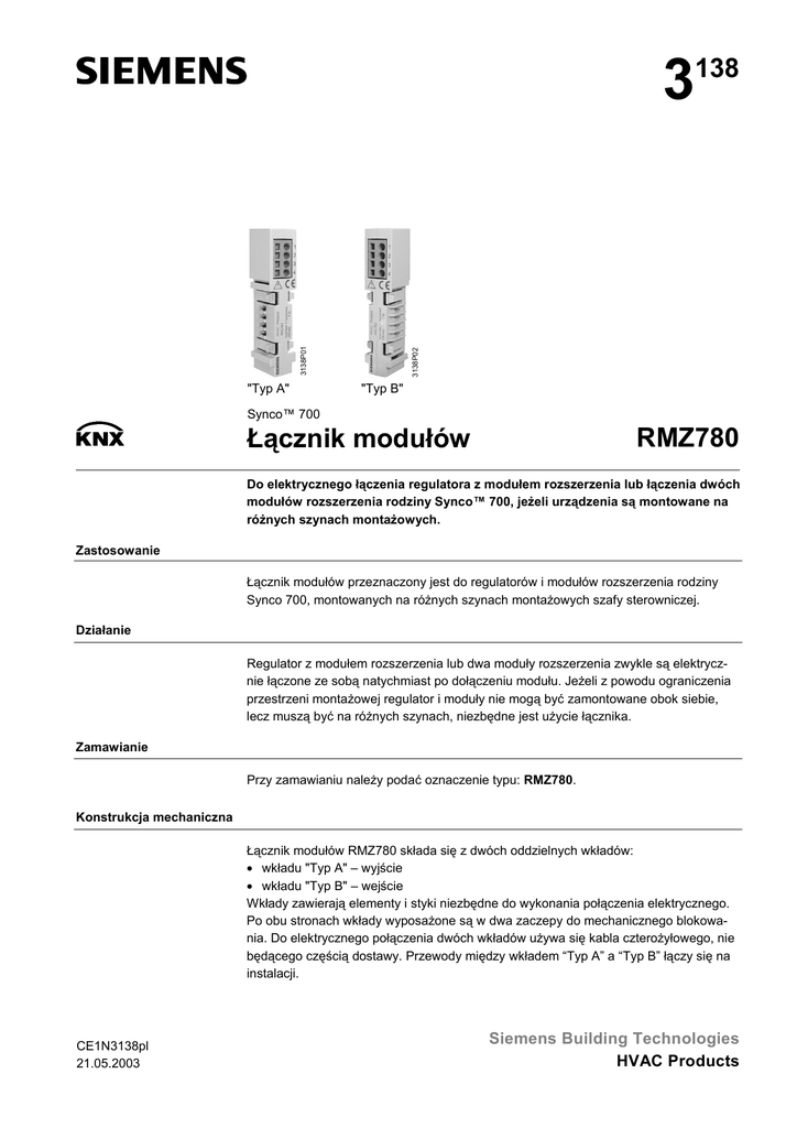 3 "Typ A" 3138P02 3138P01 138 "Typ B" Synco™ 700 RMZ780 Łącznik modułów Do elektrycznego łączenia regulatora z modułem rozszerzenia lub łączenia dwóch modułów rozszerzenia rodziny Synco™ 700, jeżeli urządzenia są montowane na różnych szynach montażowych. Zastosowanie Łącznik modułów przeznaczony jest do regulatorów i modułów rozszerzenia rodziny Synco 700, montowanych na różnych szynach montażowych szafy sterowniczej. Działanie Regulator z modułem rozszerzenia lub dwa moduły rozszerzenia zwykle są elektrycznie łączone ze sobą natychmiast po dołączeniu modułu. Jeżeli z powodu ograniczenia przestrzeni montażowej regulator i moduły nie mogą być zamontowane obok siebie, lecz muszą być na różnych szynach, niezbędne jest użycie łącznika. Zamawianie Przy zamawianiu należy podać oznaczenie typu: RMZ780. Konstrukcja mechaniczna Łącznik modułów RMZ780 składa się z dwóch oddzielnych wkładów: • wkładu "Typ A" – wyjście • wkładu "Typ B" – wejście Wkłady zawierają elementy i styki niezbędne do wykonania połączenia elektrycznego. Po obu stronach wkłady wyposażone są w dwa zaczepy do mechanicznego blokowania. Do elektrycznego połączenia dwóch wkładów używa się kabla czterożyłowego, nie będącego częścią dostawy. Przewody między wkładem “Typ A” a “Typ B” łączy się na instalacji. CE1N3138pl 21.05.2003 Siemens Building Technologies HVAC Products Montaż i instalacja • Połączenie przewodów między wkładem "Typ A" i "Typ B" należy wykonać przed montażem! • Po wykonaniu montażu, zacisków nie można odsłaniać! Do podłączania przewodów należy posłużyć się wkrętakiem wielkości 0. Przy montowaniu łącznika modułów, należy przestrzegać następujących zasad • Wkład "Typ A" należy dołączyć po stronie wyjściowej regulatora lub modułu rozszerzenia (pierwsza szyna montażowa) • Wkład "Typ B" należy dołączyć po stronie wejściowej modułu rozszerzenia (druga szyna montażowa) Jeżeli zasady te nie będą przestrzegane, połączenie elektryczne nie zostanie zrealizowane. Aby wyjąć łącznik, należy odblokować dwa zaczepy (1), popychając je wkrętakiem. RMZ780 RMH7... / RMU7... / RMZ78... 1 A A B 1—1 2—2 3—3 4—4 Nr 0 maks. 10 m RMZ780 RMZ781... RMZ788 maks. 2.5 mm x = 8...9 mm Legenda 1 B 3138J06 x 1 Zaczepy blokujące Łącznik dostarczany jest z instrukcją montażu (nr 74 319 0380 0). Dane techniczne Maksymalna długość kabla Specyfikacja kabla Specyfikacja wkładu 10 m (całkowita) przekrój wg danych zabezpieczeń linii G/ G0 (regulator) 4 styki – napięcie niskie SELV / PELV Wymiary 18,5 22,5 18,5 22,5 3 4 3138M02 87,5 1 2 3 4 87,5 1 2 Wkład "Typ A" na wyjście Wymiary w mm Wkład "Typ B" na wejście 2/2 2003 Siemens Building Technologies Siemens Building Technologies HVAC Products Łącznik modułów RMZ780 CE1N3138pl 21.05.2003