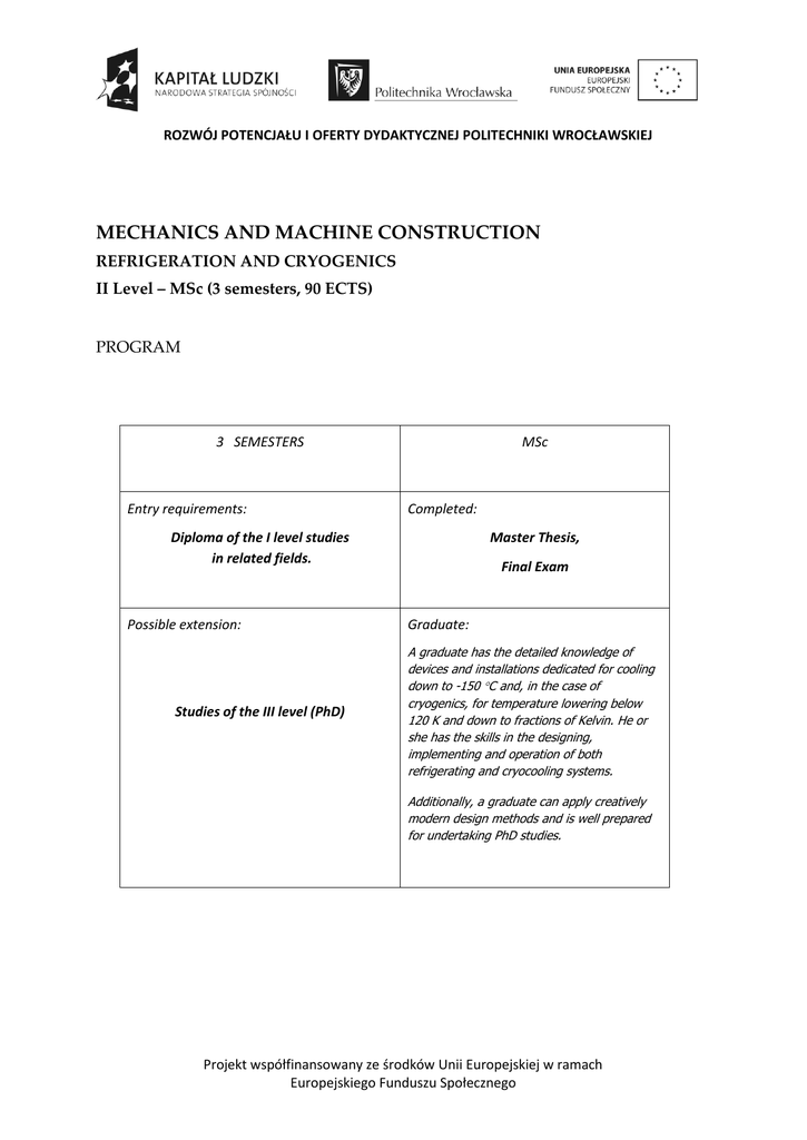 ROZWÓJ POTENCJAŁU I OFERTY DYDAKTYCZNEJ POLITECHNIKI WROCŁAWSKIEJ MECHANICS AND MACHINE CONSTRUCTION REFRIGERATION AND CRYOGENICS II Level – MSc (3 semesters, 90 ECTS) PROGRAM 3 SEMESTERS Entry requirements: MSc Completed: Diploma of the I level studies in related fields. Possible extension: Studies of the III level (PhD) Master Thesis, Final Exam Graduate: A graduate has the detailed knowledge of devices and installations dedicated for cooling down to -150 C and, in the case of cryogenics, for temperature lowering below 120 K and down to fractions of Kelvin. He or she has the skills in the designing, implementing and operation of both refrigerating and cryocooling systems. Additionally, a graduate can apply creatively modern design methods and is well prepared for undertaking PhD studies. Projekt współfinansowany ze środków Unii Europejskiej w ramach Europejskiego Funduszu Społecznego ROZWÓJ POTENCJAŁU I OFERTY DYDAKTYCZNEJ POLITECHNIKI WROCŁAWSKIEJ Structure of the programme (credits) Semester 1 Semester 2 Semester 3 1 2 BC AC 3 4 AC 5 6 AC FL 7 8 9 Ad R&C 10 11 12 13 14 15 16 17 Ad R&C 18 19 20 Projekt współfinansowany ze środków Unii Europejskiej w ramach Europejskiego Funduszu Społecznego ROZWÓJ POTENCJAŁU I OFERTY DYDAKTYCZNEJ POLITECHNIKI WROCŁAWSKIEJ Ad R&C 21 22 23 MT 24 FE 25 26 27 28 29 30 BC – FL AC Basic Courses; (Humanities, Foreign Language) – Nontechnical courses; – Advanced Courses; AdR&C – Advanced Courses in Refrigeration and Cryogenics; MT – Master Thesis FE – Final Exam Projekt współfinansowany ze środków Unii Europejskiej w ramach Europejskiego Funduszu Społecznego ROZWÓJ POTENCJAŁU I OFERTY DYDAKTYCZNEJ POLITECHNIKI WROCŁAWSKIEJ PLAN OF STUDIES 1st YEAR, SEMESTER 1 No. Code Contact hours/week Subject/Module L T lab p s CHS TSW ECTS Form of Assessment 30 90 3 T 1 MSN0461 Mechanics Analytical 2 2 Modern Engineering Materials MSN1361 (CAMD/CAMS) 1 2 45 90 1+2 T/CW 3 MSN0531 Mechatronics and Control System 2 2 60 150 3+2 E/CW Thermodynamic Fundamentals of Refrigeration, Cryogenics and Low Temperature Physics 2 45 90 2+1 T Compressor Refrigeration Systems 2 90 180 2+2+2 E/T/CW Refrigerants and Coolants 1 15 30 1 T 30 60 1+1 T/CW 4 5 MSN0161 6 7 MSN0831 Heat Pumps 1 8 MSN1051 Air Condition Systems 1 9 MSN0341 Cryogenics 2 10 Cryogenic Materials and Fluids TOTAL 1 2 2 1 1 2 3 8 1 15 15 30 1 T 75 150 2+1+2 E/T/CW T 15 30 1 420 900 30 CHS TSW ECTS Form of Assessment 45 90 2+3 E/CW 2 45 90 1+2 T/CW 1 60 120 2+1+1 E/T/CW 2 1 1 1st YEAR, SEMESTER 2 No. 1 Code Contact hours/week Subject/Module L MSN0612 Modelling and Optimisation MSN1040 Cooling Systems and Refrigeration Plants 1 3 MSN0121 Absorption Refrigeration 2 4 MSN1151 Gas and Cryogenic Technologies 2 2 T lab p s 2 1 1 75 150 2+2 T/CW/CW 5 Applied Superconductivity 1 15 30 1 T 6 Cryogenic Systems 1 15 30 1 T 7 Introduction to Multigeneration Processes 1 15 30 1 T 90 180 8 CW 60 120 3 T 420 840 30 8 9 MSN1531 Individual Student Project 6 Foreign language 4 TOTAL 9 5 2 11 1 Projekt współfinansowany ze środków Unii Europejskiej w ramach Europejskiego Funduszu Społecznego ROZWÓJ POTENCJAŁU I OFERTY DYDAKTYCZNEJ POLITECHNIKI WROCŁAWSKIEJ 2nd YEAR, SEMESTER 3 Contact hours/week No. Code Subject/Module 1 MSN1491 Integrated Production Systems 2 2 MSN 0029 Failure Analysis of Machine and Device 2 3 MSN1561 Master Seminar 4 MSN1611 Master Thesis L TOTAL L T lab p T 4 CHS TSW ECTS Form of Assessment 1 45 90 2+2 T/CW 1 45 90 2+2 T/CW 2 30 60 2 CW 600 20 CW 2 120 840 30 lab 2 p s S L – Lecture T – Tutorials, l – laboratory, p – project, s – seminar, CHS TSW CHS – Contact Hours (organized), TSW – Total Student Workload (h), E – Exam, T – Test, CW – Course Work Projekt współfinansowany ze środków Unii Europejskiej w ramach Europejskiego Funduszu Społecznego ROZWÓJ POTENCJAŁU I OFERTY DYDAKTYCZNEJ POLITECHNIKI WROCŁAWSKIEJ Description of the courses 1st Semester MSN 0461 Mechanics analytical Language: English Course: Basic/Advanced Level: II Obligatory/Optional Year (I), semester (1) Teaching: Traditional/Distance L. Prerequisites: Mathematical Analysis, Mechanics 2 Lecturers: Pawel Regucki, PhD; Katarzyna Strzelecka, PhD Lecture Tutorials Laboratory Project Seminar Hours / sem. (h) 30 Exam / Course work: T ECTS 3 Workload (h) 90 Outcome: The Knowledge of mathematical equations used in analytical mechanics. Contents: The differential equations of motion for different systems of particles; equations of motion in the potential field; variation rules and integral invariants; canonical transformations and Hamilton-Jacobi equation; stability of equilibrium and stability of motion; low vibrations; circular co-ordinate systems. Literature: D. Strauch, Classical Mechanics – An Introduction, Springer-Verlag Berlin Heidelberg, 2009 L. D. Landau, I. M. Lifshitz, in Theoretical Physics vol. 1 Mechanics, Elsevier Science Ltd., 2003 H. Goldstein, C. Poole, J. Safko, Classical Mechanics, 3rd edn., Addison-Wesley SanFrancisco, 2002 MSN 1361 MODERN eNGINEERING MATERIALS (CAMD/CAMS) Language: English Course: Basic/Advanced Level: II Obligatory/Optional Year (I), semester (1) Prerequisites: Fundamentals of Materials Science, Teaching: Traditional/Distance L. Mechanics of Materials, CAD, Basics of Machine Design Lecturer: Andrzej Chrzczonowski, PhD Lecture Tutorials Laboratory Project Seminar Hours / sem. (h) 15 30 Exam / Course work: T CW ECTS 1 2 Workload (h) 30 60 Outcome: The Knowledge of materials design and selection of engineering materials using CAMD and CAMS methods. Contents: The basics of structure formation and engineering material properties; phase equilibrium; phase transition; the applications of modern engineering materials; principles of engineering material selection; software for material design (CAMD) and material selection (CAMS). Literature: M.F. Ashby, Materials : engineering, science, processing and design, Elsevier Ltd, 2007 R. Tilley, Understanding Soli