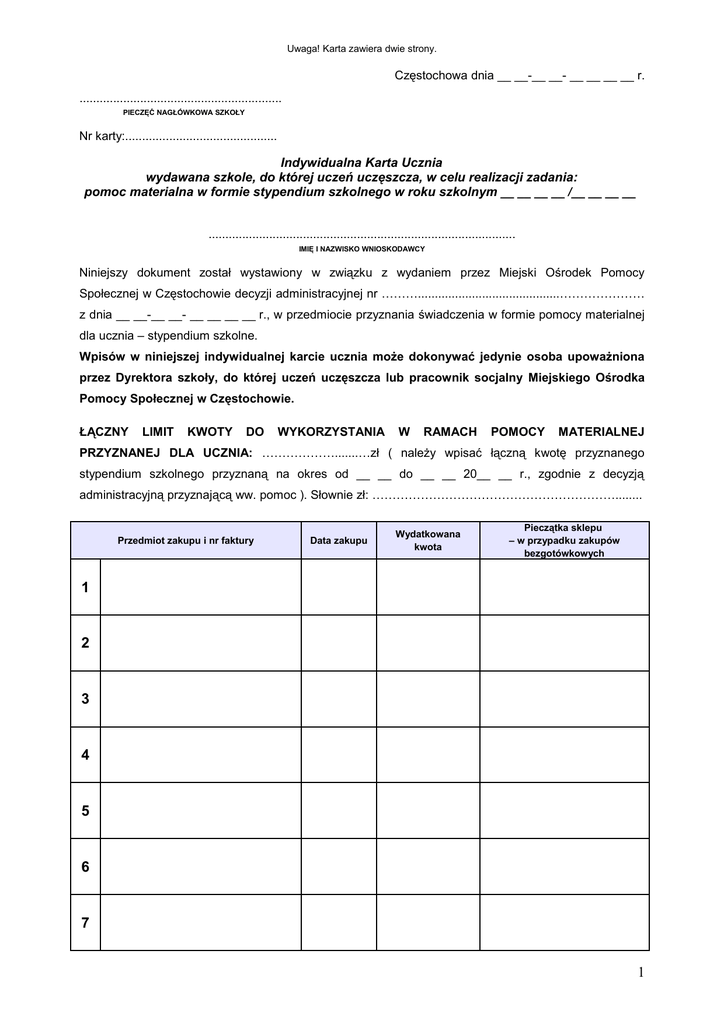 Uwaga! Karta zawiera dwie strony. Częstochowa dnia __ __-__ __- __ __ __ __ r. ............................................................ PIECZĘĆ NAGŁÓWKOWA SZKOŁY Nr karty:............................................. Indywidualna Karta Ucznia wydawana szkole, do której uczeń uczęszcza, w celu realizacji zadania: pomoc materialna w formie stypendium szkolnego w roku szkolnym __ __ __ __ /__ __ __ __ ........................................................................................... IMIĘ I NAZWISKO WNIOSKODAWCY Niniejszy dokument został wystawiony w związku z wydaniem przez Miejski Ośrodek Pomocy Społecznej w Częstochowie decyzji administracyjnej nr ………..........................................………………… z dnia __ __-__ __- __ __ __ __ r., w przedmiocie przyznania świadczenia w formie pomocy materialnej dla ucznia – stypendium szkolne. Wpisów w niniejszej indywidualnej karcie ucznia może dokonywać jedynie osoba upoważniona przez Dyrektora szkoły, do której uczeń uczęszcza lub pracownik socjalny Miejskiego Ośrodka Pomocy Społecznej w Częstochowie. ŁĄCZNY LIMIT KWOTY DO WYKORZYSTANIA W RAMACH POMOCY MATERIALNEJ PRZYZNANEJ DLA UCZNIA: ……………….......…zł ( należy wpisać łączną kwotę przyznanego stypendium szkolnego przyznaną na okres od __ __ do __ __ 20__ __ r., zgodnie z decyzją administracyjną przyznającą ww. pomoc ). Słownie zł: ……………………………………………………........ Przedmiot zakupu i nr faktury Data zakupu Wydatkowana kwota Pieczątka sklepu – w przypadku zakupów bezgotówkowych 1 2 3 4 5 6 7 1 Uwaga! Karta zawiera dwie strony. 8 9 10 W przypadku dokonywania zakupów bezgotówkowych, wpisów należy dokonywać bezpośrednio w chwili dokonania zakupu. Wpis stanowi formę potwierdzenia, akceptacji racjonalności i zasadności zakupu. Niniejszy dokument gwarantuje, że uczeń otrzymał pomoc materialną o charakterze socjalnym, na podstawie ustawy o systemie oświaty oraz Uchwały Nr 731/XL/2013 Rady Miasta Częstochowy z dnia 11 lipca 2013 r. w sprawie uchwalenia regulaminu udzielania pomocy materialnej o charakterze socjalnym dla uczniów zamieszkałych na terenie Gminy Częstochowa i Uchwały Nr 757/XLII/2013 Rady Miasta Częstochowy z dnia 30.09.2013 r. w sprawie zmiany Uchwały Nr 731/XL/2013 Rady Miasta Częstochowy z dnia 11.07.2013 r. w sprawie uchwalenia regulaminu udzielania pomocy materialnej o charakterze socjalnym dla uczniów zamieszkałych na terenie Gminy Częstochowa. Ponadto niniejszy dokument gwarantuje, że zakupione materiały edukacyjne zostaną zrefundowane, czyli opłacone przez Miejski Ośrodek Pomocy Społecznej w Częstochowie, o ile ich zakup został zaakceptowany w niniejszym dokumencie oraz doręczono ( niezwłocznie, czyli w terminie do 3. dni od daty dokonania zakupów bezgotówkowych ) do Miejskiego Ośrodka Pomocy Społecznej w Częstochowie prawidłowo wystawioną/wystawiony fakturę/rachunek zawierającą/zawierający potwierdzenie akceptacji i numer „Indywidualnej Karty Ucznia” wskazany w nagłówku tego pisma. Dodatkowe pouczenie: 1. Rodzice/opiekunowie prawni wraz z uczniem lub pełnoletni uczeń, samodzielnie wybierają sklep, w którym chcą dokonać zakupu materiałów edukacyjnych ( w przypadku dokonywania zakupów bezgotówkowych – rodzice/opiekunowie prawni wraz z uczniem lub pełnoletni uczeń samodzielnie wybierają sklep z listy punktów handlowo-usługowych, które podjęły się współpracy z Miejskim Ośrodkiem Pomocy Społecznej w Częstochowie, zgodnie z przesłanym do rodziców/opiekunów prawnych i pełnoletnich uczniów oraz do szkół wykazem, na zasadach określonych i przedstawionych w pismach przesłanych do szkół ). 2. Rodzice/opiekunowie prawni/pełnoletni uczniowie zakupów bezgotówkowych dokonują wraz z pedagogiem szkolnym lub innym pracownikiem szkoły wskazanym przez Dyrektora Szkoły ( posiadającym imienne upoważnienie od Dyrektora szkoły, do której uczeń uczęszcza ), czy też z pracownikiem socjalnym MOPS ( posiadającym imienne upoważnienie od Dyrektora MOPS ). 3. Rodzice/opiekunowie prawni/pełnoletni uczniowie w ramach dokonywanych zakupów bezgotówkowych wybierają potrzebne artykuły, ale muszą uzyskać akceptację pedagoga szkolnego lub innego pracownika szkoły wskazanym przez Dyrektora Szkoły, czy też pracownika socjalnego MOPS, obecnego podczas zakupów, na zakup tych konkretnych materiałów edukacyjnych. 4. Sprzedawca wystawia fakturę/rachunek na nabywców, czyli na rodzica/opiekuna prawnego lub pełnoletniego ucznia; faktury/rachunki dostarczane są do MOPS przez właściwe szkoły. 5. Płatność za dokonane przez ucznia zakupy następuje z konta MOPS w terminie do 30. dni od daty dokonani zakupu. Zakupione artykuły wymienione na fakturach są zgodne z wykazem wydatków refundowanych w ramach przyznanego stypendium szkolnego na rok szkolny __ __ __ __ /__ __ __ __. Akceptuję dokonane zakupy. ............................................................ (pieczęć i podpis Dyrektora szkoły lub osoby przez niego upoważnionej) 2