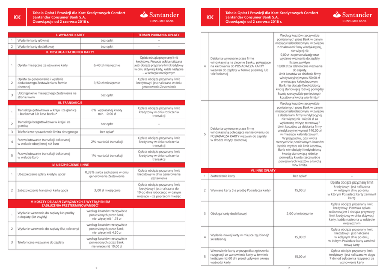 KK Tabela Opłat i Prowizji dla Kart Kredytowych Comfort Santander Consumer Bank S.A. Obowiązuje od 2 czerwca 2016 r. I. WYDANIE KARTY KK Tabela Opłat i Prowizji dla Kart Kredytowych Comfort Santander Consumer Bank S.A. Obowiązuje od 2 czerwca 2016 r. TERMIN POBRANIA OPŁATY 1 Wydanie karty głównej bez opłat – 2 Wydanie karty dodatkowej bez opłat – Działania wykonane przez firmę windykacyjną na zlecenie Banku, polegające na kierowaniu do POSIADACZA KARTY wezwań do zapłaty w formie pisemnej lub telefonicznej Według kosztów rzeczywiście poniesionych przez Bank w danym miesiącu kalendarzowym, w związku z działaniami firmy windykacyjnej, nie więcej niż: 9,00 zł za personalizację oraz wysłanie wezwania do zapłaty listem zwykłym 19,00 zł za telefoniczne wezwanie do zapłaty. Limit kosztów za działania firmy windykacyjnej wynosi 50,00 zł w miesiącu kalendarzowym. Bank nie obciąży Kredytobiorcy kwotą stanowiącą różnicę pomiędzy kwotą rzeczywiście poniesionych kosztów a kwotą w/w limitu.2 5 Działania wykonane przez firmę windykacyjną polegające na kierowaniu do POSIADACZA KARTY wezwań do zapłaty w drodze wizyty terenowej Według kosztów rzeczywiście poniesionych przez Bank w danym miesiącu kalendarzowym, w związku z działaniami firmy windykacyjnej nie więcej niż 140,00 zł za wykonaną wizytę terenową.3 Limit kosztów za działania firmy windykacyjnej wynosi 140,00 zł w miesiącu kalendarzowym. W przypadku, gdy kwota rzeczywiście poniesionych kosztów będzie wyższa niż limit kosztów, Bank nie obciąży Kredytobiorcy kwotą stanowiącą różnicę pomiędzy kwotą rzeczywiście poniesionych kosztów a kwotą w/w limitu. 1 Zastrzeżenie karty II. OBSŁUGA RACHUNKU KARTY 1 Opłata miesięczna za używanie karty 6,40 zł miesięcznie Opłata obciąża przyznany limit kredytowy. Pierwsza opłata naliczana jest i obciąża przyznany limit kredytowy w dniu aktywacji karty, każda następna – w odstępie miesięcznym 2 Opłata za generowanie i wysłanie dodatkowego Zestawienia w formie pisemnej 3,50 zł miesięcznie Opłata obciąża przyznany limit kredytowy i jest naliczana w dniu generowania Zestawienia 3 Udostępnienie miesięcznego Zestawienia na stronie www 4 bez opłat III. TRANSAKCJE 6% wypłacanej kwoty min. 10,00 zł Opłata obciąża przyznany limit kredytowy w dniu rozliczenia transakcji Transakcja bezgotówkowa w kraju i za granicą bez opłat – 3 Telefoniczne sprawdzenie limitu dostępnego bez opłat5 – 4 Przewalutowanie transakcji dokonanej w walucie obcej innej niż Euro 2% wartości transakcji Opłata obciąża przyznany limit kredytowy w dniu rozliczenia transakcji 5 Przewalutowanie transakcji dokonanej w walucie Euro 1% wartości transakcji Opłata obciąża przyznany limit kredytowy w dniu rozliczenia transakcji 0,33% salda zadłużenia w dniu generowania Zestawienia Opłata obciąża przyznany limit kredytowy w dniu generowania Zestawienia 1 Transakcja gotówkowa w kraju i za granicą – bankomat lub kasa banku* 2 IV. UBEZPIECZENIE I INNE 1 2 Ubezpieczenie spłaty kredytu opcja7 Zabezpieczenie transakcji kartą opcja 3,00 zł miesięcznie Opłata obciąża przyznany limit kredytowy i jest naliczana do 10-go dnia roboczego w danym miesiącu – za poprzedni miesiąc VI. INNE OPŁATY 2 bez opłat5 – 15,00 zł Opłata obciąża przyznany limit kredytowy i jest naliczana w kolejnym dniu po dniu, w którym Posiadacz karty zamówił kartę 2,00 zł miesięcznie Opłata obciąża przyznany limit kredytowy. Pierwsza opłata naliczana jest i obciąża przyznany limit kredytowy w dniu aktywacji karty, każda następna w odstępie miesięcznym Wymiana karty (na prośbę Posiadacza karty) V. KOSZTY DZIAŁAŃ ZWIĄZANYCH Z WYSTĄPIENIEM ZADŁUŻENIA PRZETERMINOWANEGO1 1 Wysłanie wezwania do zapłaty lub prośby o dopłatę (list zwykły) według kosztów rzeczywiście poniesionych przez Bank, nie więcej niż 1,75 zł 2 Wysłanie wezwania do zapłaty (list polecony) według kosztów rzeczywiście poniesionych przez Bank, nie więcej niż 4,20 zł 3 Telefoniczne wezwanie do zapłaty według kosztów rzeczywiście poniesionych przez Bank, nie więcej niż 10,00 zł 1 3 Obsługa karty dodatkowej 4 Wydanie nowej karty w miejsce zgubionej/ skradzionej 15,00 zł Opłata obciąża przyznany limit kredytowy i jest naliczana w kolejnym dniu po dniu, w którym Posiadacz karty zamówił nową kartę 5 Wznowienie karty w przypadku zgłoszenia rezygnacji ze wznowienia karty w terminie krótszym niż 60 dni przed upływem okresu ważności karty 15,00 zł Opłata obciąża przyznany limit kredytowy i jest naliczana w ciągu 7 dni od zgłoszenia rezygnacji ze wznowienia karty 2 KK Tabela Opłat i Prowizji dla Kart Kredytowych Comfort Santander Consumer Bank S.A. Obowiązuje od 2 czerwca 2016 r. KK 6 Odblokowanie karty po trzykrotnym kolejnym wprowadzeniu błędnego numeru PIN 10,00 zł Opłata obciąża przyznany limit kredytowy i jest naliczana dzień po odblokowaniu karty 7 Sporządzenie kopii miesięcznego Zestawienia z rachunku karty na prośbę Posiadacza karty 5,00 zł Opłata obciąża przyznany limit kredytowy i jest naliczana w ciągu 7 dni od sporządzenia kopii miesięcznego Zestawiania 8 Sporządzenie kopii dokumentu bankowego 25,00 zł4 9 Sporządzenie opinii bankowej 25,00 zł4 10 Sporządzenie zaświadczenia bankowego 25,00 zł4 15,00 zł Opłata obciąża przyznany limit kredytowy i jest naliczana w ciągu 7 dni od sporządzenia przez Bank kopii rachunku potwierdzającego transakcję Telefoniczna informacja o dokonanych transakcjach bez opłat5 – 13 Zmiana wysokości przyznanego limitu kredytowego na prośbę Klienta 10,00 zł Opłata obciąża przyznany limit kredytowy i jest naliczana w ciągu 7 dni po realizacji dyspozycji Posiadacza karty 14 Uruchomienie planu spłat ratalnych 2% wartości transakcji6 Opłata obciąża przyznany limit kredytowy i jest naliczana w ciągu 7 dni po dniu, w którym został uruchomio