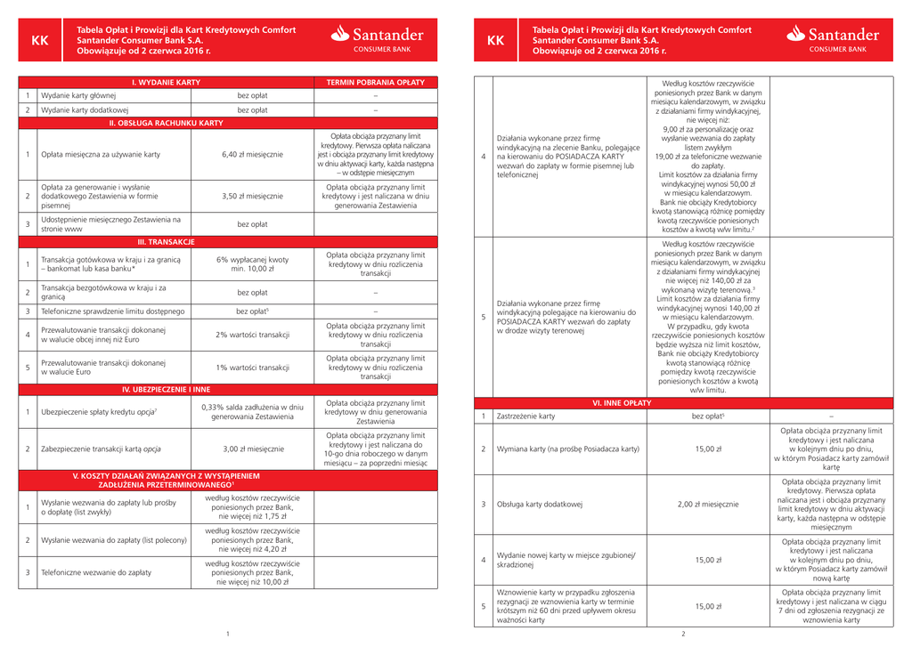 Tabela Opłat i Prowizji dla Kart Kredytowych Comfort Santander