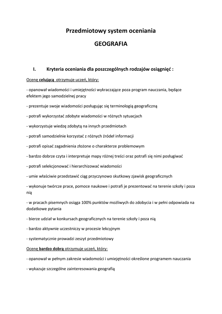 Przedmiotowy system oceniania GEOGRAFIA I. Kryteria oceniania dla poszczególnych rodzajów osiągnięć : Ocenę celującą otrzymuje uczeń, który: - opanował wiadomości i umiejętności wykraczające poza program nauczania, będące efektem jego samodzielnej pracy - prezentuje swoje wiadomości posługując się terminologią geograficzną - potrafi wykorzystać zdobyte wiadomości w różnych sytuacjach - wykorzystuje wiedzę zdobytą na innych przedmiotach - potrafi samodzielnie korzystać z różnych źródeł informacji - potrafi opisać zagadnienia złożone o charakterze problemowym - bardzo dobrze czyta i interpretuje mapy różnej treści oraz potrafi się nimi posługiwać - potrafi selekcjonować i hierarchizować wiadomości - umie właściwie przedstawić ciąg przyczynowo skutkowy zjawisk geograficznych - wykonuje twórcze prace, pomoce naukowe i potrafi je prezentować na terenie szkoły i poza nią - w pracach pisemnych osiąga 100% punktów możliwych do zdobycia i w pełni odpowiada na dodatkowe pytania - bierze udział w konkursach geograficznych na terenie szkoły i poza nią - bardzo aktywnie uczestniczy w procesie lekcyjnym - systematycznie prowadzi zeszyt przedmiotowy Ocenę bardzo dobrą otrzymuje uczeń, który: - opanował w pełnym zakresie wiadomości i umiejętności określone programem nauczania - wykazuje szczególne zainteresowania geografią - potrafi stosować zdobytą wiedzę do samodzielnego rozwiązywania problemów w sytuacjach typowych - bez pomocy nauczyciela korzysta z różnych źródeł informacji - potrafi samodzielnie interpretować zjawiska geograficzne oraz bronić swoich poglądów - właściwie interpretuje mapy różnej treści - prezentuje swoją wiedzę posługując się poprawną terminologią geograficzną - aktywnie uczestniczy w procesie lekcyjnym - systematycznie prowadzi zeszyt przedmiotowy Ocenę dobrą otrzymuje uczeń, który: - rozwiązuje typowe problemy z wykorzystaniem poznanych metod - opanował wiadomości i umiejętności bardziej złożone i mniej przystępne, przydatne i użyteczne w szkolnej i pozaszkolnej działalności - potrafi stosować zdobytą wiedzę do samodzielnego rozwiązywania problemów - prawidłowo czyta mapy różnej treści - udziela poprawnych odpowiedzi na typowe pytania - jest aktywny na lekcji - systematycznie prowadzi zeszyt przedmiotowy Ocenę dostateczną otrzymuje uczeń, który: - opanował wiadomości i umiejętności przystępne i niezbyt złożone - z pomocą nauczyciela rozwiązuje podstawowe problemy o małym stopniu trudności - z pomocą nauczyciela korzysta z takich źródeł wiedzy jak słowniki, encyklopedie, mapy, tablice i wykresy itp. - wykazuje się aktywnością na lekcji w stopniu zadowalającym - analizuje proste zależności, a także próbuje porównywać, wnioskować i zajmować określone stanowisko - systematycznie prowadzi zeszyt przedmiotowy Ocenę dopuszczającą otrzymuje uczeń, który: - ma braki w opanowaniu wiadomości i umiejętności określonych programem, ale nie przekreślają one możliwości dalszego kształcenia - wykonuje proste zadania i polecenia o bardzo małym stopniu trudności pod kierunkiem nauczyciela - wiadomości przekazuje w sposób nieporadny, nie używając terminologii geograficznej - jest mało aktywny na lekcji - prowadzi zeszyt przedmiotowy Ocenę niedostateczną otrzymuje uczeń, który: - nie opanował wiadomości i umiejętności określanych podstawami programowymi koniecznymi do dalszego kształcenia - wykazuje się brakiem systematyczności w przyswajaniu wiedzy i wykonywaniu prac domowych - nie podejmuje próby rozwiązania zadań o elementarnym stopniu trudności nawet przy pomocy nauczyciela - wykazuje się bierną postawą na lekcji Uczeń ma prawo do poprawy oceny pisemnej i ustnej do 2 tygodni od daty jej uzyskania (wpisania do dziennika) Uczeń z prac pisemnych otrzymuje ocenę pozytywną ( dopuszczający ) jeżeli uzyska 40% punktów. II. Ocenie podlegają następujące formy aktywności ucznia : 1.Odpowiedzi ustne : - obejmują materiał zrealizowany na trzech ostatnich jednostkach lekcyjnych - odpowiedzi ustne oceniane są według kryteriów określonych w wymaganiach na poszczególne stopnie. Ponadto ocenia się umiejętność stosowania terminologii geograficznej, umiejętność wykorzystywania pomocy naukowych (mapa, plansza, model, schemat) samodzielność wypowiedzi. 2.Prace pisemne : - sprawdziany - kartkówki ( 10 do 15 min ) 3.Aktywność na lekcji 4.Praca w grupie : - ocenia się umiejętność komunikowania się i współpracy w zespole, korzystania z różnych źródeł informacji, efektywność, stopień zaangażowania. 5.Prace domowe : - ocenia się poprawność rzeczową, estetykę, umiejętność prezentacji 6.Aktywnośćpozalekcyjna : Poziom szkolny: - wyniki najwyższe ( 3 pierwsze miejsca – cząstkowa ocena celująca ) - wyniki na poziomie wyższym niż przeciętny – ocena bardzo dobra Poziom pozaszkolny - awans do następnego etapu – cząstkowa ocena celująca - udział w eliminacjach wojewódzkich – cząstkowa ocena celująca - zdobycie tytułu laureata- ocena celująca na koniec roku szkolnego III. Sposób ustalania oceny semestralnej i końcoworocznej: Przy ustalaniu oceny semestralnej lub końcowo rocznej nauczyciel bierze pod uwagę oceny ucznia uzyskane z poszczególnych obszarów działalności według następującej kolejności: - sprawdziany - kartkówki - odpowiedzi ustne - aktywność na zajęciach - aktywność pozalekcyjna - prace domowe IV. Sposoby informowania uczniów i rodziców. - zapoznanie uczniów z przedmiotowym systemem oceniania następuje na pierwszej godzinie lekcyjnej - oceny cząstkowe są jawne, oparte o opracowane kryteria - ocenione sprawdziany i kartkówki uczniowie i rodzice mogą otrzymać do wglądu - prace pisemne są przechowywane w szkole do końca bieżącego roku szkolnego.
