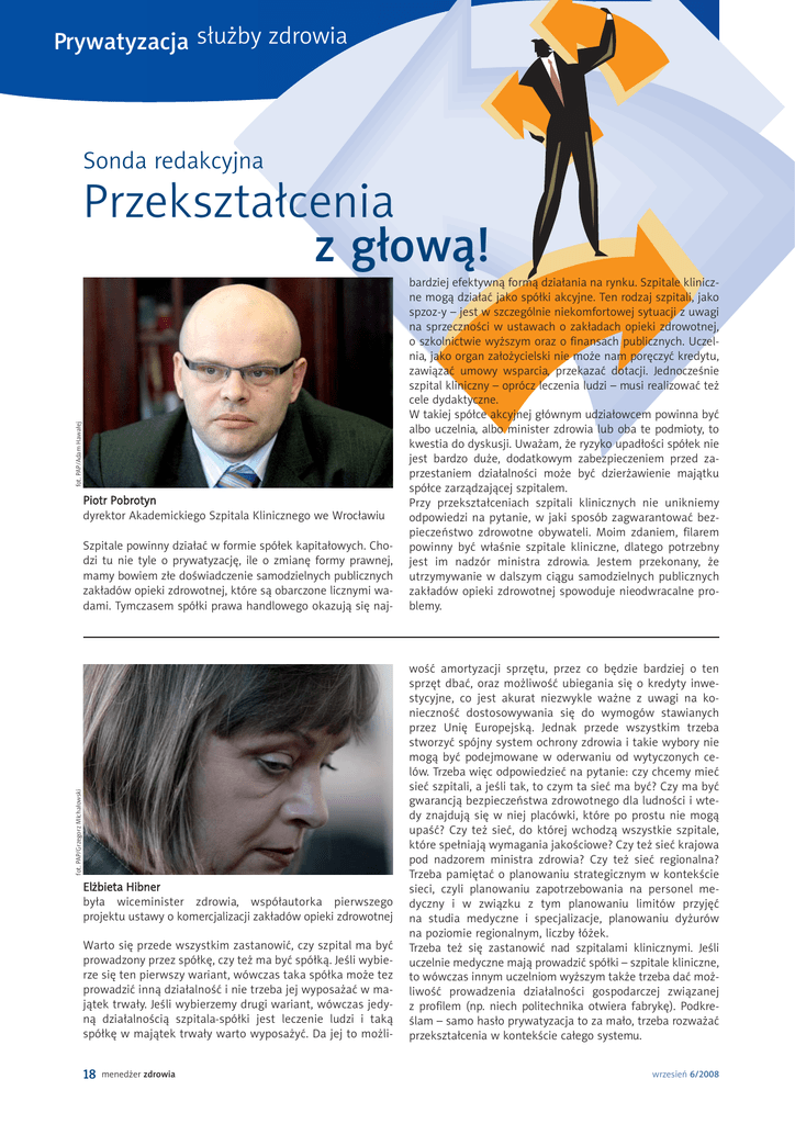 Prywatyzacja służby zdrowia Sonda redakcyjna fot. PAP/Adam Hawałej Przekształcenia z głową! Piotr Pobrotyn dyrektor Akademickiego Szpitala Klinicznego we Wrocławiu fot. PAP/Grzegorz MIchałowski Szpitale powinny działać w formie spółek kapitałowych. Chodzi tu nie tyle o prywatyzację, ile o zmianę formy prawnej, mamy bowiem złe doświadczenie samodzielnych publicznych zakładów opieki zdrowotnej, które są obarczone licznymi wadami. Tymczasem spółki prawa handlowego okazują się naj- Elżbieta Hibner była wiceminister zdrowia, współautorka pierwszego projektu ustawy o komercjalizacji zakładów opieki zdrowotnej Warto się przede wszystkim zastanowić, czy szpital ma być prowadzony przez spółkę, czy też ma być spółką. Jeśli wybierze się ten pierwszy wariant, wówczas taka spółka może tez prowadzić inną działalność i nie trzeba jej wyposażać w majątek trwały. Jeśli wybierzemy drugi wariant, wówczas jedyną działalnością szpitala-spółki jest leczenie ludzi i taką spółkę w majątek trwały warto wyposażyć. Da jej to możli- 18 menedżer zdrowia bardziej efektywną formą działania na rynku. Szpitale kliniczne mogą działać jako spółki akcyjne. Ten rodzaj szpitali, jako spzoz-y – jest w szczególnie niekomfortowej sytuacji z uwagi na sprzeczności w ustawach o zakładach opieki zdrowotnej, o szkolnictwie wyższym oraz o finansach publicznych. Uczelnia, jako organ założycielski nie może nam poręczyć kredytu, zawiązać umowy wsparcia, przekazać dotacji. Jednocześnie szpital kliniczny – oprócz leczenia ludzi – musi realizować też cele dydaktyczne. W takiej spółce akcyjnej głównym udziałowcem powinna być albo uczelnia, albo minister zdrowia lub oba te podmioty, to kwestia do dyskusji. Uważam, że ryzyko upadłości spółek nie jest bardzo duże, dodatkowym zabezpieczeniem przed zaprzestaniem działalności może być dzierżawienie majątku spółce zarządzającej szpitalem. Przy przekształceniach szpitali klinicznych nie unikniemy odpowiedzi na pytanie, w jaki sposób zagwarantować bezpieczeństwo zdrowotne obywateli. Moim zdaniem, filarem powinny być właśnie szpitale kliniczne, dlatego potrzebny jest im nadzór ministra zdrowia. Jestem przekonany, że utrzymywanie w dalszym ciągu samodzielnych publicznych zakładów opieki zdrowotnej spowoduje nieodwracalne problemy. wość amortyzacji sprzętu, przez co będzie bardziej o ten sprzęt dbać, oraz możliwość ubiegania się o kredyty inwestycyjne, co jest akurat niezwykle ważne z uwagi na konieczność dostosowywania się do wymogów stawianych przez Unię Europejską. Jednak przede wszystkim trzeba stworzyć spójny system ochrony zdrowia i takie wybory nie mogą być podejmowane w oderwaniu od wytyczonych celów. Trzeba więc odpowiedzieć na pytanie: czy chcemy mieć sieć szpitali, a jeśli tak, to czym ta sieć ma być? Czy ma być gwarancją bezpieczeństwa zdrowotnego dla ludności i wtedy znajdują się w niej placówki, które po prostu nie mogą upaść? Czy też sieć, do której wchodzą wszystkie szpitale, które spełniają wymagania jakościowe? Czy też sieć krajowa pod nadzorem ministra zdrowia? Czy też sieć regionalna? Trzeba pamiętać o planowaniu strategicznym w kontekście sieci, czyli planowaniu zapotrzebowania na personel medyczny i w związku z tym planowaniu limitów przyjęć na studia medyczne i specjalizacje, planowaniu dyżurów na poziomie regionalnym, liczby łóżek. Trzeba też się zastanowić nad szpitalami klinicznymi. Jeśli uczelnie medyczne mają prowadzić spółki – szpitale kliniczne, to wówczas innym uczelniom wyższym także trzeba dać możliwość prowadzenia działalności gospodarczej związanej z profilem (np. niech politechnika otwiera fabrykę). Podkreślam – samo hasło prywatyzacja to za mało, trzeba rozważać przekształcenia w kontekście całego systemu. wrzesień 6/2008 fot. archiwum fot. PAP/Adam Hawałej Krzysztof Tuczapski dyrektor niepublicznego szpitala samorządowego w Zamościu Jerzy Gryglewicz dyrektor ds. klinicznych Instytutu Reumatologii w Warszawie fot. PJakub Ostalowski/Fotorzepa Masowe przekształcenia w ochronie zdrowia trzeba prowadzić z wielkim namysłem. Uważam, że zanim nastąpią ruchy prywatyzacyjne, powinna być 2–3-letnia przejściowa karencja – czyli najpierw szpitale powinny zostać skomercjalizowane, a może przekształcone w spółki komunalne. Ten okres jest potrzebny do tego, by po pierwsze – wycenić rynkową wartość majątku takiej spółki, a po drugie – ocenić, jaki jest jej potencjał. Ważne są też gwarancje ciągłości działalności leczniczej. Trzeba też zastanowić się nad szerokim zastosowaniem partnerstwa publiczno-prywatnego. Jeśli chodzi o jednostki badawczo-rozwojowe, to mają one nieco odmienne cele działania niż szpitale samorządowe. Prowadzenie działalności naukowo-badawczej i dydaktycznej praktycznie uniemożliwia ich prywatyzację. Wiktor Masłowski dyrektor Szpitala Attis w Warszawie Wszystkich szpitali nie da się sprywatyzować. Powinno się jednak zmienić formę organizacyjną szpitali z samodziel- wrzesień 6/2008 Pewne jest, że samodzielny publiczny zakład opieki zdrowotnej to twór przebrzmiały i powinien zniknąć. Opowiadam się za rozwiązaniami przyjętymi w projekcie ustawy o zakładach opieki zdrowotnej. Uważam, że spółki powinny być wyposażone w majątek trwały, inaczej trudno im będzie pozyskiwać środki inwestycyjne z zewnątrz. Uważam, że samorząd powinien aportem przekazać majątek do nowej spółki, dzięki czemu też będzie mógł pobierać podatek od nieruchomości. Nie ma niebezpieczeństwa, że zamiast szpitala powstanie na jego miejscu przysłowiowy aquapark, bo samorząd ma obowiązek zapewnić swoim mieszkańcom opiekę zdrowotną. Zatem w jego interesie będzie dbałość o to, by wybrać odpowiednich inwestorów. Szpital będący spółką, to duże bezpieczeństwo