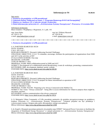 Informacja nr 54 06.08.04 Spis treści: 1. Partnerzy do projektów w 6.PR poszukiwani 2. Założenia Debaty Publicznej na temat „7. Programu Ramowego B+R Unii Europejskiej” 3. Biuletyn nt. funduszy UE w zakresie energii i środowiska 4. Dzień informacyjny priorytetu 6.1. „Zrównoważone Systemy Energetyczne”, Warszawa, 14 września 2004 Informacje przekazuje: Biuro Grantów i Współpracy z Regionem, A-1, pok. 141 mgr Anna Hałas tel: 320-21-76 e-mail: [email protected] mgr inż. Elżbieta Mazurek tel. 320-28-46 e-mail: [email protected] 1. Partnerzy do projektów w 6.PR poszukiwani 1. 1. PARTNER SEARCH ID: HU20 DATE: 02/08/04 CALL: IST Call 3 RESEARCH PRIORITY: Research Addressing Societal Challenges STRATEGIC OBJECTIVE: 2.3.6.1 To stimulate, encourage, facilitate the participation of organisations from NMS and ACC in the activities of IST EVALUATION SCHEME: One-step DEADLINE: 22/09/2004 TYPE OF PROJECT: SSA PROPOSAL NAME: R&D collaboration portal in NMS and ACC SUBJECT: Development of a collaboration portal Broadcasting, events & workshops, promoting, communication KEYWORDS: SME, development, database, portal, website FURTHER INFO: http://www.ideal-ist.net/view.php?id=HU20 1. 2. PARTNER SEARCH ID: SE24 DATE: 07/07/04 CALL: IST Call 3 RESEARCH PRIORITY: Research Addressing Societal Challenges STRATEGIC OBJECTIVE: 2.3.6.2 To prepare for future international co-operation in IST EVALUATION SCHEME: One-step DEADLINE: 22/09/2004 TYPE OF PROJECT: SSA PROPOSAL NAME: PACIM - Preparing to be Always Connected in the Mobile City SUBJECT: Our vision: "Always connected" - being able to access information for whatever purpose there might be, anywhere, anytime. KEYWORDS: wireless communication wlan always connected FURTHER INFO: http://www.ideal-ist.net/view.php?id=SE24 1. 3. Metropole Urban Community of Lille poszukuje partnerów do projektu przygotowywanego na grudniowy konkurs Priorytetu 6.1. „Zrównoważone Systemy Energetyczne”. Tematem projektu ma być produkcja i wykorzystanie metanu i biogazu jako paliw dla pojazdow energo-oszczędnych. Bliższe informacje: http://www.6pr.pl/shownews.html?id=2598 1. 4. Zespół z Hiszpanii poszukuje partnerów do projektu typu STREP "Advanced Power Converters to facilitate the integration of Distributed Energy Resources" w ramach priorytetu 6.1. „Zrównoważone Systemy Energetyczne”. Bliższe informacje: http://www.6pr.pl/shownews.html?id=2600 1 1. 5. TRA - Koordynator z Chin poszukuje partnera do projektu „CHINA AND EUROPEAN (EU) COOPERATION PROJECT PROPOSAL”. Jest to projekt typu SSA. Będzie składany do konkursu z obszaru transportu, z datą zamknięcia 22 września 2004. Jego opis znajduje się tutaj: opis projektu. Jeśli projekt zainteresuje Państwa, proszę kontaktować się z Raffaella Pettorruso APRE - Agenzia per la Promozione della Ricerca Europea Piazza G. Marconi 25, 00144 Roma Tel. 06/5911817, Fax 06/5911908 E-mail: [email protected] Web: www.apre.it 1. 6. Partner Search, Second Call of the Galileo Joint Undertaking, Area 1, 2412 proposal. Special User Communities. GCT Iberica is currently coordinating a proposal to the above Call focussed on Location Services with Galileo for Elderly People. In this context, we have established a consortia. We have already covered almost all the roles and are willing to receive proposals of cooperation from EGNOS/Galileo receiver manufacturers that might be looking for trialling their components at personal devices. Should you be interested in participating in this proposal, please contact us at: [email protected] and we will study carefully your proposal of cooperation. GCT is a mobile location services provider, developing and operating location services for vehicles, persons, objects and animals. GCT location services are internet service provisioning infrastructure and proprietary technology of handheld and on onboard terminals for the mass market. Our terminals integrate today GPS receivers and wireless communications with the three GPRS operators in Spain. GCT centers his business in Europe although has just established agreements to open new location services in South America, Midde East and ChinaGCT has internal on going R&D activities in different technologies such as A-GPS, Cell-ID, EOTD, EGNOS and looks to test Galileo pre-technology into his terminals. In order you to know something more about our company.You can see the flash intro at our portal under development www.tekel.net. Apart from our skills on location service provisioning, we will be contributing too to the proposal preparation with our experience in evaluation processes at the European Commision. 2. Założenia Debaty Publicznej na temat „7. Programu Ramowego B+R Unii Europejskiej” Ministerstwo Nauki i Informatyzacji przedstawiło zarys debaty publicznej na temat 7. Programu Ramowego Okres trwania debaty: lipiec - wrzesień, 2004. Szczegóły w załączniku 1. 3. Biuletyn nt. funduszy UE w zakresie energii i środowiska. W załączniku 2 znajdą Państwo broszurę o wszystkich możliwościach wsparcia finansowego dzialań z funduszy UE w zakresie energii i środowiska. 4. Dzień informacyjny priorytetu 6.1. „Zrównoważone Systemy Energetyczne”, Warszawa, 14 września 2004 Dnia 14 września 2004 w IPPT PAN w Warszawie odbędzie się Dzień Informacyjny Priorytetu 6.1. Zrównoważone Systemy Energetyczne poświęcony najnowszym konkursom Priorytetu: FP6-2004-TREN-3 FP6-2004-HYDROGEN-1 FP6-2004-HYDROGEN-2 Ostateczny termin składania wniosków w ramach tych konkursów to 8 grudnia 2004. Osoby pragnące wziąć udział w spotkaniu prosimy o rejestrację on-line poprzez wypełnienie formularza zgłoszenia uczestnictwa, który znajduje sie na stronie: http://www.6pr.pl/hr/zapisy/159.html. Udział w spotkaniu jest bezpłatny. KONIEC 2