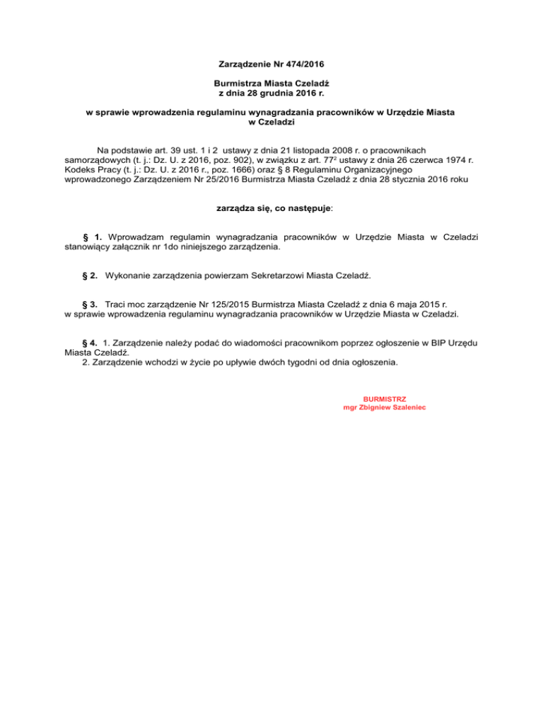 Zarządzenie Nr 474/2016 Burmistrza Miasta Czeladź z dnia 28