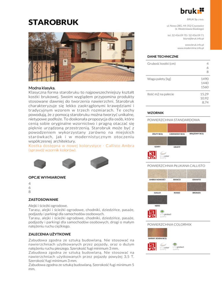 STAROBRUK BRUK Sp. z o.o. ul. Nowa 28G, 44-352 Czyzowice (k. Wodzislawia Slaskiego) tel. 32 456 09 70 / 32 456 09 71 [email protected] www.bruk.info.pl www.modernline.info.pl DANE TECHNICZNE Grubość kostki (cm) Modna klasyka. Klasyczna forma starobruku to najpowszechniejszy kształt kostki brukowej. Swoim wyglądem przypomina produkty stosowane dawniej do tworzenia nawierzchni. Starobruk charakteryzuje się lekko zaokrąglonymi krawędziami i tradycyjnym wzorem w trzech rozmiarach. Te cechy powodują, że z pomocą starobruku można tworzyć unikalne, nietypowe podłoże. To doskonała propozycja dla osób, które cenią sobie oryginalne wzornictwo i pragną otaczać się pięknie urządzoną przestrzenią. Starobruk może być z powodzeniem wykorzystany zarówno na miejskich starówkach, jak i w modernistycznym otoczeniu współczesnej architektury. Kostka dostępna w nowej kolorystyce - Callisto Ambra (sprawdź wzornik kolorów). 4 6 8 Waga palety [kg] 1490 1440 1560 Ilość m2 na palecie 15,29 10,92 8,74 WZORNIK POWIERZCHNIA STANDARDOWA ŻÓŁTY BCQ CZERWONY BCQ SZARY GRAFIT BRĄZOWY BCQ POWIERZCHNIA PŁUKANA CALLISTO OPCJE WYMIAROWE 4 6 8 AMBRA NOWOŚĆ! BIANCO GRANITO GIALLO ROSSO BRONZO ZASTOSOWANIE Alejki i ścieżki ogrodowe. Tarasy, alejki i ścieżki ogrodowe, chodniki, dziedzińce, pasaże, podjazdy i parkingi dla samochodów osobowych. Tarasy, alejki i ścieżki ogrodowe, chodniki, dziedzińce, pasaże, podjazdy i parkingi dla samochodów osobowych, drogi o małym natężeniu ruchu ciężkiego. NERO POWIERZCHNIA COLORMIX ZALECENIA UŻYTKOWE Zabudowa zgodna ze sztuką budowlaną. Nie stosować na nawierzchniach użytkowanych przez pojazdy, oraz o dużym natężeniu ruchu pieszego. Szerokość fugi minimum 3 mm. Zabudowa zgodna ze sztuką budowlaną. Nie stosować na nawierzchniach użytkowanych przez pojazdy powyżej 3,5 T. Szerokość fugi minimum 3 mm. Zabudowa zgodna ze sztuką budowlaną. Szerokość fugi minimum 5 mm. BARWY JESIENI BCQ CECHY SZCZEGÓLNE Kostka o płaskiej powierzchni licowej zabezpieczonej wokół obwodu zaokrągloną fazą. Brak odstępników dystansowych. Wzór składa się z 3 elementów pakowanych łącznie. Kostka o płaskiej powierzchni licowej zabezpieczonej wokół obwodu zaokrągloną fazą. Brak odstępników dystansowych. Wzór składa się z 3 elementów pakowanych łącznie. Kostka o płaskiej powierzchni licowej zabezpieczonej wokół obwodu zaokrągloną fazą. Brak odstępników dystansowych. Wzór składa się z 3 elementów pakowanych łącznie. Zobacz ten produkt online w swoim smartfonie