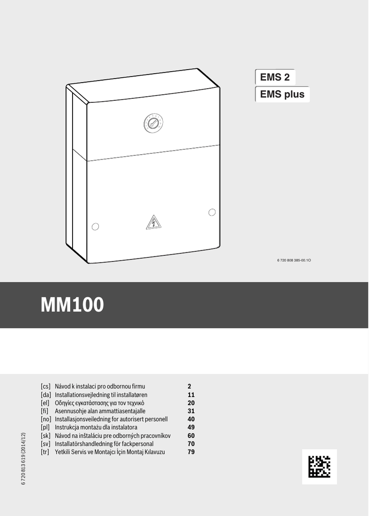 EMS 2 EMS plus 44 33 22 11 00 55 66 77 88 99 10 10 6 720 808 385-00.1O 6 720 813 619 (2014/12) MM100 [cs] [da] [el] [fi] [no] [pl] [sk] [sv] [tr] Návod k instalaci pro odbornou firmu Installationsvejledning til installatøren Οδηγίες εγκατάστασης για τον τεχνικό Asennusohje alan ammattiasentajalle Installasjonsveiledning for autorisert personell Instrukcja montażu dla instalatora Návod na inštaláciu pre odborných pracovníkov Installatörshandledning för fackpersonal Yetkili Servis ve Montajcı İçin Montaj Kılavuzu 2 11 20 31 40 49 60 70 79 Spis treści | 49 Spis treści 1 Objaśnienie symboli i wskazówki dotyczące bezpieczeństwa 1 Objaśnienie symboli i wskazówki dotyczące bezpieczeństwa . . . . . . . . . . . . . . . . . . . . . . . . . . . . . . .49 1.1 Objaśnienie symboli . . . . . . . . . . . . . . . . . . . . . . . 49 1.2 Ogólne wskazówki dotyczące bezpieczeństwa . . 49 1.1 Objaśnienie symboli 2 Dane produktu . . . . . . . . . . . . . . . . . . . . . . . . . . . . . . . 2.1 Ważne wskazówki dot. zastosowania . . . . . . . . . 2.2 Zakres dostawy . . . . . . . . . . . . . . . . . . . . . . . . . . . 2.3 Dane techniczne . . . . . . . . . . . . . . . . . . . . . . . . . . 2.4 Czyszczenie i konserwacja . . . . . . . . . . . . . . . . . . 2.5 Osprzęt uzupełniający . . . . . . . . . . . . . . . . . . . . . 50 51 51 52 52 52 3 Instalacja . . . . . . . . . . . . . . . . . . . . . . . . . . . . . . . . . . . . 53 3.1 Przygotowanie do instalacji na urządzeniu grzewczym . . . . . . . . . . . . . . . . . . . . . . . . . . . . . . .53 3.2 Montaż . . . . . . . . . . . . . . . . . . . . . . . . . . . . . . . . . 53 3.3 Podłączenie elektryczne . . . . . . . . . . . . . . . . . . . 53 3.3.1 Podłączenie połączenia magistrali BUS i czujnika temperatury (strona napięcia bardzo niskiego) . . . . . . . . . . . . . . . . . . . . . . . . . .53 3.3.2 Przyłącze napięcia zasilającego, pompy, zaworu mieszającego i termostatu temperatury maksymalnej (strona napięcia sieciowego) . . . .54 3.3.3 Schemat obsadzenia zacisków przyłączeniowych . . . . . . . . . . . . . . . . . . . . . . . . .55 3.3.4 Schematy połączeń z przykładami instalacji . . . 56 Wskazówki ostrzegawcze Wskazówki ostrzegawcze oznaczono w tekście trójkątem ostrzegawczym. Dodatkowo wyrazy te oznaczają rodzaj i ciężar gatunkowy następstw zaniechania działań zmierzających do uniknięcia zagrożenia. Zdefiniowane zostały następujące wyrazy ostrzegawcze używane w niniejszym dokumencie: • WSKAZÓWKA oznacza ryzyko wystąpienia szkód materialnych. • OSTROŻNOŚĆ oznacza ryzyko wystąpienia obrażeń ciała o stopniu lekkim lub średnim. • OSTRZEŻENIE oznacza ryzyko wystąpienia ciężkich obrażeń ciała lub nawet zagrożenie życia. • NIEBEZPIECZEŃSTWO oznacza ryzyko wystąpienia obrażeń ciała zagrażających życiu. Ważne informacje Ważne informacje, które nie zawierają ostrzeżeń przed zagrożeniami dotyczącymi osób lub mienia, oznaczono symbolem znajdującym się obok. Inne symbole 4 Uruchomienie . . . . . . . . . . . . . . . . . . . . . . . . . . . . . . . . 57 4.1 Ustawienie przełącznika kodującego . . . . . . . . . 57 4.2 Uruchomienie instalacji i modułu . . . . . . . . . . . . 57 4.2.1 Ustawienia obiegu grzewczego . . . . . . . . . . . . . .57 4.2.2 Ustawienia obiegu ładowania zasobnika . . . . . . 57 5 Usuwanie usterek . . . . . . . . . . . . . . . . . . . . . . . . . . . . . 58 Symbol Znaczenie ▶ Czynność Odsyłacz do innych fragmentów dokumentu • Pozycja/wpis na liście – Pozycja/wpis na liście (2. poziom) Tab. 1 1.2 6 Ochrona środowiska/utylizacja . . . . . . . . . . . . . . . . . 59 Ogólne wskazówki dotyczące bezpieczeństwa Niniejsza instrukcja montażu adresowana jest do monterów instalacji wodnych oraz urządzeń grzewczych i elektrotechnicznych. ▶ Przed rozpoczęciem montażu należy przeczytać instrukcje montażu (urządzeń grzewczych, modułów itp.). ▶ Postępować zgodnie ze wskazówkami dotyczącymi bezpieczeństwa oraz ostrzegawczymi. MM100 6 720 813 619 (2014/12) 50 | Dane produktu ▶ Przestrzegać odpowiednich przepisów oraz zasad i wytycznych stanowionych na szczeblu krajowym i regionalnym. ▶ Wykonane prace należy udokumentować. Użycie zgodne z przeznaczeniem ▶ Produkt przeznaczony jest wyłącznie do regulacji instalacji ogrzewczych w domach jedno- i wielorodzinnych. ▶ Instalację należy zawsze pozostawiać włączoną z uwagi na dodatkowe funkcje, np. przygotowanie c.w.u. lub zabezpieczenie przed blokadą. ▶ Niezwłocznie usuwać usterki. 2 Dane produktu Jakiekolwiek inne użytkowanie uważane jest za niezgodne z przeznaczeniem. Szkody powstałe w wyniku takiego stosowania są wyłączone z odpowiedzialności producenta. Obieg grzewczy, obieg grzewczy stałotemperaturowy i obieg chłodzenia nazywane są w dalszej części instrukcji ogólnie obiegiem grzewczym. Montaż, uruchomienie i konserwacja Montaż, uruchomienie i konserwację może wykonywać tylko uprawniona firma instalacyjna. ▶ Montować tylko oryginalne części zamienne. Prace przy instalacji elektrycznej Prace przy instalacji elektrycznej mogą być wykonywane wyłącznie przez specjalistów posiadających odpowiednie uprawnienia. ▶ Przed rozpoczęciem prac przy instalacji elektrycznej należy: – Odłączyć napięcie sieciowe (wszystkie fazy) i zabezpieczyć przed ponownym włączeniem. – Potwierdzić, że instalacja jest odłączona od napięcia. ▶ Produkt wymaga różnego napięcia. Nie podłączać strony napięcia małego do napięcia sieciowego ani na odwrót. ▶ Stosować się również do schematów połączeń elektrycznych innych części instalacji. Odbiór przez użytkownika W trakcie odbioru należy udzielić użytkownikowi informacji na temat obsługi i warunków eksploatacji instalacji ogrzewczej. ▶ Należy objaśnić mu sposób obsługi, podkreślając w szczególności znaczenie 