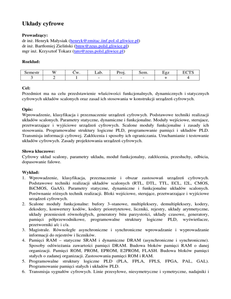 Układy cyfrowe Prowadzący: dr inż. Henryk Małysiak ([email protected]) dr inż. Bartłomiej Zieliński ([email protected]) mgr inż. Krzysztof Tokarz ([email protected]) Rozkład: Semestr 3 W 2 Ćw. 1 Lab. - Proj. - Sem. - Egz + ECTS 4 Cel: Przedmiot ma na celu przedstawienie właściwości funkcjonalnych, dynamicznych i statycznych cyfrowych układów scalonych oraz zasad ich stosowania w konstrukcji urządzeń cyfrowych. Opis: Wprowadzenie, klasyfikacja i przeznaczenie urządzeń cyfrowych. Podstawowe techniki realizacji układów scalonych. Parametry statyczne, dynamiczne i funkcjonalne. Moduły wejściowe, sterujace, przetwarzające i wyjściowe urządzeń cyfrowych. Scalone moduły funkcjonalne i zasady ich stosowania. Programowalne struktury logiczne PLD, programowanie pamięci i układów PLD. Transmisja informacji cyfrowej. Zakłócenia i sposoby ich ograniczania. Uruchamianie i testowanie układów cyfrowych. Zasady projektowania urządzeń cyfrowych. Słowa kluczowe: Cyfrowy układ scalony, parametry układu, moduł funkcjonalny, zakłócenia, przesłuchy, odbicia, dopasowanie falowe. Wykład: 1. Wprowadzenie, klasyfikacja, przeznaczenie i obszar zastosowań urządzeń cyfrowych. Podstawowe techniki realizacji układów scalonych (RTL, DTL, TTL, ECL, I2L, CMOS, BiCMOS, GaAS). Parametry statyczne, dynamiczne i funkcjonalne układów scalonych. Porównanie różnych technik realizacji. Bloki wejściowe, sterujące, przetwarzające i wyjściowe urządzeń cyfrowych. 2. Scalone moduły funkcjonalne: bufory 3–stanowe, multipleksery, demultipleksery, kodery, dekodery, konwertery kodów, kodery prioretytetowe, liczniki, rejestry, układy arytmetyczne, układy przeniesień równoległych, generatory bitu parzystości, układy czasowe, generatory, pamięci półprzewodnikowe, programowalne struktury logiczne PLD, wyświetlacze, przetworniki a/c i c/a. 3. Magistrale. Równoległe asynchroniczne i synchroniczne wprowadzanie i wyprowadzanie informacji do rejestrów i liczników. 4. Pamięci RAM – statyczne SRAM i dynamiczne DRAM (asynchroniczne i synchroniczne). Sposoby odświeżania zawartości pamięci DRAM. Budowa bloków pamięci RAM o danej organizacji. Pamięci ROM, PROM, EPROM, E2PROM, FLASH. Budowa bloków pamięci stałych o zadanej organizacji. Zastosowania pamięci ROM i RAM. 5. Programowalne struktury logiczne PLD (PLA, FPLA, FPLS, FPGA, PAL, GAL). Programowanie pamięci stałych i układów PLD. 6. Transmisja sygnałów cyfrowych. Linie przesyłowe, niesymetryczne i symetryczne, nadajniki i odbiorniki linii. 7. Układy wejściowe: przyciski, klawiatury. Układy wyjściowe, wyświetlacze siedmiosegmentowe, wyświetlacze LCD, numeryczne, alfanumeryczne, matrycowe, matryce diodowe. 8. Zakłócenia w układach cyfrowych (zewnętrzne, wewnętrzne: przesłuchy, odbicia) i sposoby ograniczania ich wpływu (ekranowanie, blokowanie, dopasowanie falowe). 9. Uszkodzenia w układach cyfrowych i ich modele. Testowanie układów cyfrowych. Metody generacji testów. Układy łatwo testowalne. Uruchamianie układów cyfrowych. Próbniki i analizatory stanów logicznych, analizatory sygnatór. 10. Zasady projektowania urządzeń cyfrowych (projektowanie systemowe, operacyjne, logiczne, symulacja funkcjonalna i czasowa, projektowanie konstrukcyjne). Zasady zasilania i montażu urządzeń cyfrowych. Ćwiczenia: W ramach ćwiczeń tablicowych rozwiązywane są przykłady projektowania typowych układów cyfrowych z wykonaniem niezbędnych obliczeń związanych np. z doborem wartości rezystorów dla wyjść typu OC bądź obciążalnością prądową. Warunki zaliczenia i egzamin: Warunkiem zaliczenia przedmiotu jest uzyskanie pozytywnej oceny ze sprawdzianu obejmującego wykład i pozytywnych ocen ze sprawdzianów na ćwiczeniach tablicowych. Metody nauczania: Wykład wspomagany materiałami powielanymi i przeźroczami. Materiały dydaktyczne: Dydaktyczne materiały powielane, materiały w formie elektronicznej. Literatura podstawowa: • M.Łakomy, J.Zabrodzki „Cyfrowe układy scalone” PWN, 1983 r. • M.Łakomy, J.Zabrodzki „Układy scalone CMOS” PWN, 1991 r. Literatura uzupełniająca: • M.Łakomy, J.Zabrodzki „Liniowe układy scalone w technice cyfrowej” PWN, 1987 r. • J.Pieńkowski, J.Turczyński „Układy scalone TTL w systemach cyfrowych” WKiŁ 1980 r.