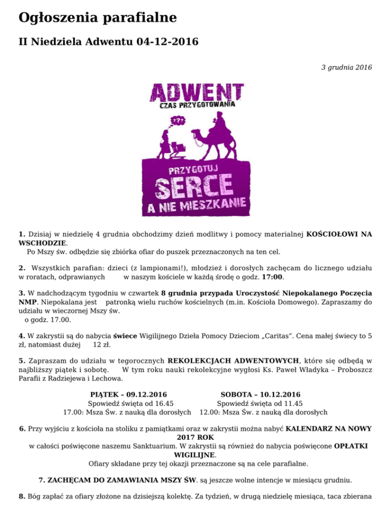 Ogłoszenia parafialne II Niedziela Adwentu 04-12-2016 3 grudnia 2016 1. Dzisiaj w niedzielę 4 grudnia obchodzimy dzień modlitwy i pomocy materialnej KOŚCIOŁOWI NA WSCHODZIE. Po Mszy św. odbędzie się zbiórka ofiar do puszek przeznaczonych na ten cel. 2. Wszystkich parafian: dzieci (z lampionami!), młodzież i dorosłych zachęcam do licznego udziału w roratach, odprawianych w naszym kościele w każdą środę o godz. 17:00. 3. W nadchodzącym tygodniu w czwartek 8 grudnia przypada Uroczystość Niepokalanego Poczęcia NMP. Niepokalana jest patronką wielu ruchów kościelnych (m.in. Kościoła Domowego). Zapraszamy do udziału w wieczornej Mszy św. o godz. 17.00. 4. W zakrystii są do nabycia świece Wigilijnego Dzieła Pomocy Dzieciom „Caritas”. Cena małej świecy to 5 zł, natomiast dużej 12 zł. 5. Zapraszam do udziału w tegorocznych REKOLEKCJACH ADWENTOWYCH, które się odbędą w najbliższy piątek i sobotę. W tym roku nauki rekolekcyjne wygłosi Ks. Paweł Władyka – Proboszcz Parafii z Radziejewa i Lechowa. PIĄTEK – 09.12.2016 Spowiedź święta od 16.45 17.00: Msza Św. z nauką dla dorosłych SOBOTA – 10.12.2016 Spowiedź święta od 11.45 12.00: Msza Św. z nauką dla dorosłych 6. Przy wyjściu z kościoła na stoliku z pamiątkami oraz w zakrystii można nabyć KALENDARZ NA NOWY 2017 ROK w całości poświęcone naszemu Sanktuarium. W zakrystii są również do nabycia poświęcone OPŁATKI WIGILIJNE. Ofiary składane przy tej okazji przeznaczone są na cele parafialne. 7. ZACHĘCAM DO ZAMAWIANIA MSZY ŚW. są jeszcze wolne intencje w miesiącu grudniu. 8. Bóg zapłać za ofiary złożone na dzisiejszą kolektę. Za tydzień, w drugą niedzielę miesiąca, taca zbierana podczas Mszy św. będzie przeznaczona na cele gospodarcze i remontowe przy naszym kościele. 9. Życzymy wszystkim naszym Gościom i Pielgrzymom miłej i spokojnej niedzieli, jak i błogosławionego tygodnia. NABOŻEŃSTWA W SANKTUARIUM: Poniedziałek – Po Mszy Św. Litania do Św. Józefa, Wtorek – Po Mszy Św. Koronka do Bożego Miłosierdzia, Środa – Po Mszy Św. Nowenna do Matki Bożej Nieustającej Pomocy.