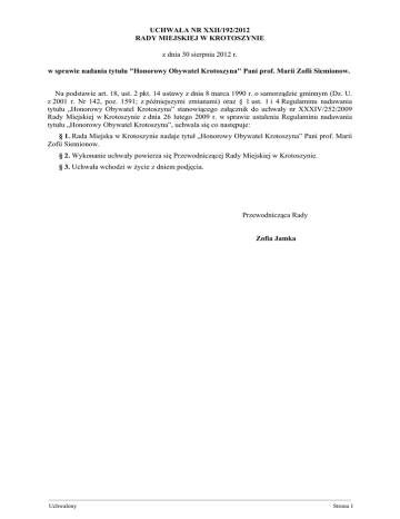 UCHWAŁA NR XXII/192/2012 RADY MIEJSKIEJ W KROTOSZYNIE z dnia 30 sierpnia 2012 r. w sprawie nadania tytułu "Honorowy Obywatel Krotoszyna" Pani prof. Marii Zofii Siemionow. Na podstawie art. 18, ust. 2 pkt. 14 ustawy z dnia 8 marca 1990 r. o samorządzie gminnym (Dz. U. z 2001 r. Nr 142, poz. 1591; z późniejszymi zmianami) oraz § 1 ust. 1 i 4 Regulaminu nadawania tytułu „Honorowy Obywatel Krotoszyna” stanowiącego załącznik do uchwały nr XXXIV/252/2009 Rady Miejskiej w Krotoszynie z dnia 26 lutego 2009 r. w sprawie ustalenia Regulaminu nadawania tytułu „Honorowy Obywatel Krotoszyna”, uchwala się co następuje: § 1. Rada Miejska w Krotoszynie nadaje tytuł „Honorowy Obywatel Krotoszyna” Pani prof. Marii Zofii Siemionow. § 2. Wykonanie uchwały powierza się Przewodniczącej Rady Miejskiej w Krotoszynie. § 3. Uchwała wchodzi w życie z dniem podjęcia. Przewodnicząca Rady Zofia Jamka —————————————————————————————————————————————————— Uchwalony Strona 1 Uzasadnienie Maria Zofia Siemionow urodziła się w Krotoszynie. W roku 1974 ukończyła Wydział Lekarski Akademii Medycznej w Poznaniu, uzyskując tytuł lekarza. Stopień naukowy doktora z mikrochirurgii uzyskała w 1985 roku, a habilitowała się w dziedzinie nauk medycznych w 1992 roku. Po emigracji do USA od 1985 r. przebywała na stypendium naukowym w Instytucie Christine Kleinert w Luisville (Kentucky), gdzie specjalizowała się w zakresie chirurgii ręki. Od 1995 roku kieruje oddziałem chirurgii plastycznej i mikrochirurgii w Klinice Kolegium Medycyny w Clevelend w stanie Ohio. Od 2005 roku jest profesorem na tamtejszym wydziale chirurgicznym. W 2007 roku Prezydent Lech Kaczyński nadał Marii Siemionow tytuł naukowy profesora zwyczajnego. W grudniu 2008 roku dokonała czwartej na świecie i pierwszej w USA udanej operacji przeszczepienia twarzy. Ośmioosobowy zespół pod kierunkiem prof. Marii Siemionow w trakcie 22 godzinnej operacji przeszczepił kobiecie 80 % powierzchni twarzy, pochodzącej od zmarłej dawczyni. Przeszczep wymagał połączenia licznych kości, mięśni, nerwów i naczyń krwionośnych. Dzięki temu pacjentka odzyskała szczękę wraz z podniebieniem, górną wargę, policzki, nos, powiekę dolną oraz zdolności samodzielnego oddychania, mówienia i jedzenia. W cztery miesiące po zabiegu pacjentka odzyskała zmysł smaku i węchu oraz funkcje mimiczne. Za wybitne osiągnięcia w dziedzinie chirurgii plastycznej w pracy naukowej i badawczej Pani prof. Maria Siemionow decyzją Prezydenta Lecha Kaczyńskiego z dnia 9 kwietnia 2009 roku została odznaczona Krzyżem Komandorskim Orderu Zasługi Rzeczpospolitej Polskiej, który przyjęła 17 kwietnia 2009 roku z rąk Roberta Kupieckiego Ambasadora RP w Waszyngtonie. Pani prof. Maria Siemionow współpracuje z Uniwersytetem Medycznym w Poznaniu, dzięki jej poparciu ponad 20 polskich stażystów otrzymało stypendia i mogło się szkolić w klinice w Cleveland. Polskie Towarzystwo Lekarskie, oddział w Krotoszynie uważa, że Pani prof. Maria Siemionow jest godną kandydatką do tytułu „Honorowy Obywatel Krotoszyna” i prosi Radę Miejską w Krotoszynie o uchwałę w sprawie przyznania tego zaszczytu. Przewodnicząca Rady Zofia Jamka —————————————————————————————————————————————————— Uchwalony Strona 1
