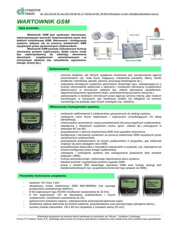 tel. (22) 432 85 50, fax (22) 432 85 40, ul. Pańska 81/83, 00-834 Warszawa, e-mail: [email protected] WARTOWNIK GSM Opis produktu Wartownik GSM jest systemem alarmowym, wykorzystującym łączność bezprzewodową przez sieć telefonii komórkowej GSM. Sterowanie i konfiguracja systemu odbywa się za pomocą wiadomości SMS wysyłanych przez uprawnionych użytkowników. Wartownik GSM posiada rozbudowane funkcje sterowania portami wyjściowymi, dzięki czemu może być wykorzystywany do zdalnego sterowania dowolnymi urządzeniami zainstalowanymi w chronionym obiekcie (np. oświetlenie, ogrzewanie, żaluzje, bramy itp.). Zastosowania − − − ochrona obiektów, dla których wyjątkowo kosztowne jest wynajmowanie agencji ochroniarskich (np. małe biura, magazyny, mieszkania prywatne, altany, domki działkowe i letniskowe, garaże, piwnice, przyczepy kempingowe itp.), rozbudowa istniejących systemów alarmowych dowolnego typu, wzbogacająca je o funkcje informowania właściciela o włamaniu i możliwości sterowania urządzeniami elektrycznymi w chronionym obiekcie (np. zdalne sterowanie oświetleniem, włączenie/wyłączenie ogrzewania lokalu, podniesienie/opuszczenie żaluzji itp.), zastosowanie w obiektach chronionych przez agencje ochrony mienia, jako medium transmisyjne, w sytuacjach, gdy lokalizacja obiektu lub odległość od centrum monitoringu nie pozwala użyć innych rozwiązań (np. radiolinii). Właściwości funkcjonalne systemu − − − − − − − − − − − − − możliwość zdefiniowania 5 użytkowników uprawnionych do obsługi systemu, nadawanie nazw liniom wejściowym i wyjściowym umożliwiających ich łatwą identyfikację, zróżnicowane uprawnienia i opcje powiadamiania dla poszczególnych użytkowników, współpraca z dowolnymi czujnikami (ruchu, ppoż., zalania itp.) pracującymi w obwodzie NC lub NO, powiadamianie o alarmie wiadomością SMS i/lub sygnałem dzwonienia, konfiguracja i sterowanie systemem za pomocą wiadomości SMS wysyłanych przez uprawnionych użytkowników, przeniesienie powiadomienia na innych użytkowników w przypadku, gdy właściciel znajduje się poza zasięgiem sieci GSM, powiadamianie właściciela o wszystkich zdarzeniach w systemie, (np. rozbrojenie lub zmiana konfiguracji przez innego użytkownika), uzbrajanie i rozbrajanie systemu bez nawiązywania połączenia (bez kosztów połączeń i SMS), funkcja automatycznego, cyklicznego raportowania stanu systemu, bieżąca kontrola i sygnalizacja poziomu sygnału GSM, praca z kartami SIM dowolnego operatora GSM oraz funkcje obsługi kart bezabonamentowych (np. uzupełnianie konta kart typu prepaid via SMS). Parametry techniczne urządzenia − − − − − − − zasilanie 12V (max 1,5A), wbudowany moduł telefoniczny GSM 900/1800MHz (nie wymaga przyłączania zewnętrznego telefonu), 8 linii wejściowych typu NC/NO (możliwość rozszerzenia do 32 linii), 8 linii wyjściowych 12V do sterowania przekaźnikami i innymi urządzeniami, (możliwość rozszerzenie do 32), galwanicznie izolowane wejścia i zabezpieczenie przeciwprzeciążeniowe wyjść, dodatkowe wejścia alarmowe do kontroli zasilania, antysabotażowe oraz zewnętrznego uzbrajania alarmu, wymiary modułu sterownika: 130 x 65 mm (wysokość z modułem we/wy 50 mm). _____________________________________________________________________________________________________________ Informacja powyższa nie stanowi oferty handlowej w rozumieniu art. 66 par. 1 Kodeksu Cywilnego. Firma CT Creative Team S.A. zastrzega sobie prawo do zmiany specyfikacji urządzenia oraz ostatecznej ceny produktu bez uprzedzenia.