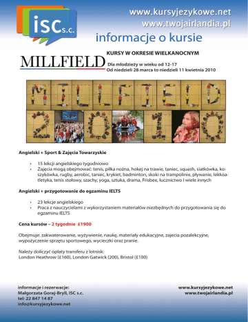 KURSY W OKRESIE WIELKANOCNYM Dla młodzieży w wieku od 12-17 Od niedzieli 28 marca to niedzieli 11 kwietnia 2010 Angielski + Sport & Zajęcia Towarzyskie • • 15 lekcji angielskiego tygodniowo Zajęcia mogą obejmować: tenis, piłka nożna, hokej na trawie, taniec, squash, siatkówka, koszykówka, rugby, aerobic, taniec, krykiet, badminton, skoki na trampolinie, pływanie, lekkoatletyka, tenis stołowy, szachy, yoga, sztuka, drama, Frisbee, łucznictwo I wiele innych Angielski + przygotowanie do egzaminu IELTS • • 23 lekcje angielskiego Praca z nauczycielami z wykorzystaniem materiałów niezbędnych do przygotowania się do egzaminu IELTS Cena kursów – 2 tygodnie £1900 Obejmuje: zakwaterowanie, wyżywienie, naukę, materiały edukacyjne, zajecia pozalekcyjne, wypożyczenie sprzętu sportowego, wycieczki oraz pranie. Należy doliczyć opłaty transferu z lotnisk: London Heathrow (£160), London Gatwick (200), Bristol (£100) informacje i rezerwacje: Małgorzata Goraj-Bryll, ISC s.c. tel: 22 847 14 87 [email protected] www.kursyjezykowe.net www.twojairlandia.pl