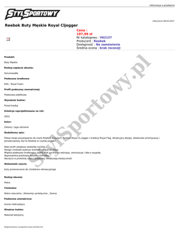 Informacje o produkcie Utworzono 08-03-2017 Reebok Buty Męskie Royal Cljogger Cena : 197,99 zł Nr katalogowy : V62137 Producent : Reebok Dostępność : Na zamówienie Średnia ocena : brak recenzji Produkt: pl Buty Męskie Rodzaj zapięcia obuwia: y. Sznurowadła Podeszwa środkowa: Profil podeszwy zewnętrznej: Podeszwa jodełkowa Wysokość butów: Przed kostkę Kolekcja zaprojektowana na rok: 2015 Zielony i jego odcienie Dodatkowy opis: lS p Kolor: or to w EVA , Royal Foam Pokaż swoje przywiązanie do marki Reebok w butach Reebok Royal CL Jogger z kolekcji Royal Flag. Atrakcyjny design, doskonała amortyzacja i ponadczasowy styl to Reebok w czystej postaci. St y Niski profil zwiększa swobodę ruchów Design cholewki podnosi komfort i wsparcie stopy Miękka podeszwa środkowa z pianki EVA pochłania wstrząsy, amortyzuje i dba o wygodę Wyjmowalna piankowa wkładka Ortholite Nacięcia w przedniej części podeszwy zwiększają elastyczność Wskazówki użycia: buty przeznaczone do chodzenia rekreacyjnego Rodzaj obuwia: Pełne Cholewka: Skóra naturalna , Elementy syntetyczne , Zamsz Podeszwa zewnętrzna: Guma niebrudząca Wnętrze butów: Materiał tekstylny Wygenerowano w programie www.oscGold.com Wysokość obcasa: brak Sezon: Jesień/Zima Rozmiar prezentowany na zdjęciach: 44 Przeznaczenie: Klasyka V62137 pl Dostępne opcje Reebok Buty Męskie Royal Cljogger St y lS p or to w y. Rozmiar: 40.5, 44, 44.5, 45, 45.5, 46.