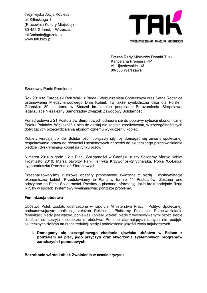 Trójmiejska Akcja Kobieca ul. Kilińskiego 1 (Pracownia Kultury Miejskiej) 80-452 Gdańsk – Wrzeszcz [email protected] www.tak.blox.pl Prezes Rady Ministrów Donald Tusk Kancelaria Premiera RP Al. Ujazdowskie 1/3 00-583 Warszawa Szanowny Panie Premierze, Rok 2010 to Europejski Rok Walki z Biedą i Wykluczeniem Społecznym oraz Setna Rocznica ustanowienia Międzynarodowego Dnia Kobiet. To takŜe symboliczna data dla Polski i Gdańska: 30 lat temu w Stoczni im. Lenina podpisano Porozumienia Sierpniowe, legalizujące NiezaleŜny Samorządny Związek Zawodowy Solidarność. Ponad połowa z 21 Postulatów Sierpniowych odnosiła się do poprawy sytuacji ekonomicznej Polek i Polaków. Większość z nich do dzisiaj nie została zrealizowana, w szczególności tych dotyczących przeciwdziałania ekonomicznemu wykluczeniu kobiet. Kobiety wracają do idei Solidarności, połączyły siły, by domagać się zmiany społecznej, respektowania prawa do równości i systemowych narzędzi do skutecznego przeciwdziałania biedzie i dyskryminacji kobiet na rynku pracy. 6 marca 2010 o godz. 12 z Placu Solidarności w Gdańsku ruszy Solidarny Marsz Kobiet Trójmiasto 2010. Marsz otworzy Pani Henryka Krzywonos–Strycharska, Polka XX-Lecia, sygnatariuszka Porozumień Sierpniowych. Przeanalizowałyśmy kluczowe obszary problemowe związane z biedą i dyskryminacją ekonomiczną kobiet. Przedstawiamy je Panu w formie 11 Postulatów. Zostaną one odczytane na Placu Solidarności. Prosimy o pisemną informację, jakie kroki podejmie Rząd RP, by w sposób systemowy wyeliminować poniŜsze problemy. Feminizacja ubóstwa Ubóstwo Polek zostało dostrzeŜone w raporcie Ministerstwa Pracy i Polityki Społecznej, podsumowującym realizację załoŜeń Pekińskiej Platformy Działania. Przeciwdziałanie feminizacji biedy jest waŜne, poniewaŜ kobiety „dzielą” biedę z wychowywanymi przez siebie dziećmi, co sprzyja dziedziczeniu ubóstwa. Pomimo alarmujących danych nie podjęto skutecznych działań na rzecz redukcji biedy i podniesienia jakości Ŝycia najuboŜszych. 1. Domagamy się szczegółowego zbadania zjawiska ubóstwa w Polsce z podziałem na płeć, jego przyczyn oraz stworzenia systemowych programów zaradczych i pomocowych. Bezrobocie wśród kobiet. Zwolnienia w czasie kryzysu Trójmiejska Akcja Kobieca ul. Kilińskiego 1 (Pracownia Kultury Miejskiej) 80-452 Gdańsk – Wrzeszcz [email protected] www.tak.blox.pl W trzecim kwartale 2009 wskaźnik zatrudnienia dla kobiet wyniósł 43,4%, a dla męŜczyzn 59,2% (BAEL). Z danych Ministerstwa Pracy wynika, Ŝe kobiety przewaŜają wśród bezrobotnych zarejestrowanych w urzędach pracy. Gdy zwolnienia dotykają całych tzw. „męskich” sektorów, jak na przykład górnictwa czy przemysłu cięŜkiego, grupom zawodowym z nim związanym przysługują wysokie odprawy, osłony socjalne. Kobiety natomiast najczęściej pracują w usługach powiązanych z przemysłem, nie przysługuje im zatem tego rodzaju systemowa pomoc. Biorąc pod uwagę powaŜny wzrost fali zwolnień w kryzysie oraz trudności jakich doświadczają kobiety w powrocie na rynek pracy, naleŜy spodziewać się, Ŝe dołączą do grupy długotrwale bezrobotnych. 2. Domagamy się realnych oraz nowoczesnych sposobów aktywizacji zawodowej kobiet, a takŜe ochrony kobiet w wieku przedemerytalnym. Wymuszane samozatrudnienie Polki coraz częściej zakładają własną działalność gospodarczą. Sytuacja, oficjalnie przedstawiana jako przykład zaradności, bardzo często jest wymuszona przez pracodawcę lub brak moŜliwości podjęcia innej formy zatrudnienia. Niejednokrotnie kobiety są zmuszane do samozatrudnienia pod groźbą utraty pracy. Mimo, iŜ zmuszanie pracownicy lub pracownika do podjęcia działalności gospodarczej i świadczenia usług na rzecz przedsiębiorstwa jest nielegalne, to w wielu wypadkach pracownice małych zakładów czy biur musiały "przejść na działalność gospodarczą", tracąc przywileje związane z umową o pracę, m.in. płatny urlop. 3. Domagamy się egzekwowania uregulowań prawnych przeciwdziałających wymuszonemu zakładaniu działalności gospodarczej na Ŝądanie pracodawcy. Dyskryminacja na rynku pracy Dyskryminacja kobiet na rynku pracy znajduje odzwierciedlenie w przeciętnie niŜszych płacach. Dane GUS (2008) pokazują, Ŝe we wszystkich tzw. „wielkich” grupach zawodowych wynagrodzenia kobiet są niŜsze od wynagrodzeń męŜczyzn. Średnio przeciętne wynagrodzenie Polek jest o 23% niŜsze od przeciętnego wynagrodzenia Polaków. Jest to główna przyczyna nierównych emerytur – kobiety pobierają świadczenia o 1/3 niŜsze niŜ męŜczyźni. Przejawy nierówności moŜna teŜ zauwaŜyć w obsadzie kierowniczych stanowisk w firmach – kobiety stanowią jedynie 35% (Eurostat) i przewaŜnie są to stanowiska kierownicze niŜszego szczebla. Stanowiska kierownicze są teŜ najbardziej zróŜnicowane płacowo: męŜczyźni zarabiają ponad 28% więcej niŜ kobiety. Utajnianie zarobków przez pracodawców sprzyja ukrywaniu dyskryminacji płacowej i utrudnia dochodzenie swoich praw. Do najbardziej sfeminizowanych pod względem zatrudnienia obszarów gospodarki naleŜą: ochrona zdrowia i pomoc społeczna, edukacja oraz branŜa hotelowa i gastronomia. Są to równocześnie sektory o najniŜszym średnim wynagrodzeniu brutto. Trójmiejska Akcja Kobieca ul. Kilińskiego 1 (Pracownia Kultury Miejskiej) 80-452 Gdańsk – Wrzeszcz [email protected] www.tak.blox.pl Według raportu GUS „Kobiety i męŜczyźni na rynku pracy” najbardziej sfeminizowaną grupę zawodową stanowią „pracownicy usług osobistych i sprzedawcy”, w której w 2007 na 100 męŜczyzn przypadało 199 kobiet. 4. Domagamy się monitorowania gwarantowanej w kodeksie pracy równości w warunkach zatrudnienia i wynagrodzenia poprzez wprowadzenie obowiązku monitorowania równości w przedsiębiorstwach (tworzenie i realizowanie przez firmy równościowych programów napra