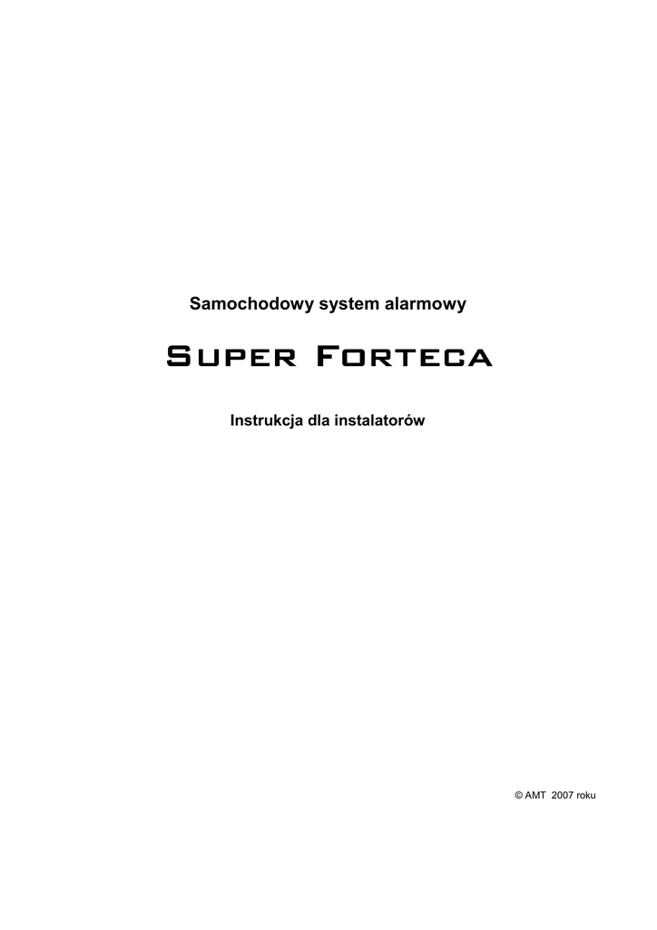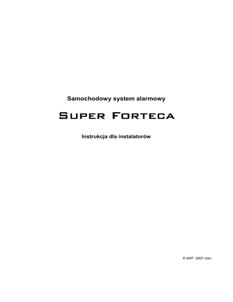Samochodowy system alarmowy Super Forteca Instrukcja dla instalatorów © AMT 2007 roku Spis treści: 1. Instrukcja montażu mechanicznego 3 2. Instrukcja programowania 3 3. Tryb serwisowy i awaryjne rozbrajanie kodem PIN 11 4. Identyfikacja kierowcy 12 5. Bezobsługowa identyfikacja kierowcy 12 6. Instrukcja montażu elektrycznego 13 2 1. Instrukcja montażu mechanicznego 1.1. Odłącz akumulator (minus) - Szczególnie dotyczy to samochodów wyposażonych w poduszkę powietrzną. 1.2. Podczas wyboru miejsca sugerujemy zamocowanie centralki alarmowej pod deską rozdzielczą możliwie jak najwyżej (zasięg pilotów) z dala od fabrycznej instalacji elektrycznej, komputerów, części ruchomych czy tunelów grzewczo-kanalizacyjnych. 1.3. Ułóż przewody równolegle zgodnie z ich przeznaczeniem z dala od części ruchomych na przykład układu kierowniczego. 1.4. Przy podłączaniu przewodów do centralki należy zachować ostrożność tak, aby nie uszkodzić złącz w centralce. 1.5. Wszystkie podłączenia wykonywać w sposób staranny wyłącznie przez lutowanie. Przewody zasilające oraz wyprowadzenia do blokowania wykonać przekrojem przewodu możliwie najgrubszym. 1.6. Antena centralki powinna być wyprostowana, nie wolno jej skracać, wydłużać, uziemiać 1.7. Znajdź miejsce na diodę LED, wywierć otwór o średnicy 5mm w desce rozdzielczej i zamocuj na wcisk diodę LED. 1.8. Zamocuj czujnik dodatkowy tak, aby zachować łatwy dostęp do jego regulacji. 1.9. Zamontuj syrenkę w miejscu w którym będzie najlepiej słyszalna, z dala od źródeł ciepła, kopułką skierowaną do dołu w celu zabezpieczenia przed gromadzeniem wody i łatwym dostępem do stacyjki syreny. 1.10. Przewody prowadzić w peszlu lub izolacji uniemożliwiającej dostęp wodzie. 1.11. Jeśli samochód nie posiada wyłącznika krańcowego pokrywy silnika, zamontować dobierając miejsce tak, aby nie miała do niego dostępu woda. 1.12. Pamiętaj powiadomić właściciela pojazdu o awaryjnym uruchomieniu pojazdu. 13. Zawsze pamiętaj o sprawdzeniu montażu przed oddaniem samochodu właścicielowi pojazdu. 2. Instrukcja programowania 2.1. Włączenie programowania opcji użytkownika (0 grupa parametrów) rozbroić alarm, otworzyć drzwi, załączyć stacyjkę ( jeżeli aktywna jest funkcja identyfikacji kierowcy należy ją skasować), następnie nacisnąć jednocześnie przyciski [B] i [C] w pilocie, EFEKT: dioda LED szybko pulsuje, tryb programowania włączony. 2.2. Wyjście z programowania opcji użytkownika ( 0 grupy parametrów) wyłączyć stacyjkę lub zamknąć drzwi, EFEKT: dioda LED gaśnie. 2.3. Wybór cichego lub głośnego uzbrajania/rozbrajania alarmu: wejść w tryb programowania opcji użytkownika (punkt 2.1.), nacisnąć przycisk [B] w pilocie, EFEKT: - jedno piknięcie syreny, załączenie głośnego uzbrajania/rozbrajania alarmu, - dwa piknięcia syreny, załączenie cichego uzbrajania/rozbrajania alarmu. 2.4. Uaktywnienie funkcji identyfikacji kierowcy wejść w tryb programowania opcji użytkownika (punkt 2.1.), nacisnąć przycisk [C] w pilocie, EFEKT: - jedno piknięcie syreny, funkcja identyfikacji kierowcy aktywna - dwa piknięcia syreny, funkcja identyfikacji kierowcy nieaktywna 2.5. Wprogramowanie bezobsługowych pilotów identyfikujących wejść w tryb programowania opcji użytkownika (punkt 2.1.), nacisnąć przycisk [A] w pilocie EFEKT: - jedno piknięcie syreny, dioda LED zapala się na stałe, Jednokrotnie nacisnąć przycisk w pierwszym i drugim pilocie identyfikatorze. Wprogramowanie poszczególnych identyfikatorów zostaje potwierdzone krótkim mrugnięciem kierunkowskazów. Jeżeli posiadamy tylko jeden pilot identyfikator, należy wprogramować go 2 razy. Wejście w tryb programowania identyfikatorów kasuje wcześniej zaprogramowane. Jeżeli nie wprogramujemy identyfikatorów, to po 16 sekundach alarm wychodzi z trybu programowania identyfikatorów. 3 2.6. Wprogramowanie bezprzewodowych czujników do ochrony garażu wejść w tryb programowania opcji użytkownika (punkt 2.1.), nacisnąć przycisk [B] i [C] w pilocie EFEKT: - jedno piknięcie syreny, dioda LED zapala się na stałe. Wywołać jednokrotną transmisję z pierwszego i drugiego czujnika bezprzewodowego. Wprogramowanie poszczególnych czujników zostaje potwierdzone krótkim mrugnięciem kierunkowskazów. Jeżeli posiadamy tylko jeden czujnik bezprzewodowy, należy wprogramować go 2 razy. Wejście w tryb programowania czujników kasuje wcześniej zaprogramowane. Jeżeli nie wprogramujemy czujników, to po 16 sekundach alarm wychodzi z trybu programowania czujników. Opcje Użytkownika – 1 grupa parametrów Przycisk Opis funkcji B Wybór cichego lub głośnego uzbrajania/rozbrajania alarmu C Uaktywnienie funkcji identyfikacji kierowcy A Wprogramowanie bezobsługowych pilotów identyfikujących Wprogramowanie bezprzewodowych czujników do ochrony garażu BiC Sygnalizacja stanu - jedno piknięcie syreny, załączenie głośnego uzbrajania/rozbrajania alarmu, - dwa piknięcia syreny, załączenie cichego uzbrajania/rozbrajania alarmu jedno piknięcie syreny, funkcja identyfikacji kierowcy aktywna - dwa piknięcia syreny, funkcja identyfikacji kierowcy nieaktywna - jedno piknięcie syreny - jedno piknięcie syreny 2.7. Włączenie 1 grupy parametrów (opcje instalatora) wejść w tryb programowania opcji użytkownika (punkt 2.1.), następnie nacisnąć i przytrzymać przycisk autoryzujący przez 5 sekund. EFEKT: jeden pik syrenki, dioda LED miga (cyklicznie 1 impuls – przerwa), tryb programowania opcji instalatora, 1 grupa parametrów włączony. 2.8. Wyjście z 1 grupy parametrów wyłączyć stacyjkę lub zamknąć drzwi, EFEKT: dioda LED gaśnie. 2.9. Zmiana czasów sterowania zamkiem centralnym: wejść w tryb programowania 1 grupy parametrów (punkt 2.7.), nacisnąć przycisk [B] w pilocie, EFEKT: - jedno piknięcie syreny, załączony został jedno sekundowy czas sterowania zamka centralnego, - trzy pik
