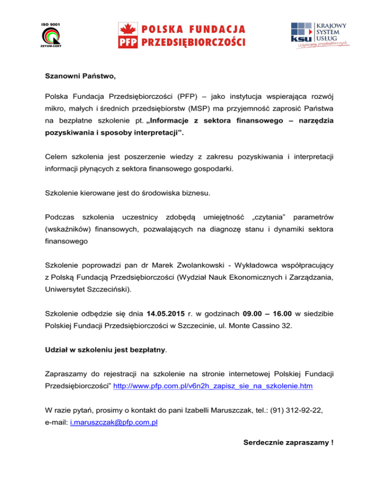 ISO 9001 ZETOM-CERT Szanowni Państwo, Polska Fundacja Przedsiębiorczości (PFP) – jako instytucja wspierająca rozwój mikro, małych i średnich przedsiębiorstw (MSP) ma przyjemność zaprosić Państwa na bezpłatne szkolenie pt. „Informacje z sektora finansowego – narzędzia pozyskiwania i sposoby interpretacji”. Celem szkolenia jest poszerzenie wiedzy z zakresu pozyskiwania i interpretacji informacji płynących z sektora finansowego gospodarki. Szkolenie kierowane jest do środowiska biznesu. Podczas szkolenia uczestnicy zdobędą umiejętność „czytania” parametrów (wskaźników) finansowych, pozwalających na diagnozę stanu i dynamiki sektora finansowego Szkolenie poprowadzi pan dr Marek Zwolankowski - Wykładowca współpracujący z Polską Fundacją Przedsiębiorczości (Wydział Nauk Ekonomicznych i Zarządzania, Uniwersytet Szczeciński). Szkolenie odbędzie się dnia 14.05.2015 r. w godzinach 09.00 – 16.00 w siedzibie Polskiej Fundacji Przedsiębiorczości w Szczecinie, ul. Monte Cassino 32. Udział w szkoleniu jest bezpłatny. Zapraszamy do rejestracji na szkolenie na stronie internetowej Polskiej Fundacji Przedsiębiorczości” http://www.pfp.com.pl/v6n2h_zapisz_sie_na_szkolenie.htm W razie pytań, prosimy o kontakt do pani Izabelli Maruszczak, tel.: (91) 312-92-22, e-mail: [email protected] Serdecznie zapraszamy ! ISO 9001 : ZETOM-CERT Program szkolenia „Informacje z sektora finansowego – narzędzia pozyskiwania i sposoby interpretacji” Temat zajęć Godzina 9.00 – 9.15 Powitanie uczestników i wprowadzenie 9.15 – 10.30 Informacja o monetarnych uwarunkowaniach biznesu. Złożoność inflacji i deflacji. Różnicowanie miar inflacji bazowej. Inflacja a stopa procentowa. 10.30 – 10.45 Przerwa 10.45 – 12.15 Parametry rynku finansowego:p omiar i interpretacja. Struktura rynkowej stopy. Stopa procentowa a kurs walutowy. Case study: frank szwajcarski. 12.15 – 12.30 Przerwa 12.30 – 14.15 Informacja o sytuacji na rynku kredytowym. Warunki i kryteria kredytowania 14.15 – 14.30 Przerwa 14.30 – 16.00 Informacja uprzedzająca o koniunkturze gospodarczej. Jak „czytać” wskaźniki koniunktury gospodarczej i finansowej? 16.00 Zakończenie szkolenia