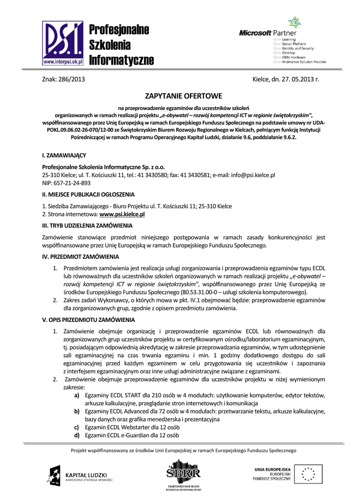Profesjonalne Szkolenia Informatyczne Znak: 286/2013 Kielce, dn. 27. 05.2013 r. ZAPYTANIE OFERTOWE na przeprowadzenie egzaminów dla uczestników szkoleń organizowanych w ramach realizacji projektu „e-obywatel – rozwój kompetencji ICT w regionie świętokrzyskim”, współfinansowanego przez Unię Europejską w ramach Europejskiego Funduszu Społecznego na podstawie umowy nr UDAPOKL.09.06.02-26-070/12-00 ze Świętokrzyskim Biurem Rozwoju Regionalnego w Kielcach, pełniącym funkcję Instytucji Pośredniczącej w ramach Programu Operacyjnego Kapitał Ludzki, działanie 9.6, poddziałanie 9.6.2. I. ZAMAWIAJĄCY Profesjonalne Szkolenia Informatyczne Sp. z o.o. 25-310 Kielce; ul. T. Kościuszki 11, tel.: 41 3430580; fax: 41 3430581; e-mail: [email protected] NIP: 657-21-24-893 II. MIEJSCE PUBLIKACJI OGŁOSZENIA 1. Siedziba Zamawiającego - Biuro Projektu ul. T. Kościuszki 11; 25-310 Kielce 2. Strona internetowa: www.psi.kielce.pl III. TRYB UDZIELENIA ZAMÓWIENIA Zamówienie stanowiące przedmiot niniejszego postępowania w ramach zasady konkurencyjności jest współfinansowane przez Unię Europejską w ramach Europejskiego Funduszu Społecznego. IV. PRZEDMIOT ZAMÓWIENIA 1. Przedmiotem zamówienia jest realizacja usługi zorganizowania i przeprowadzenia egzaminów typu ECDL lub równoważnych dla uczestników szkoleń organizowanych w ramach realizacji projektu „e-obywatel – rozwój kompetencji ICT w regionie świętokrzyskim”, współfinansowanego przez Unię Europejską ze środków Europejskiego Funduszu Społecznego (80.53.31.00-0 – usługi szkolenia komputerowego). 2. Zakres zadań Wykonawcy, o których mowa w pkt. IV.1 obejmować będzie: przeprowadzenie egzaminów dla zorganizowanych grup, zgodnie z opisem przedmiotu zamówienia. V. OPIS PRZEDMIOTU ZAMÓWIENIA 1. Zamówienie obejmuje organizację i przeprowadzenie egzaminów ECDL lub równoważnych dla zorganizowanych grup uczestników projektu w certyfikowanym ośrodku/laboratorium egzaminacyjnym, tj. posiadającym odpowiednią akredytację w zakresie przeprowadzania egzaminów, w tym udostępnienie sali egzaminacyjnej na czas trwania egzaminu i min. 1 godziny dodatkowego dostępu do sali egzaminacyjnej przed każdym egzaminem w celu przygotowania się uczestników i zapoznania z interfejsem egzaminacyjnym oraz inne usługi administracyjne związane z egzaminami. 2. Zamówienie obejmuje przeprowadzenie egzaminów dla uczestników projektu w niżej wymienionym zakresie: a) Egzaminy ECDL START dla 210 osób w 4 modułach: użytkowanie komputerów, edytor tekstów, arkusze kalkulacyjne, przeglądanie stron internetowych i komunikacja b) Egzaminy ECDL Advanced dla 72 osób w 4 modułach: przetwarzanie tekstu, arkusze kalkulacyjne, bazy danych oraz grafika menedżerska i prezentacyjna c) Egzamin ECDL Webstarter dla 12 osób d) Egzamin ECDL e-Guardian dla 12 osób Projekt współfinansowany ze środków Unii Europejskiej w ramach Europejskiego Funduszu Społecznego Profesjonalne Szkolenia Informatyczne 3. Przedmiot zamówienia obejmuje również możliwość przeprowadzenia egzaminów poprawkowych w maksymalnej ilości dla pkt.V.2a – 210 egzaminów, V.2b – 72 egzaminów, V.2c-12 egzaminów, V.2d-12 egzaminów. Egzamin poprawkowy należy rozumieć jako pojedynczy egzamin w danym module i poziomie wskazanym w punkcie V.2. Przeprowadzenie egzaminów poprawkowych i ich ostateczna ilość zależy od wyników uzyskiwanych przez uczestników na egzaminach oraz możliwości finansowych Zamawiającego. Egzaminy poprawkowe nie wymagają dodatkowego czasu dostępu do sali egzaminacyjnej przed egzaminem. Zamawiający zastrzega sobie możliwość przeprowadzenia wyłącznie 1 podejścia do egzaminów dla wykazanej liczby uczestników, tzn. bez egzaminów poprawkowych. 4. Miejsce realizacji egzaminów – Kielce oraz w zależności od bieżących potrzeb i miejsca zamieszkania uczestników projektu Zamawiający zastrzega sobie możliwość przeprowadzenia egzaminów dla poszczególnych grup w innych miejscach na terenie powiatu kieleckiego, koneckiego, buskiego i jędrzejowskiego. Oferta musi uwzględniać możliwość przeprowadzenia egzaminów na terenie wszystkich 4 powiatów. 5. Egzaminy zostaną przeprowadzone głównie w grupach 12-15-osobowych lub mniejszych w terminach dostosowanych do rozkładu zajęć uczestników projektu i wskazanych przez Zamawiającego z minimalnie 3-dniowym wyprzedzeniem. 6. Zamawiający zastrzega sobie prawo do zmniejszenia liczby osób, a co za tym idzie liczby egzaminów, w przypadku niezgłoszenia się do projektu wystarczającej liczby uczestników lub nieukończenia przez dostateczną liczbę osób szkolenia z zakresu przygotowania do egzaminu. 7. Zamawiający każdorazowa dostarczy Wykonawcy listy uczestników egzaminu i informacje niezbędne do zorganizowania egzaminów. 8. Oferta powinna uwzględniać możliwość zmniejszenia lub zwiększenia liczby uczestników o 15%. VI. TERMIN REALIZACJI ZAMÓWIENIA 1. Okres realizacji: czerwiec 2013– luty 2015. VIII. KRYTERIA OCENY OFERTY a) Kryteria jakościowe – punkty za kryterium odnoszą się do zgodności oferty z wymogami z punktu V – opis przedmiotu zamówienia na zasadzie spełnia/nie spełnia oraz dodatkowo punktowane: K1 - dodatkowy czas dostępu do sali egzaminacyjnej przed egzaminem – maksymalnie 10 punktów, przy czym 5 punktów za każdą dodatkową godzinę dostępu ponad wskazane minimum. K2 - Gotowość na zorganizowanie i przeprowadzenie egzaminu z 3-dniowym wyprzedzeniem – 10 punktów. b) Cena – cena oferty oznacza łącznie koszt usługi przypadający na 1 uczestnika w odniesieniu do danego poziomu egzaminu (tzn. w przypadku kilku egzaminów na danym poziomie należy podać łączny koszt egzaminów w każdym module dla 1 uczestnika) oraz koszt usługi przeprowadzenia jednego egzaminu poprawkowego (w 1 module). Punkty za kryterium „cena” zostaną obliczone wg następującego wzoru: C=Ca+Cb+Cc+Cd przy czym Ca- liczba 