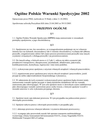Ogólne Polskie Warunki Spedycyjne 2002 Opracowane przez PISiL (uchwała nr 35 Rady z dnia 11.10.2002) Aprobowane uchwałą Prezydium KIG dnia 23.04.2003 nr 59/15/2003 PRZEPISY OGÓLNE §1 1.1. Ogólne Polskie Warunki Spedycyjne (OPWS) mają zastosowanie w stosunkach pomiędzy spedytorem, a jego zleceniodawcą. §2 2.1. Spedytorem jes ten, kto zawodowo, za wynagrodzeniem podejmuje się we własnym imieniu lecz na rachunek zleceniodawcy lub w imieniu zleceniodawcy wysłania lub odbioru przesyłki, zorganizowania całości lub części procesu przemieszczenia przesyłki oraz innych czynności związanych z obsługą przesyłki i jej przemieszczaniem. 2.2. Do innych usług, o których mowa w § 2 pkt 1, zalicza się takie czynności jak: poradnictwo transportowe, ubezpieczenie, przeładunek, składowanie, pakowanie, konfekcjonowanie, dystrybucja, logistyczne i inne temu podobne. 2.2.1. wykonywane przez spedytora z uŜyciem własnych urządzeń i własnych pracowników; 2.2.2. organizowane przez spedytora przy uŜyciu obcych urządzeń i pracowników, jeŜeli przyjął na siebie odpowiedzialność bezpośredniego wykonawcy. 2.3. W odniesieniu do tych czynności wykonywanych przez spedytora będą równieŜ miały zastosowanie warunki ogólne przyjęte w danej dziedzinie działalności lub tez warunki zastrzeŜone jako obowiązujące. W tym celu spedytor moŜe w dowolnym czasie zadeklarować jako obowiązujące warunki zastrzeŜone przez osoby trzecie, z którymi spedytor wszedł w stosunki umowne w celu wykonania przyjętego zlecenia. §3 3.1. Spedytor moŜe sam dokonać przewozu. W tym przypadku ma jednocześnie prawa i obowiązku przewoźnika. 3.2. Spedytor nabywa prawa i obowiązki przewoźnika w przypadku gdy: 3.2.1. dokonuje przewozu własnym taborem i wystawia dokument przewozowy; 3.2.2. występuje jako przewoźnik morski lub operator transportu multimodalnego wystawiając własny konosament lub konosament FIATA, zwany Negotiable FIATA Multimodal Transport Bill of Lading; 3.2.3. dokonuje przewozu taborem obcym lecz wystawia dokument przewozowy (przewoźnik umowny); 3.2.4. przyjmuje zlecenie transportowe. §4 Zleceniodawcą w rozumieniu niniejszych warunków jest osoba/strona zawierająca umowę ze spedytorem, zlecająca mu realizacje zadań i czynności lub wstępująca w prawa tejŜe strony. §5 Postanowienia niniejszych warunków nie mają zastosowania do spedycji pieniędzy, papierów wartościowych, dokumentów, kosztowności i innych przedmiotów szczególnie cennych Oferty §6 ZłoŜona przez spedytora oferta obejmuje tylko te czynności, które są w niej wymienione i zachowuje waŜność w określonym terminie. 6.1. Oferta spedytora i uzgodnienia dotyczące stawek i usług (własnych lub osób trzecich) odnoszą się tylko do towarów określonych w zleceniu oraz zakładają typowe, nie zakłócone warunki jej realizacji. 6.2. W przypadku braku innych uzgodnień, kaŜda oferta lub kwotowanie zachowuje waŜność w przypadku ich niezwłocznego potwierdzenia przez zleceniodawcę i tylko wtedy, kiedy zlecenie do nich nawiązuje 6.3. W przypadku zmiany któregokolwiek elementu oferty, zaistniałej z przyczyn zewnętrznych, niezaleŜnych od spedytora, podane lub uzgodnione ceny będą odpowiednio korygowane wstecz od momentu, gdy zmiana ta wystąpiła. Korekta ofery wynikająca ze zmiany któregokolwiek jej elementu z przyczyn leŜących po stronie spedytora, wymaga zgody drugiej strony, tj. zleceniodawcy. 6.4. JeŜeli spedytor, zaleŜnie od sytuacji stosuje stawki zryczałtowane, rozumie się Ŝe w przypadku braku innych uzgodnień stawki te zawierają wszystkie koszty ponoszone przez spedytora podczas nie zakłóconego przebiegu procesu spedycyjnego Umowa spedycji §7 7.1. Przez umowę spedycji spedytor zobowiązuje się za wynagrodzeniem, w zakresie działalności swego przedsiębiorstwa do wysłania lub odbioru przesyłki albo do dokonania innych usług związanych z jej przewozem. 7.2. Umowę spedycji uwaŜa się za zawartą w chwili otrzymania przez spedytora zlecenia, chyba Ŝe spedytor bez zwłoki zawiadomi dającego zlecenie o odmowie jego przyjęcia Zlecenie spedycyjne §8 8.1. Spedytor wykonuje czynności na podstawie zlecenia. 8.2. Zlecenie dla jego waŜności nie wymaga formy pisemnej, jednakŜe dla uniknięcia nieporozumień i nieprawidłowości w jego realizacji zaleca się by wystawione zostało lub potwierdzone w formie pisemnej lub podobnej (fax, e-mail). 8.2.1. Spedytor nie jest odpowiedzialny za następstwa błędów i nieporozumień wynikłych w związku z otrzymaniem zlecenia ustnie lub telefonicznie. 8.2.2. Spedytor nie jest odpowiedzialny za skutki dodatkowych instrukcji udzielanych przez zleceniodawcę bezpośrednio innym stronom uczestniczącym w realizacji spedycji. 8.3. Zlecenie powinno zawierać wszystkie niezbędne informacje o przesyłce i o jej właściwościach, znaki i numery poszczególnych sztuk (opakowań), ich liczbe, cięŜar, wymiary, kubaturę, a takŜe określać zakres zlecanej usługi oraz wszelkie inne dane i dokumenty potrzebne dla prawidłowego wykonania zlecenia. 8.4. Zleceniodawca ma obowiązek udzielenia zlecenia kompletnego i prawidłowego. Zleceniodawcę obciąŜają konsekwencje zaistniałe wobec spedytora i osób trzecich w następstwie podania w zleceniu niedokładnych, niekompletnych i nieprawidłowych danych przy czym odnosi się to równieŜ do danych zawartych w dokumentach, korespondencji oraz podanych na przesyłce informacji co do ilości, wagi, wymiarów i właściwości, a takŜe wadliwego opakowania przesyłki, itp., nawet wtedy gdy niedokładność, niekompletność, względnie nieprawidłowość powstały bez jego winy. 8.5. Spedytor nie ma obowiązku, lecz jest uprawniony do sprawdzenia, czy przedstawione mu w zleceniu dane są poprawne i wyczerpujące. 8.6. Spedytor ma prawo, ale nie obowiązek sprawdzenia prawdziwości podpisów i uprawnień osób podpisanych na zleceniach, zawiadomieniach, przelewach, przekazach 