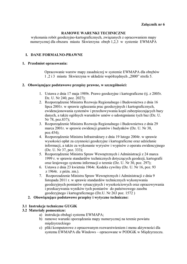 Załącznik nr 6 RAMOWE WARUNKI TECHNICZNE wykonania robót geodezyjno-kartograficznych, związanych z opracowaniem mapy numerycznej dla obszaru miasta Skwierzyna obręb 1,2,3 w systemie EWMAPA I. DANE FORMALNO-PRAWNE 1. Przedmiot opracowania: Opracowanie warstw mapy zasadniczej w systemie EWMAPA dla obrębów 1 ,2 i 3 miasta Skwierzyna w układzie współrzędnych „2000” strefa 5. 2. Obowiązujące podstawowe przepisy prawne, w szczególności: 1. Ustawa z dnia 17 maja 1989r. Prawo geodezyjne i kartograficzne (tj. z 2005r. Dz. U. Nr 240, poz. 2027); 2. Rozporządzenie Ministra Rozwoju Regionalnego i Budownictwa z dnia 16 lipca 2001r. w sprawie zgłaszania prac geodezyjnych i kartograficznych, ewidencjonowania systemów i przechowywania kopii zabezpieczających bazy danych, a także ogólnych warunków umów o udostępnianie tych baz (Dz. U. Nr 78, poz.837); 3. Rozporządzenie Ministra Rozwoju Regionalnego i Budownictwa z dnia 29 marca 2001r. w sprawie ewidencji gruntów i budynków (Dz. U. Nr 38, poz.454); 4. Rozporządzenie Ministra Infrastruktury z dnia 19 lutego 2004r. w sprawie wysokości opłat za czynności geodezyjne i kartograficzne oraz udzielanie informacji, a także za wykonanie wyrysów i wypisów z operatu ewidencyjnego (Dz. U. Nr 37, poz. 333); 5. Rozporządzenie Ministra Spraw Wewnętrznych i Administracji z 24 marca 1999 r. w sprawie standardów technicznych dotyczących geodezji, kartografii oraz krajowego systemu informacji o terenie (Dz. U. Nr 30, poz. 297); 6. Ustawa z dnia 23 kwietnia 1964r. Kodeks cywilny (Dz. U. Nr 16, poz. 93 z 1964r. z późn. zm.). 7. Rozporzadzenie Ministra Spraw Wewnętrznych i Administracji z dnia 9 listopada 2011 r. w sprawie standardów technicznych wykonywania geodezyjnych pomiarów sytuacyjnych i wysokościowych oraz opracowywania i przekazywania wyników tych pomiarów do państwowego zasobu geodezyjnego i kartograficznego (Dz.U. Nr 263 poz. 1572 ) 2. Obowiązujące podstawowe przepisy i wytyczne techniczne: 3.1 Instrukcje techniczne GUGiK 3.2 Materiały pomocnicze: a) instrukcja obsługi systemu EWMAPA; b) ramowe warunki sporządzania mapy numerycznej na terenie powiatu międzyrzeckiego c) pliki komputerowe z opracowanym rozwarstwieniem i menu aktywności dla systemu EWMAPA dla Windows – opracowane w PODGiK w Międzyrzeczu. 3. Ogólna charakterystyka obiektu Obszar opracowania obejmuje tereny miasta Skwierzyna w obrębie 1 ,2 i 3 charakteryzujące się zwartą zabudową na powierzchni 398 ha .Całość powierzchni obejmuje 3590 ha . II. ISTNIEJĄCE MATERIAŁY GEODEZYJNO-KARTOGRAFICZNE Dokumenty państwowego zasobu geodezyjnego i kartograficznego gromadzone są w Państwowym Ośrodku Dokumentacji Geodezyjnej i Kartograficznej w Międzyrzeczu przy ul. Przemysłowej 2. Mapa numeryczna prowadzona jest w systemie EWMAPA. Obszar opracowania obejmuje w mieście Skwierzyna razem powierzchnię 3590 ha 3670 działek , ilość operatów 2084 , ilość sekcji map 210, ilość budyn.3372 . Dane z pomiarów syt. – wys. PODGiK w Międzyrzeczu gromadzi w operatach i plikach *.txt uporządkowanych do nr KERG (numeru sekcji mapy 1:10000). Pliki zawierają numer pikiety i współrzędne XY (niektóre również H) dla prac geodezyjnych.Operaty do wprowadzenia – miasto Skwierzyna razem 2084 . III. ZAKRES PRAC PRZEWIDZIANYCH DO WYKONANIA 1. Skanowanie i wpasowanie map zasadniczych i sytuacyjno- wysokościowych wyszczególnionych w pkt II w układ „2000” strefa 5 oraz zapis w formacie *.evr wraz z raportami kalibracji. Wpasowanie należy wykonać precyzyjnie na wszystkie punkty siatki kwadratów. 2. Uzupełnienie warstw istniejącej mapy numerycznej w systemie EWMAPA w układzie „2000” w następujący sposób: a) Na warstwach z pomiaru elementy treści mapy stanowiące szczegóły sytuacyjne I grupy dokładnościowej, dla których w zasobie istnieją dane pomiarowe w oparciu o operaty geodezyjne z założenia mapy i operaty geodezyjne powstałe po 01.01.1990r. ; b) Na warstwach rastrowych pozostałe elementy treści mapy metodą digitalizacji. 3. Przy opracowaniu mapy numerycznej należy: a) bezwzględnie korzystać z dostarczonego rozwarstwienia i menu aktywności; b) umieszczać informacje na podstawie jakiego operatu wnoszony jest dany element; c) przy redakcji mapy zwrócić uwagę na punkt wstawienia atrybutów opisowych z uwzględnieniem wstępnego przeskalowania mapy; d) jako skalę podstawową opracowania należy przyjąć skalę 1:500 e) w przypadku wystąpienia problemów, dla których brak jest jednoznacznych uregulowań, sposób ich rozwiązania należy uzgodnić z Kierownikiem PODGiK w Międzyrzeczu. 4. Mapa numeryczna powinna być opracowana zgodnie z obowiązującymi standardami. Przy opracowaniu mapy numerycznej należy uwzględnić również „Ramowe zasady sporządzania mapy numerycznej na terenie powiatu międzyrzeckiego”. IV. PRZEKAZANIE DOKUMENTACJI A. Część numeryczna opracowania – w formie danych nagranych na płycie CD (w 3 egz.), w szczególności: a) zbiory zeskanowanych i wpasowanych map w formacie *.evr razem z raportami wpasowania (pliki *.rap); b) pliki modyfikujące warstwy mapy numerycznej; c) pliki tekstowe ze współrzędnymi wykorzystanych punktów sytuacyjnych; d) pliki tekstowe wyeksportowane z bazy wykorzystanych operatów. B. Część analogowa w formie operatu technicznego, w szczególności: a) sprawozdanie techniczne z wykonania całości prac; b) wykaz operatów technicznych wykorzystanych do opracowania mapy numerycznej; c) część numeryczną opracowania; d) oświadczenie wykonawcy o usunięciu ze swoich nośników magnetycznych wszystkich danych uzyskanych z zasobu i powstałych w trakcie wykonywania zamówienia (złożone po odbiorze końcowym). V. UWAGI KOŃCOWE 1. PODGiK w Międzyrzeczu udostępni materiały zasobu na podstawie zgłoszenia pracy geodezyjnej, 2. PODGiK w Międzyrzeczu nie udostępnia map i operatów prawnych na zewnątrz 3. Z tytułu zgłoszenia pracy geodezyjnej wyko