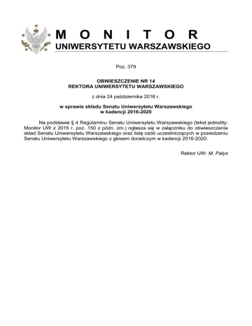 M O N I T O R UNIWERSYTETU WARSZAWSKIEGO Poz. 379 OBWIESZCZENIE NR 14 REKTORA UNIWERSYTETU WARSZAWSKIEGO z dnia 24 października 2016 r. w sprawie składu Senatu Uniwersytetu Warszawskiego w kadencji 2016-2020 Na podstawie § 4 Regulaminu Senatu Uniwersytetu Warszawskiego (tekst jednolity: Monitor UW z 2015 r. poz. 150 z późn. zm.) ogłasza się w załączniku do obwieszczenia skład Senatu Uniwersytetu Warszawskiego oraz listę osób uczestniczących w posiedzeniu Senatu Uniwersytetu Warszawskiego z głosem doradczym w kadencji 2016-2020. Rektor UW: M. Pałys Załącznik do obwieszczenia nr 14 Rektora Uniwersytetu Warszawskiego z dnia 24 października 2016 r. w sprawie ogłoszenia składu Senatu Uniwersytetu Warszawskiego oraz listy osób uczestniczących w posiedzeniu Senatu Uniwersytetu Warszawskiego z głosem doradczym w kadencji 2016-2020 SKŁAD SENATU UNIWERSYTETU WARSZAWSKIEGO ORAZ LISTA OSÓB UCZESTNICZĄCYCH W POSIEDZENIU SENATU UNIWERSYTETU WARSZAWSKIEGO Z GŁOSEM DORADCZYM W KADENCJI 2016-2020 1. Rektor 1) dr hab. Marcin Pałys, prof. UW 2. Prorektorzy 2) dr hab. Jolanta Choińska-Mika, prof. UW do spraw studentów i jakości kształcenia 3) dr hab. Maciej Duszczyk do spraw naukowych 4) dr hab. Anna Giza-Poleszczuk, prof. UW do spraw rozwoju 5) prof. dr hab. Andrzej Tarlecki do spraw kadrowych i polityki finansowej 3. Dziekani 6) dr hab. Robert Sucharski, prof. UW Wydział „Artes Liberales” 7) prof. dr hab. Agnieszka Mostowska Wydział Biologii 8) dr hab. Andrzej Kudelski, prof. UW Wydział Chemii 9) prof. dr hab. Janusz Adamowski Wydział Dziennikarstwa, Informacji i Bibliogii 10) dr hab. Mieszko Tałasiewicz, prof. UW Wydział Filozofii i Socjologii 11) prof. dr hab. Dariusz Wasik Wydział Fizyki 12) prof. dr hab. Maciej Jędrusik Wydział Geografii i Studiów Regionalnych 13) dr hab. Ewa Krogulec, prof. UW Wydział Geologii 14) dr hab. Małgorzata Karpińska, prof. UW Wydział Historyczny 15) prof. dr hab. Sambor Grucza Wydział Lingwistyki Stosowanej 16) prof. dr hab. Paweł Strzelecki Wydział Matematyki, Informatyki i Mechaniki 17) prof. dr hab. Jan Jakub Michałek Wydział Nauk Ekonomicznych 18) dr hab. Stanisław Sulowski, prof. UW 19) prof. dr hab. Maria Dakowska Wydział Nauk Politycznych i Studiów Międzynarodowych Wydział Neofilologii 20) prof. dr hab. Piotr Taracha Wydział Orientalistyczny 21) prof. dr hab. Anna Wiłkomirska Wydział Pedagogiczny 22) prof. dr hab. Zbigniew Greń Wydział Polonistyki 23) prof. dr hab. Tomasz Giaro Wydział Prawa i Administracji 24) dr hab. Dominika Maison, prof. UW Wydział Psychologii 25) dr hab. Wojciech Pawlik, prof. UW Wydział Stosowanych Nauk Społecznych i Resocjalizacji Wydział Zarządzania 26) prof. dr hab. Alojzy Zbigniew Nowak 2 4. Przedstawiciele samodzielnych nauczycieli akademickich 27) prof. dr hab. Ewa Czerniawska Wydział Psychologii 28) prof. dr hab. Marian Górski Wydział Zarządzania 29) prof. dr hab. Paweł Kulesza Wydział Chemii 30) prof. dr hab. Roman Kuźniar 31) prof. dr hab. Zbigniew Marciniak Wydział Nauk Politycznych i Studiów Międzynarodowych Wydział Matematyki, Informatyki i Mechaniki 32) prof. dr hab. Andrzej Markowski Wydział Polonistyki 33) prof. dr hab. Paweł Sowiński Wydział Biologii 34) prof. dr hab. Paweł Swianiewicz Wydział Geografii i Studiów Regionalnych 35) prof. dr hab. Aleksander F. Żarnecki Wydział Fizyki 36) prof. dr hab. Tomasz Żylicz Wydział Nauk Ekonomicznych 5. Przedstawiciele innych nauczycieli akademickich 38) dr Jarosław Górski Wydział Nauk Politycznych i Studiów Międzynarodowych Wydział Nauk Ekonomicznych 39) dr Filip Kawczyński Wydział Filozofii i Socjologii 40) dr Janina Mincer-Daszkiewicz Wydział Matematyki, Informatyki i Mechaniki 41) dr Adam Płoszaj Instytut Ameryk i Europy 42) mgr Jolanta Urbanik Szkoła Języków Obcych 43) dr Hanna Werblan-Jakubiec Wydział Biologii 44) mgr Alicja Wleciał Studium Wychowania Fizycznego i Sportu 45) dr Tomasz Wroczyński Wydział Polonistyki 46) dr Mariola Zalewska Wydział Zarządzania 37) dr Seweryn Dmowski 6. Przedstawiciel doktorantów 47) mgr Kamil Mieszkowski – Przewodniczący Zarządu Samorządu Doktorantów UW 7. Przedstawiciele studentów 48) Marcin Osiński – Marszałek Parlamentu Studentów UW 49) Maja Matuszewska – Przewodnicząca Zarządu Samorządu Studentów UW 50) Mieszko Czerniawski Wydział Zarządzania Wydział Geografii i Studiów Regionalnych Wydział Zarządzania Wydział Nauk Politycznych i Studiów Międzynarodowych Wydział Zarządzania 51) Adam Harchi 53) Anna Krupa Kolegium Międzyobszarowych Indywidualnych Studiów Humanistycznych i Społecznych Wydział Lingwistyki Stosowanej 54) Piotr Połowniak Wydział Prawa i Administracji 55) Maxymilian Rybczyński Wydział Prawa i Administracji 56) Rafał Smoleń Kolegium Międzyobszarowych Indywidualnych Studiów Humanistycznych i Społecznych 52) Monika Helak 3 58) Piotr Włodarczyk Wydział Stosowanych Nauk Społecznych i Resocjalizacji Wydział Geografii i Studiów Regionalnych 59) Diana Zagrodzka Wydział Filozofii i Socjologii 57) Julia Sobolewska 8. Przedstawiciele pracowników niebędących nauczycielami akademickimi 60) mgr inż. arch. Andrzej Alinkiewicz Biuro ds. Nieruchomości 61) mgr Izabela Grzesiuk Kwestura 62) dr Magdalena Sobolewska-Bereza 63) mgr Maciej Tygielski Wydział Biologii Wydział Stosowanych Nauk Społecznych i Resocjalizacji 9. Uczestnicy posiedzeń Senatu z głosem doradczym 64) mgr inż. Jerzy Pieszczurykow Kanclerz 65) mgr Ewa Mikłaszewicz Kwestor 66) dr hab. Jolanta Talbierska Dyrektor Biblioteki Uniwersyteckiej w Warszawie Przedstawiciel Komisji Zakładowej NSZZ „Solidarność” 68) dr hab. Małgorzata Semczuk-Jurska, prof. UW Przedstawiciel Rady Zakładowej ZNP 67) prof. dr hab. Mariusz Ziółkowski 10.Stali goście Senatu 69) prof. dr hab. Marek Wąsowicz Przewodniczący Uniwersyteckiej Komisji Akredytacyjnej Rzecznik Prasowy UW Kierownik Biura Spraw Pracowniczych 70) mgr Anna Korzekwa 71) 