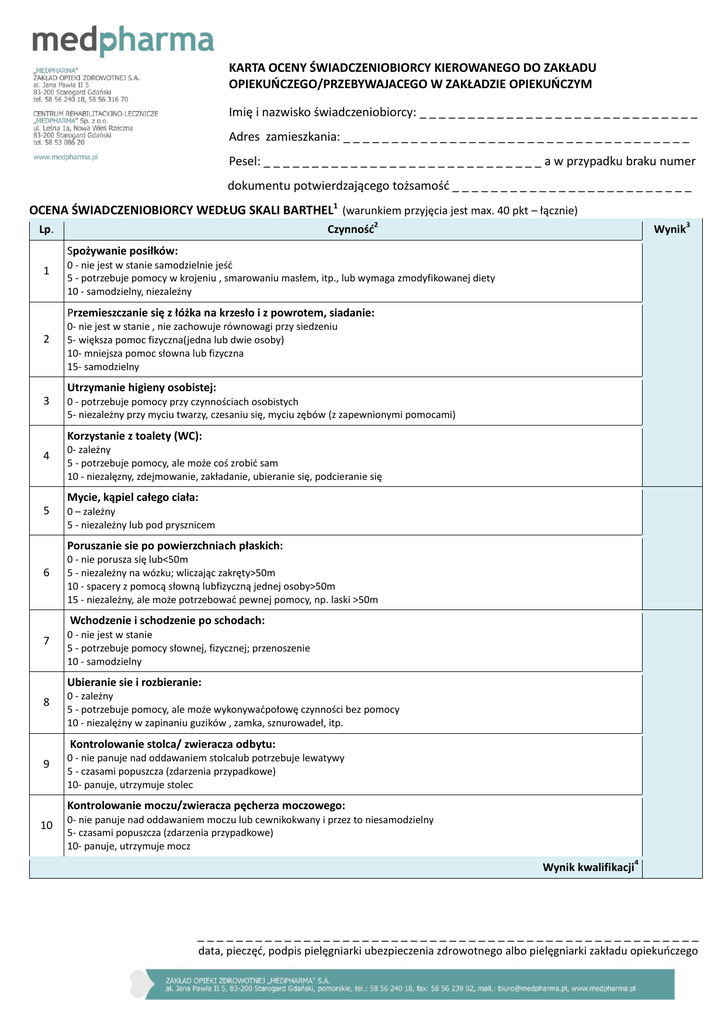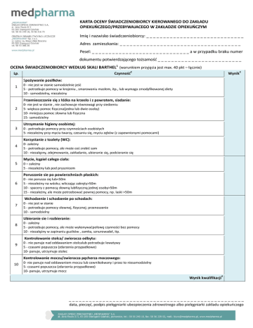 KARTA OCENY ŚWIADCZENIOBIORCY KIEROWANEGO DO ZAKŁADU OPIEKUŃCZEGO/PRZEBYWAJACEGO W ZAKŁADZIE OPIEKUŃCZYM Imię i nazwisko świadczeniobiorcy: _ _ _ _ _ _ _ _ _ _ _ _ _ _ _ _ _ _ _ _ _ _ _ _ _ _ _ _ _ Adres zamieszkania: _ _ _ _ _ _ _ _ _ _ _ _ _ _ _ _ _ _ _ _ _ _ _ _ _ _ _ _ _ _ _ _ _ _ _ _ Pesel: _ _ _ _ _ _ _ _ _ _ _ _ _ _ _ _ _ _ _ _ _ _ _ _ _ _ _ _ _ a w przypadku braku numer dokumentu potwierdzającego tożsamość _ _ _ _ _ _ _ _ _ _ _ _ _ _ _ _ _ _ _ _ _ _ _ _ _ OCENA ŚWIADCZENIOBIORCY WEDŁUG SKALI BARTHEL1 (warunkiem przyjęcia jest max. 40 pkt – łącznie) Lp. Czynność 2 Wynik 3 Spożywanie posiłków: 1 0 - nie jest w stanie samodzielnie jeść 5 - potrzebuje pomocy w krojeniu , smarowaniu masłem, itp., lub wymaga zmodyfikowanej diety 10 - samodzielny, niezależny Przemieszczanie się z łóżka na krzesło i z powrotem, siadanie: 2 0- nie jest w stanie , nie zachowuje równowagi przy siedzeniu 5- większa pomoc fizyczna(jedna lub dwie osoby) 10- mniejsza pomoc słowna lub fizyczna 15- samodzielny Utrzymanie higieny osobistej: 3 0 - potrzebuje pomocy przy czynnościach osobistych 5- niezależny przy myciu twarzy, czesaniu się, myciu zębów (z zapewnionymi pomocami) Korzystanie z toalety (WC): 4 0- zależny 5 - potrzebuje pomocy, ale może coś zrobić sam 10 - niezalęzny, zdejmowanie, zakładanie, ubieranie się, podcieranie się Mycie, kąpiel całego ciała: 5 0 – zależny 5 - niezależny lub pod prysznicem Poruszanie sie po powierzchniach płaskich: 6 0 - nie porusza się lub<50m 5 - niezależny na wózku; wliczając zakręty>50m 10 - spacery z pomocą słowną lubfizyczną jednej osoby>50m 15 - niezależny, ale może potrzebować pewnej pomocy, np. laski >50m Wchodzenie i schodzenie po schodach: 7 0 - nie jest w stanie 5 - potrzebuje pomocy słownej, fizycznej; przenoszenie 10 - samodzielny Ubieranie sie i rozbieranie: 8 0 - zależny 5 - potrzebuje pomocy, ale może wykonywaćpołowę czynności bez pomocy 10 - niezalężny w zapinaniu guzików , zamka, sznurowadeł, itp. Kontrolowanie stolca/ zwieracza odbytu: 9 0 - nie panuje nad oddawaniem stolcalub potrzebuje lewatywy 5 - czasami popuszcza (zdarzenia przypadkowe) 10- panuje, utrzymuje stolec Kontrolowanie moczu/zwieracza pęcherza moczowego: 10 0- nie panuje nad oddawaniem moczu lub cewnikokwany i przez to niesamodzielny 5- czasami popuszcza (zdarzenia przypadkowe) 10- panuje, utrzymuje mocz Wynik kwalifikacji 4 ____________________________________________________ data, pieczęć, podpis pielęgniarki ubezpieczenia zdrowotnego albo pielęgniarki zakładu opiekuńczego Wynik oceny stanu zdrowia: Stwierdzam, że wyżej wymieniona osoba wymaga/ nie wymaga5 skierowania do zakładu opiekuńczego/ dalszego pobytu w zakładzie opiekuńczym. UWAGI: _____________________________________________________________ _____________________________________________________________ _____________________________________________________________ _____________________________________________________________ _____________________________________________________________ ____________________________________________________ data, pieczęć, podpis lekarza ubezpieczenia zdrowotnego albo pielęgniarki zakładu opiekuńczego ______________________________________________ 1 Mahoney FI, Barthel D. „Badanie funkcjonalne: Wskaźnik Barthel”. Maryland State Med. Journal 1965; 14:56-61. Wykorzystane za zgodą. Skala ta może być używana bez ograniczeń dla celów niekomercyjnych. 2 w lp. 1-10 należy wybrać i podkreślić jedną z możliwości najlepiej opisującą stan świadczeniobiorcy 3 należy wpisać wartość punktową przypisaną wybranej możliwości 4 należy wpisać uzyskaną sumę punktów 5 niepotrzebne skreślić