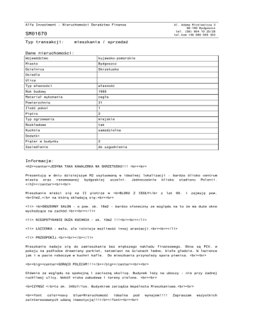 Alfa Investment - Nieruchomości Doradztwo Finanse Al. Adama Mickiewicza 3 88-100 Bydgoszcz tel. (56) 664 10 25/26 tel.kom +48 888 658 303 SM01670 Typ transakcji: mieszkania / sprzedaż Dane nieruchomości: Województwo kujawsko-pomorskie Miasto Bydgoszcz Dzielnica Skrzetusko Osiedle Ulica Typ własności własność Rok budowy 1960 Materiał wykonania cegła Powierzchnia 31 Ilość pokoi 1 Piętro 2 Typ ogrzewania miejskie Rozkładowe tak Kuchnia samodzielna Dodatki Pięter w budynku 2 Zasiedlenie do uzgodnienia Informacje: <h2><center>JEDYNA TAKA KAWALERKA NA SKRZETUSKU!!! <br><br> Prezentuję w dniu dzisiejszym M2 usytuowaną w idealnej lokalizacji - bardzo blisko centrum miasta oraz renomowanej bydgoskiej uczelni. Jednocześnie blisko stadionu Polonii. </h2></center><br><br> Mieszkanie mieści się na II pietrze w <b>BLOKU <b>31m2,</b> na którą składają się:<br><br> Z CEGŁY</b> z lat 60. i zajmuję pow. <li> <b>OBSZERNY SALON - o pow. ok. 18m2 - bardzo słoneczny ze względu na to że ma duże okno wychodzące na zachód.<br><br></li> <li> NIESPOTYKANIE DUŻA KUCHNIA - ok. 10m2 !!!<br><br></li> <li> ŁAZIENKA - mała, ale istnieje możliwość innej aranżacji.<br><br></li> <li> PRZEDPOKÓJ.<br><br></b></li> Mieszkanie nadaje się do zamieszkania bez większego nakładu finansowego. Okna są PCV, w pokoju na podłodze drewniany parkiet, natomiast na ścianach ładne, białe gładzie. W łazience jak i w pasie roboczym w kuchni kafle. Do mieszkania przynależy spora piwnica. <br><br> <b><big><center>GORĄCO POLECAM!!!</b></big></center><br><br> Głównie ze względu na spokojną i zaciszną okolicę. Budynek leży na uboczy - nie przy żadnej ruchliwej ulicy. Wokół niska zabudowa i tereny zielone. <br><br> <b>CZYNSZ </b>to ok. 340zł/1os. Budynkiem zarządza Wspólnota Mieszkaniowa.<br><br> <b><font color=navy blue>Nieruchomość idealna pod zainteresowanych udaną inwestycją!!!</b></font><br><br> wynajem!!!! Zapraszam wszystkich <hr/> Serdecznie zapraszam na prezentację mieszkania, z przyjemnością odpowiem Państwu na wszelkie pytania oraz udzielę dodatkowych informacji.<br><br> <b>Natalia Szubert tel. 883 590 466, [email protected] </b><br><br> Pośrednik odpowiedzialny zawodowo: nieruchomościami 7432 Andrzej Pamin <br><br> Paweł Dawidowicz licencja pośrednika w obrocie licencja pośrednika w obrocie nieruchomościami 1145 UWAGA!!! BEZPŁATNIE POMAGAMY W UZYSKANIU KREDYTU NA ZAKUP NIERUCHOMOŚCI. WSPÓŁPRACUJEMY Z WIELOMA BANKAMI. <br><br> Treść niniejszego ogłoszenia nie stanowi oferty handlowej w rozumieniu przepisów Kodeksu Cywilnego.<br><br> Więcej ofert na www.alfa-investment.pl ZAPRASZAMY Cena: 125 000 PLN Dokument wygenerowany ze strony www.alfa-investment.pl Strona 2