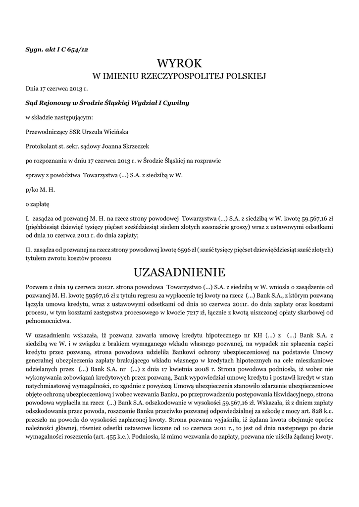 Sygn. akt I C 654/12 WYROK W IMIENIU RZECZYPOSPOLITEJ POLSKIEJ Dnia 17 czerwca 2013 r. Sąd Rejonowy w Środzie Śląskiej Wydział I Cywilny w składzie następującym: Przewodniczący SSR Urszula Wicińska Protokolant st. sekr. sądowy Joanna Skrzeczek po rozpoznaniu w dniu 17 czerwca 2013 r. w Środzie Śląskiej na rozprawie sprawy z powództwa Towarzystwa (...) S.A. z siedzibą w W. p/ko M. H. o zapłatę I. zasądza od pozwanej M. H. na rzecz strony powodowej Towarzystwa (...) S.A. z siedzibą w W. kwotę 59.567,16 zł (pięćdziesiąt dziewięć tysięcy pięćset sześćdziesiąt siedem złotych szesnaście groszy) wraz z ustawowymi odsetkami od dnia 10 czerwca 2011 r. do dnia zapłaty; II. zasądza od pozwanej na rzecz strony powodowej kwotę 6596 zł ( sześć tysięcy pięćset dziewięćdziesiąt sześć złotych) tytułem zwrotu kosztów procesu UZASADNIENIE Pozwem z dnia 19 czerwca 2012r. strona powodowa Towarzystwo (...) S.A. z siedzibą w W. wniosła o zasądzenie od pozwanej M. H. kwotę 59567,16 zł z tytułu regresu za wypłacenie tej kwoty na rzecz (...) Bank S.A., z którym pozwaną łączyła umowa kredytu, wraz z ustawowymi odsetkami od dnia 10 czerwca 2011r. do dnia zapłaty oraz kosztami procesu, w tym kosztami zastępstwa procesowego w kwocie 7217 zł, łącznie z kwotą uiszczonej opłaty skarbowej od pełnomocnictwa. W uzasadnieniu wskazała, iż pozwana zawarła umowę kredytu hipotecznego nr KH (...) z (...) Bank S.A. z siedzibą we W. i w związku z brakiem wymaganego wkładu własnego pozwanej, na wypadek nie spłacenia części kredytu przez pozwaną, strona powodowa udzieliła Bankowi ochrony ubezpieczeniowej na podstawie Umowy generalnej ubezpieczenia zapłaty brakującego wkładu własnego w kredytach hipotecznych na cele mieszkaniowe udzielanych przez (...) Bank S.A. nr (...) z dnia 17 kwietnia 2008 r. Strona powodowa podniosła, iż wobec nie wykonywania zobowiązań kredytowych przez pozwaną, Bank wypowiedział umowę kredytu i postawił kredyt w stan natychmiastowej wymagalności, co zgodnie z powyższą Umową ubezpieczenia stanowiło zdarzenie ubezpieczeniowe objęte ochroną ubezpieczeniową i wobec wezwania Banku, po przeprowadzeniu postępowania likwidacyjnego, strona powodowa wypłaciła na rzecz (...) Bank S.A. odszkodowanie w wysokości 59.567,16 zł. Wskazała, iż z dniem zapłaty odszkodowania przez powoda, roszczenie Banku przeciwko pozwanej odpowiedzialnej za szkodę z mocy art. 828 k.c. przeszło na powoda do wysokości zapłaconej kwoty. Strona pozwana wyjaśniła, iż żądana kwota obejmuje oprócz należności głównej, również odsetki ustawowe liczone od 10 czerwca 2011 r., to jest od dnia następnego po dacie wymagalności roszczenia (art. 455 k.c.). Podniosła, iż mimo wezwania do zapłaty, pozwana nie uiściła żądanej kwoty. W dniu 27 sierpnia 2012 r. Sąd Rejonowy w Środzie Śląskiej w sprawie sygn. I Nc (...)wydał nakaz zapłaty w postępowaniu upominawczym. W sprzeciwie od nakazu zapłaty pozwana M. H. potwierdziła, iż w związku z dopuszczalnym przez Bank brakiem wymaganego wkładu własnego, strona powodowa udzieliła Bankowi ubezpieczenia brakującego wkładu własnego polisą o numerze (...) na wypadek braku spłaty części kredytu hipotecznego przez pozwaną. Przyznała, iż zaprzestała spłacania zaciągniętego kredytu, tłumacząc to bardzo trudną sytuacją życiową, finansową i zawodową, i mimo prób porozumienia się z kredytodawcą, Bank wypowiedział umowę, jednocześnie występując do ubezpieczyciela o wypłatę odszkodowania. Pozwana zarzuciła, iż Bank prowadzi przeciwko niej egzekucję całości kredytu hipotecznego, pomniejszonego jedynie o kapitał spłacony do dnia rozwiązania umowy. Podniosła, iż strona powodowa likwidując szkodę, powinna ustalić wszelkie okoliczności sprawy, w tym także to, czy dochodzona przez Bank kwota nie jest już przedmiotem postępowania egzekucyjnego. Zarzuciła iż ona spłaca już pełną kwotę zaciągniętego kredytu wobec Banku przez potrącenia dokonywane w egzekucji, a ponadto, skoro ona wpłaciła całą składkę ubezpieczeniową, to winna od ubezpieczyciela otrzymać przedmiotowe odszkodowanie, które następnie przekazałaby Bankowi. W odpowiedzi na sprzeciw z dnia 3 grudnia 2012 r. strona powodowa podniosła, iż pozwana nie była stroną umowy ubezpieczenia, a były nimi: Bank, jako ubezpieczony i ubezpieczający, oraz strona powodowa, jako ubezpieczyciel, nie ma zatem znaczenia to, że ostatecznie obowiązek zapłacenia składki ubezpieczeniowej został przerzucony na pozwaną, będącą stroną umowy kredytu zawartej z Bankiem, gdyż przez jej zapłatę pozwana nie stała się stroną stosunku ubezpieczenia. Ponadto wskazała, iż stosunek ubezpieczeniowy między stroną powodową a Bankiem służy ochronie Banku (ubezpieczonego) od zdarzeń przyszłych i niepewnych (zdarzenie ubezpieczeniowe) i dlatego, że pozwana nie mogłaby być osobą ubezpieczoną, gdyż to ona miała wpływ na spłatę kredytu i zaistnienie takiego zdarzenia ubezpieczeniowego. Strona powodowa zaprzeczyła jakoby Bank dochodził od pozwanej całości kwoty zadłużenia, w tym również dochodzonej w niniejszym postępowaniu, zaznaczając jednocześnie iż wypłata przez stronę powodową odszkodowania zaspokoiła tylko część roszczeń Banku z umowy kredytu. Sąd ustalił następujący stan faktyczny: Stronę powodową Towarzystwo (...) S.A. z siedzibą w (...) Bank S.A. z siedzibą we W. łączy umowa ubezpieczenia zapłaty brakującego wkładu własnego w kredytach hipotecznych na cele mieszkaniowe zawarta w dniu 17 kwietnia 2008 r. na czas nieokreślony. Jest to umowa generalna obejmująca swym przedmiotem wszystkie umowy kredytu zawarte w okresie obowiązywania umowy ubezpieczenia, w przypadku których kredytobiorca nie wniósł całości lub części wkładu własnego wymaganego przez (...) Bank S.A. na podstawie procedur bankowych do wysokości 70000 z