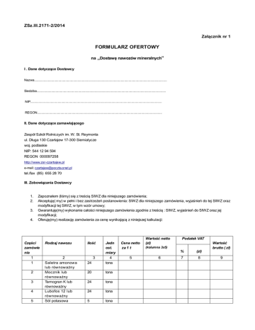 ZSz.III.2171-2/2014 Załącznik nr 1 FORMULARZ OFERTOWY na ,,Dostawę nawozów mineralnych” I . Dane dotyczące Dostawcy Nazwa......................................................................................................................................................... Siedziba..................................................................................................................................................... NIP........................................................................................................................................................ REGON................................................................................................................................................ II. Dane dotyczące zamawiającego Zespół Szkół Rolniczych im. W. St. Reymonta ul. Długa 130 Czartajew 17-300 Siemiatycze woj. podlaskie NIP: 544 12 94 594 REGON 000097258 http://www.zsr-czartajew.pl e-mail: [email protected] tel./fax (85) 655 28 70 III. Zobowiązania Dostawcy 1. 2. 3. 4. Zapoznałem (liśmy) się z treścią SIWZ dla niniejszego zamówienia; Akceptuję( my) w pełni i bez zastrzeżeń postanowienia: SIWZ dla niniejszego zamówienia, wyjaśnień do tej SIWZ oraz modyfikacji tej SIWZ, w tym wzór umowy; Gwarantuję(my) wykonanie całości niniejszego zamówienia zgodnie z treścią : SIWZ, wyjaśnień do SIWZ oraz jej modyfikacji; Oferuję(my) realizację zamówienia za cenę wynikającą z niniejszej kalkulacji: Części zamówie nia 1 1 2 3 4 5 Rodzaj nawozu 2 Saletra amonowa lub równoważny Mocznik lub równoważny Tarnogran K lub równoważny Lubofos 12 lub równoważny Sól potasowa Ilość 24 Jedn ost. miary 4 tona 20 tona 24 tona 24 tona 5 tona 3 Cena netto za 1 t 5 Wartość netto (zł) Podatek VAT (kolumna 3x5) 6 % (zł) 7 8 Wartość brutto ( zł) 9 granulowana lub równoważny Siarczan magnezu siedmiowodny lub równoważny Nawóz granulowany Sulfammo 23 N PRO lub równoważny Nawóz granulowany Physio-Mescal G 18 lub równoważny Nawóz mikrogranulat Pinkstart lub równoważny Nawóz mikrogranulat Microstar PZ Max lub równoważny 6 7 8 9 10 1 tona 5,4 tona 3 tona 100 kg 140 kg Oferuję(my) nawóz z terminem przydatności do użycia: 5. Rodzaj nawozu Części zamóweinia 1 2 3 4 5 6 7 8 9 10 Termin przydatności nawozu zgodnie z rozdziałem XIII pn. Saletra amonowa lub równoważny Mocznik lub równoważny Tarnogran K lub równoważny Lubofos 12 lub równoważny Sól potasowa granulowana lub równoważny Siarczan magnezu siedmiowodny lub równoważny Nawóz granulowany Sulfammo 23 N PRO lub równoważny Nawóz granulowany Physio-Mescal G 18 lub równoważny Nawóz mikrogranulat Pinkstart lub równoważny Nawóz mikrogranulat Microstar PZ Max lub równoważny Termin płatności nie będzie krótszy niż 14 dni licząc od dnia dostawy towaru; Zapewniam(y) całkowite wykonanie zamówienia w terminie dla części 1,2,3,4,5,6,7,8,9,10 do 15 kwietnia 2015 roku Składam(y) niniejszą ofertę we własnym imieniu/jako Wykonawca w ofercie wspólnej*; Nie uczestniczę(my) w jakiejkolwiek innej ofercie dotyczącej niniejszego zamówienia; Podany w ofercie e-mail____________________oraz faks o numerze____________________będą utrzymywane w gotowości do transmisji przez okres trwania postępowania; 11. Znane są mi(nam) wymagania Zamawiającego, a cena oferty zawiera wszystkie koszty, jakie Zamawiający, poniesie w realizacji zamówienia *- niepotrzebne skreślić 6. 7. 8. 9. 10. Podpis(y) (podpis*, miejscowość, data *Podpis(y) i pieczątka(i) imienna(e)osoby(osób) upełnomocnionej(ych) do reprezentowania wykonawcy zgodnie z: a) zapisami w dokumencie stwierdzającym status prawny wykonawcy ( odpis z właściwego rejestru lub zaświadczenie o wpisie do ewidencji działalności gospodarczej lub pełnomocnictwem wchodzącym w skład oferty
