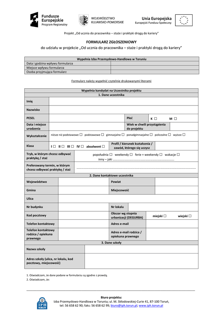 Projekt „Od ucznia do pracownika – staże i praktyki drogą do kariery” FORMULARZ ZGŁOSZENIOWY do udziału w projekcie „Od ucznia do pracownika – staże i praktyki drogą do kariery” Wypełnia Izba Przemysłowo-Handlowa w Toruniu Data i godzina wpływu formularza Miejsce wpływu formularza Osoba przyjmująca formularz Formularz należy wypełnić czytelnie drukowanymi literami Wypełnia kandydat na Uczestnika projektu 1. Dane uczestnika Imię Nazwisko □ PESEL Płeć Data i miejsce urodzenia Wiek w chwili przystąpienia do projektu □ podstawowe □ Wykształcenie niższe niż podstawowe Klasa I □ II □ III □ IV □ absolwent □ gimnazjalne □ ponadgimnazjalne K □ policealne M □ □ wyższe □ Profil / kierunek kształcenia / zawód, którego się uczysz Tryb, w którym chcesz odbywać praktykę / staż popołudnia □ weekendy □ ferie + weekendy □ wakacje □ inny – jaki ……………………………………………………………………. Preferowany termin, w którym chcesz odbywać praktykę / staż ………………………………………………………………………………………………………………………………………. 2. Dane kontaktowe uczestnika Województwo Powiat Gmina Miejscowość Ulica Nr budynku Nr lokalu Kod pocztowy Obszar wg stopnia urbanizacji (DEGURBA) Telefon kontaktowy Adres e-mail Telefon kontaktowy rodzica / opiekuna prawnego Adres e-mail rodzica / opiekuna prawnego miejski □ wiejski □ 3. Dane szkoły Nazwa szkoły Adres szkoły (ulica, nr lokalu, kod pocztowy, miejscowość) 1. Oświadczam, że dane podane w formularzu są zgodne z prawdą. 2. Oświadczam, że: _________________________________________________________________________________________________________________ Biuro projektu: Izba Przemysłowo-Handlowa w Toruniu; ul. M. Skłodowskiej-Curie 41, 87-100 Toruń, tel: 56 658 62 90; faks: 56 658 62 99; [email protected]; www.iph.torun.pl Projekt „Od ucznia do pracownika – staże i praktyki drogą do kariery” - zostałem/am poinformowany/na, iż projekt jest współfinansowany ze środków Unii Europejskiej w ramach Europejskiego Funduszu Społecznego, - zapoznałem/ łam się z regulaminem uczestnictwa w projekcie, - zgłaszam chęć uczestnictwa w projekcie dobrowolnie, - nie korzystam ze wsparcia w formie praktyk i staży u pracodawców w innych projektach w ramach Osi Priorytetowej 10 Innowacyjna Edukacja RPO WKP 2014-2020. OŚWIADCZENIE UCZESTNIKA PROJEKTU W związku z przystąpieniem do projektu pn. Od ucznia do pracownika – staże i praktyki drogą do kariery oświadczam, że przyjmuję do wiadomości, iż: 1. Administratorem moich danych osobowych jest Marszałek Województwa Kujawsko-Pomorskiego pełniący funkcję Instytucji Zarządzającej dla Regionalnego Programu Operacyjnego Województwa Kujawsko-Pomorskiego 2014-2020, mający siedzibę przy Placu Teatralnym 2, 87-100 Toruń (w odniesieniu do zbioru Regionalny Programu Operacyjnego Województwa KujawskoPomorskiego 2014-2020) oraz Minister Infrastruktury i Rozwoju na mocy art. 71 ustawy z dnia 11 lipca 2014 r. o zasadach realizacji programów w zakresie polityki spójności finansowanych w perspektywie finansowej 2014-2020, mający siedzibę przy ul. Wspólnej 2/4, 00-926 Warszawa (w odniesieniu do zbioru Centralny system teleinformatyczny). 2. Podstawę prawną przetwarzania moich danych osobowych stanowi art. 23 ust. 1 pkt 2 lub art. 27 ust. 2 pkt 2 ustawy z dnia 29 sierpnia 1997 r. o ochronie danych osobowych ( Dz. U. z 2014 r. poz. 1182, z późn. zm.) – dane osobowe są niezbędne dla realizacji Regionalnego Programu Operacyjnego Województwa Kujawsko-Pomorskiego 2014-2020 (RPO WKP) na podstawie: 1) w odniesieniu do zbioru Regionalny Programu Operacyjnego Województwa KujawskoPomorskiego 2014-2020: a) rozporządzenia Parlamentu Europejskiego i Rady (UE) nr 1303/2013 z dnia 17 grudnia 2013 r. ustanawiającego wspólne przepisy dotyczące Europejskiego Funduszu Rozwoju Regionalnego, Europejskiego Funduszu Społecznego, Funduszu Spójności, Europejskiego Funduszu Rolnego na rzecz Rozwoju Obszarów Wiejskich oraz Europejskiego Funduszu Morskiego i Rybackiego oraz ustanawiającego przepisy ogólne dotyczące Europejskiego Funduszu Rozwoju Regionalnego, Europejskiego Funduszu Społecznego, Funduszu Spójności i Europejskiego Funduszu Morskiego i Rybackiego oraz uchylającego rozporządzenie Rady (WE) nr 1083/2006 (Dz. Urz. UE L 347 z 20.12.2013, str. 320, z późn. zm.), b) rozporządzenia Parlamentu Europejskiego i Rady (UE) nr 1304/2013 z dnia 17 grudnia 2013 r. w sprawie Europejskiego Funduszu Społecznego i uchylającego rozporządzenie Rady (WE) nr 1081/2006 (Dz. Urz. UE L 347 z 20.12.2013, str. 470), c) ustawy z dnia 11 lipca 2014 r. o zasadach realizacji programów w zakresie polityki spójności finansowanych w perspektywie finansowej 2014-2020 (Dz. U. poz. 1146, z późn. zm.); 2) w odniesieniu do zbioru Centralny system teleinformatyczny wspierający realizację programów operacyjnych: a) rozporządzenia Parlamentu Europejskiego i Rady (UE) nr 1303/2013 z dnia 17 grudnia 2013 r. ustanawiającego wspólne przepisy dotyczące Europejskiego Funduszu Rozwoju Regionalnego, Europejskiego Funduszu Społecznego, Funduszu Spójności, Europejskiego Funduszu Rolnego na rzecz Rozwoju Obszarów Wiejskich oraz Europejskiego Funduszu Morskiego i Rybackiego oraz ustanawiającego przepisy ogólne dotyczące Europejskiego Funduszu Rozwoju Regionalnego, Europejskiego Funduszu Społecznego, Funduszu _________________________________________________________________________________________________________________ Biuro projektu: Izba Przemysłowo-Handlowa w Toruniu; ul. M. Skłodowskiej-Curie 41, 87-100 Toruń, tel: 56 658 62 90; faks: 56 658 62 99; [email protected]; www.iph.torun.pl Projekt „Od ucznia do pracownika – staże i praktyki drogą do kariery” 3. 4. 5. 6. 7. 8. Spójności i Europejskiego Funduszu M