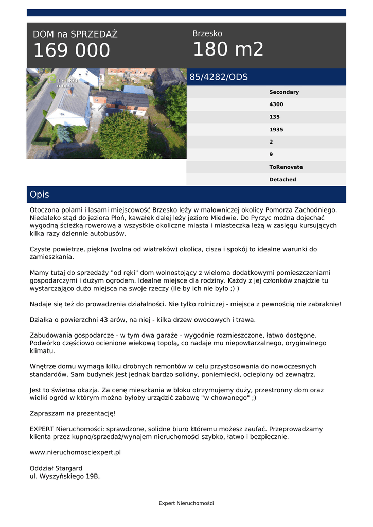 DOM na SPRZEDAŻ 169 000 Brzesko 180 m2 85/4282/ODS Secondary 4300 135 1935 2 9 ToRenovate Detached Opis Otoczona polami i lasami miejscowość Brzesko leży w malowniczej okolicy Pomorza Zachodniego. Niedaleko stąd do jeziora Płoń, kawałek dalej leży jezioro Miedwie. Do Pyrzyc można dojechać wygodną ścieżką rowerową a wszystkie okoliczne miasta i miasteczka leżą w zasięgu kursujących kilka razy dziennie autobusów. Czyste powietrze, piękna (wolna od wiatraków) okolica, cisza i spokój to idealne warunki do zamieszkania. Mamy tutaj do sprzedaży "od ręki" dom wolnostojący z wieloma dodatkowymi pomieszczeniami gospodarczymi i dużym ogrodem. Idealne miejsce dla rodziny. Każdy z jej członków znajdzie tu wystarczająco dużo miejsca na swoje rzeczy (ile by ich nie było ;) ) Nadaje się też do prowadzenia działalności. Nie tylko rolniczej - miejsca z pewnością nie zabraknie! Działka o powierzchni 43 arów, na niej - kilka drzew owocowych i trawa. Zabudowania gospodarcze - w tym dwa garaże - wygodnie rozmieszczone, łatwo dostępne. Podwórko częściowo ocienione wiekową topolą, co nadaje mu niepowtarzalnego, oryginalnego klimatu. Wnętrze domu wymaga kilku drobnych remontów w celu przystosowania do nowoczesnych standardów. Sam budynek jest jednak bardzo solidny, poniemiecki, ocieplony od zewnątrz. Jest to świetna okazja. Za cenę mieszkania w bloku otrzymujemy duży, przestronny dom oraz wielki ogród w którym można byłoby urządzić zabawę "w chowanego" ;) Zapraszam na prezentację! EXPERT Nieruchomości: sprawdzone, solidne biuro któremu możesz zaufać. Przeprowadzamy klienta przez kupno/sprzedaż/wynajem nieruchomości szybko, łatwo i bezpiecznie. www.nieruchomosciexpert.pl Oddział Stargard ul. Wyszyńskiego 19B, Expert Nieruchomości tel. 91 573 25 51 Oddział Pyrzyce ul. Dworcowa 23, tel. 91 831 43 95 Opis nieruchomości ma charakter wyłącznie informacyjny i może podlegać aktualizacji. Powyższy opis nieruchomości nie stanowi oferty określonej w art. 66 Kodeksu Cywilnego a jedynie zaproszenie do rokowań - zgodnie z art. 71 K.C. Iweta Burda tel. 793912111 email: [email protected] Expert Nieruchomości Powered by TCPDF (www.tcpdf.org)