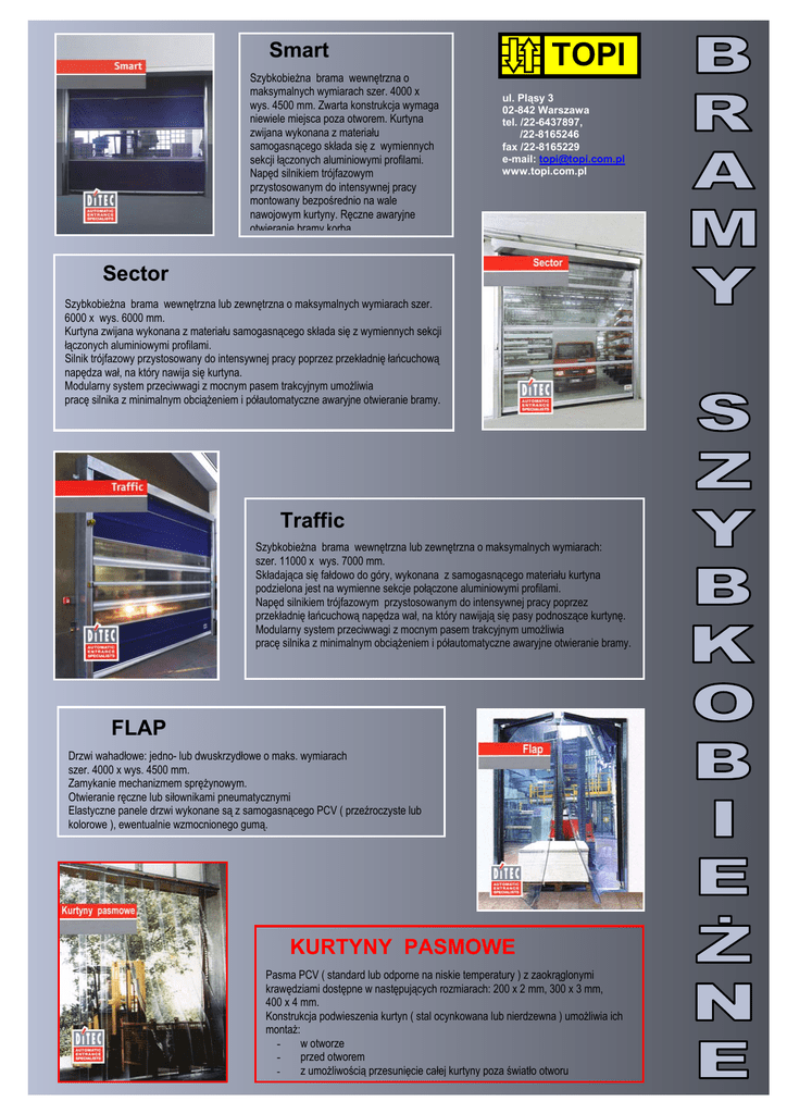 TOPI Smart Szybkobieżna brama wewnętrzna o maksymalnych wymiarach szer. 4000 x wys. 4500 mm. Zwarta konstrukcja wymaga niewiele miejsca poza otworem. Kurtyna zwijana wykonana z materiału samogasnącego składa się z wymiennych sekcji łączonych aluminiowymi profilami. Napęd silnikiem trójfazowym przystosowanym do intensywnej pracy montowany bezpośrednio na wale nawojowym kurtyny. Ręczne awaryjne otwieranie bramy korbą ul. Pląsy 3 02-842 Warszawa tel. /22-6437897, /22-8165246 fax /22-8165229 e-mail: [email protected] www.topi.com.pl Sector Szybkobieżna brama wewnętrzna lub zewnętrzna o maksymalnych wymiarach szer. 6000 x wys. 6000 mm. Kurtyna zwijana wykonana z materiału samogasnącego składa się z wymiennych sekcji łączonych aluminiowymi profilami. Silnik trójfazowy przystosowany do intensywnej pracy poprzez przekładnię łańcuchową napędza wał, na który nawija się kurtyna. Modularny system przeciwwagi z mocnym pasem trakcyjnym umożliwia pracę silnika z minimalnym obciążeniem i półautomatyczne awaryjne otwieranie bramy. Traffic Szybkobieżna brama wewnętrzna lub zewnętrzna o maksymalnych wymiarach: szer. 11000 x wys. 7000 mm. Składająca się fałdowo do góry, wykonana z samogasnącego materiału kurtyna podzielona jest na wymienne sekcje połączone aluminiowymi profilami. Napęd silnikiem trójfazowym przystosowanym do intensywnej pracy poprzez przekładnię łańcuchową napędza wał, na który nawijają się pasy podnoszące kurtynę. Modularny system przeciwwagi z mocnym pasem trakcyjnym umożliwia pracę silnika z minimalnym obciążeniem i półautomatyczne awaryjne otwieranie bramy. FLAP Drzwi wahadłowe: jedno- lub dwuskrzydłowe o maks. wymiarach szer. 4000 x wys. 4500 mm. Zamykanie mechanizmem sprężynowym. Otwieranie ręczne lub siłownikami pneumatycznymi Elastyczne panele drzwi wykonane są z samogasnącego PCV ( przeźroczyste lub kolorowe ), ewentualnie wzmocnionego gumą. KURTYNY PASMOWE Pasma PCV ( standard lub odporne na niskie temperatury ) z zaokrąglonymi krawędziami dostępne w następujących rozmiarach: 200 x 2 mm, 300 x 3 mm, 400 x 4 mm. Konstrukcja podwieszenia kurtyn ( stal ocynkowana lub nierdzewna ) umożliwia ich montaż: w otworze przed otworem z umożliwością przesunięcie całej kurtyny poza światło otworu KURTYNA PASMOWA Opis SPECYFIKACJA TECHNICZNA pasy o zaokrąglonych brzegach z okuciami górnymi, wychylnie zawieszone na stalowej rurze lub „grzebieniu” Kurtyna PVC Wersje tkaniany STANDARD POLAR o Temperatura pracy Przepuszczalność światła % Wersja SUPER POLAR o -15 +50 C -25 +30 C > 80 >70 o -40 +20 C >70 opaskowa ZWW grzebieniowa ZWS Materiał zawieszek stal ocynkowana lub nierdzewna Szerokość pasów/grubość mm Wymiary otworu do montażu bramy 200/2, 300/3 400/4 bez ograniczeń zawieszenie opaskowe: typ ZWW A-pod nadprożem, B-pod belką stalową (za pośrednictwem wieszaków), C-przesuwna na boki na szynie D-przed nadprożem Sposób montażu zawieszenie grzebieniowe: typ ZWS -dowolny montaż listwy wieszakowej w świetle lub poza otworem *za wyjątkiem typu 2/80 RODZAJE KURTYNA PASMOWA ZAWIESZENIE OPASKOWE (WYCHYLNE ZWW) ZAWIESZENIE Maksymalna wysokość otworu Słaby przewiew Silny przewiew Zalecana zasłona wstęgowa wychylna ZWW Wielkość Wielkość zakładki typ wstęg mm % mm 2x80 GRZEBIENIOWE (ZWS) Zalecana zasłona wstęgowa grzebieniowa ZWS Typ ZWS Wielkość zakładki a/b Wielkość wstęg mm % mm 4/5 2x200 80 2x80 2100 2000 2/80 2x200 80 2300 2100 2/60 3x300 60 2x90 4/7 3x300 57 2x85 3000 2300 3/80 3x300 80 2x120 6/7 3x300 86 2x129 3500 3000 3/100 3x300 100 2x150 6/7 3x300 86 2x129 4500 3200 4/60 4x400 60 2x120 6/9 4x400 67 2x134 5000 4000 4/80 4x400 80 2x160 8/9 4x400 89 2x178 TYPY MOCOWAŃ KURTYNY OPASKOWEJ KOLORY KURTYN Standard, Polar, Super Polar –przeźroczysta Spawalnicza – czerwona (tylko 300x3), zielona (tylko 300x3), brązowa (tylko 300 x 2) Standard czerwona – zastosowanie: boczne pasy zasłon Żółta- odstraszająca owady (tylko 200x2 i 300x3) Zastrzegamy sobie możliwość zmian technicznych oraz programu handlowego