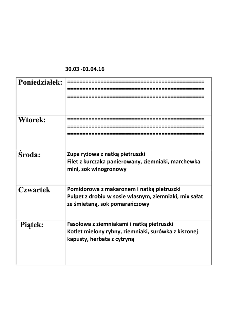 30.03 -01.04.16 Poniedziałek: ============================================= ============================================= ============================================= Wtorek: ============================================= ============================================= ============================================= Środa: Zupa ryżowa z natką pietruszki Filet z kurczaka panierowany, ziemniaki, marchewka mini, sok winogronowy Czwartek Pomidorowa z makaronem i natką pietruszki Pulpet z drobiu w sosie własnym, ziemniaki, mix sałat ze śmietaną, sok pomarańczowy Piątek: Fasolowa z ziemniakami i natką pietruszki Kotlet mielony rybny, ziemniaki, surówka z kiszonej kapusty, herbata z cytryną