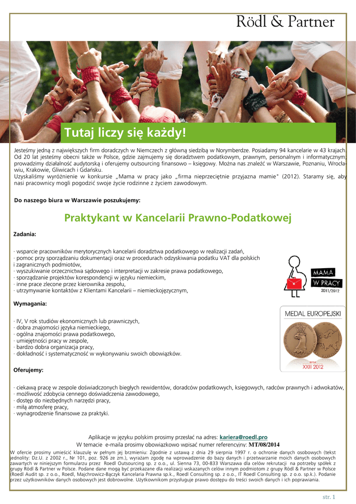 Tutaj liczy się każdy! Jesteśmy jedną z największych firm doradczych w Niemczech z główną siedzibą w Norymberdze. Posiadamy 94 kancelarie w 43 krajach. Od 20 lat jesteśmy obecni także w Polsce, gdzie zajmujemy się doradztwem podatkowym, prawnym, personalnym i informatycznym; prowadzimy działalność audytorską i oferujemy outsourcing finansowo – księgowy. Można nas znaleźć w Warszawie, Poznaniu, Wrocławiu, Krakowie, Gliwicach i Gdańsku. Uzyskaliśmy wyróżnienie w konkursie „Mama w pracy jako „firma nieprzeciętnie przyjazna mamie" (2012). Staramy się, aby nasi pracownicy mogli pogodzić swoje życie rodzinne z życiem zawodowym. Do naszego biura w Warszawie poszukujemy: Praktykant w Kancelarii Prawno-Podatkowej Zadania: · wsparcie pracowników merytorycznych kancelarii doradztwa podatkowego w realizacji zadań, · pomoc przy sporządzaniu dokumentacji oraz w procedurach odzyskiwania podatku VAT dla polskich i zagranicznych podmiotów, · wyszukiwanie orzecznictwa sądowego i interpretacji w zakresie prawa podatkowego, · sporządzanie projektów korespondencji w języku niemieckim, · inne prace zlecone przez kierownika zespołu, · utrzymywanie kontaktów z Klientami Kancelarii – niemieckojęzycznym, Wymagania: · IV, V rok studiów ekonomicznych lub prawniczych, · dobra znajomości języka niemieckiego, · ogólna znajomości prawa podatkowego, · umiejętności pracy w zespole, · bardzo dobra organizacja pracy, · dokładność i systematyczność w wykonywaniu swoich obowiązków. Oferujemy: · ciekawą pracę w zespole doświadczonych biegłych rewidentów, doradców podatkowych, księgowych, radców prawnych i adwokatów, · możliwość zdobycia cennego doświadczenia zawodowego, · dostęp do niezbędnych narzędzi pracy, · miłą atmosferę pracy, · wynagrodzenie finansowe za praktyki. Aplikacje w języku polskim prosimy przesłać na adres: [email protected] W temacie e-maila prosimy obowiązkowo wpisać numer referencyjny: MT/08/2014 W ofercie prosimy umieścić klauzulę w pełnym jej brzmieniu: Zgodnie z ustawą z dnia 29 sierpnia 1997 r. o ochronie danych osobowych (tekst jednolity: Dz.U. z 2002 r., Nr 101, poz. 926 ze zm.), wyrażam zgodę na wprowadzenie do bazy danych i przetwarzanie moich danych osobowych zawartych w niniejszym formularzu przez Roedl Outsourcing sp. z o.o., ul. Sienna 73, 00-833 Warszawa dla celów rekrutacji na potrzeby spółek z grupy Rödl & Partner w Polsce. Podane dane mogą być przekazane dla realizacji wskazanych celów innym podmiotom z grupy Rödl & Partner w Polsce (Roedl Audit sp. z o.o., Roedl, Majchrowicz-Bączyk Kancelaria Prawna sp.k., Roedl Consulting sp. z o.o., IT Roedl Consulting sp. z o.o. sp.k.). Podanie przez użytkowników danych osobowych jest dobrowolne. Użytkownikom przysługuje prawo dostępu do treści swoich danych i ich poprawiania. str. 1