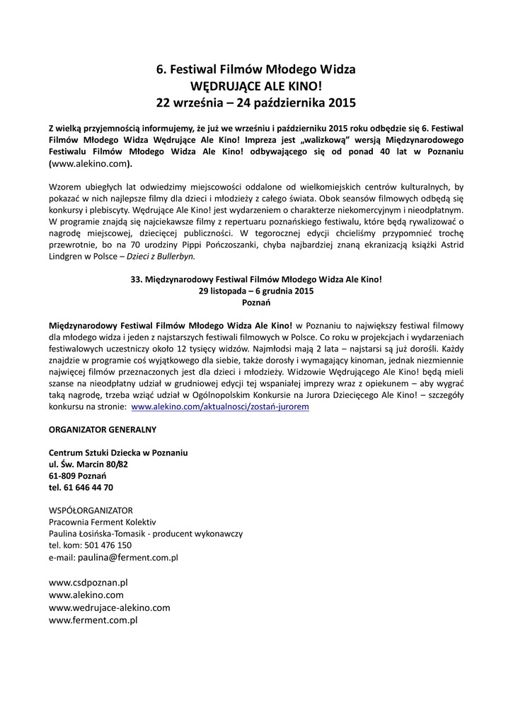 6. Festiwal Filmów Młodego Widza WĘDRUJĄCE ALE KINO! 22 września – 24 października 2015 Z wielką przyjemnością informujemy, że już we wrześniu i październiku 2015 roku odbędzie się 6. Festiwal Filmów Młodego Widza Wędrujące Ale Kino! Impreza jest „walizkową” wersją Międzynarodowego Festiwalu Filmów Młodego Widza Ale Kino! odbywającego się od ponad 40 lat w Poznaniu (www.alekino.com). Wzorem ubiegłych lat odwiedzimy miejscowości oddalone od wielkomiejskich centrów kulturalnych, by pokazać w nich najlepsze filmy dla dzieci i młodzieży z całego świata. Obok seansów filmowych odbędą się konkursy i plebiscyty. Wędrujące Ale Kino! jest wydarzeniem o charakterze niekomercyjnym i nieodpłatnym. W programie znajdą się najciekawsze filmy z repertuaru poznańskiego festiwalu, które będą rywalizować o nagrodę miejscowej, dziecięcej publiczności. W tegorocznej edycji chcieliśmy przypomnieć trochę przewrotnie, bo na 70 urodziny Pippi Pończoszanki, chyba najbardziej znaną ekranizacją książki Astrid Lindgren w Polsce – Dzieci z Bullerbyn. 33. Międzynarodowy Festiwal Filmów Młodego Widza Ale Kino! 29 listopada – 6 grudnia 2015 Poznań Międzynarodowy Festiwal Filmów Młodego Widza Ale Kino! w Poznaniu to największy festiwal filmowy dla młodego widza i jeden z najstarszych festiwali filmowych w Polsce. Co roku w projekcjach i wydarzeniach festiwalowych uczestniczy około 12 tysięcy widzów. Najmłodsi mają 2 lata – najstarsi są już dorośli. Każdy znajdzie w programie coś wyjątkowego dla siebie, także dorosły i wymagający kinoman, jednak niezmiennie najwięcej filmów przeznaczonych jest dla dzieci i młodzieży. Widzowie Wędrującego Ale Kino! będą mieli szanse na nieodpłatny udział w grudniowej edycji tej wspaniałej imprezy wraz z opiekunem – aby wygrać taką nagrodę, trzeba wziąć udział w Ogólnopolskim Konkursie na Jurora Dziecięcego Ale Kino! – szczegóły konkursu na stronie: www.alekino.com/aktualnosci/zostań-jurorem ORGANIZATOR GENERALNY Centrum Sztuki Dziecka w Poznaniu ul. Św. Marcin 80/82 61-809 Poznań tel. 61 646 44 70 WSPÓŁORGANIZATOR Pracownia Ferment Kolektiv Paulina Łosińska-Tomasik - producent wykonawczy tel. kom: 501 476 150 e-mail: [email protected] www.csdpoznan.pl www.alekino.com www.wedrujace-alekino.com www.ferment.com.pl