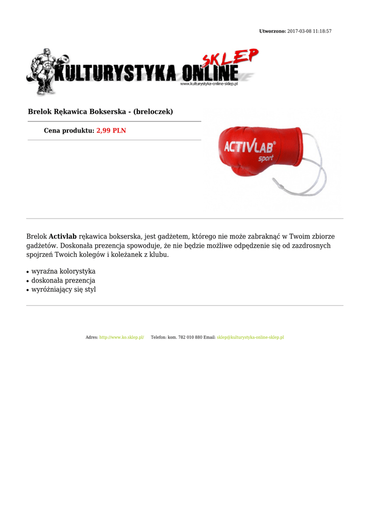 Utworzono: 2017-03-08 11:18:57 Brelok Rękawica Bokserska - (breloczek) Cena produktu: 2,99 PLN Brelok Activlab rękawica bokserska, jest gadżetem, którego nie może zabraknąć w Twoim zbiorze gadżetów. Doskonała prezencja spowoduje, że nie będzie możliwe odpędzenie się od zazdrosnych spojrzeń Twoich kolegów i koleżanek z klubu. ● ● ● wyraźna kolorystyka doskonała prezencja wyróżniający się styl Adres: http://www.ko.sklep.pl/ Telefon: kom. 782 010 880 Email: [email protected]