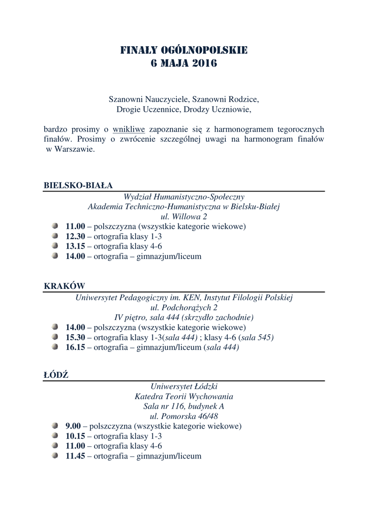 FINAŁY OGÓLNOPOLSKIE 6 MAJA 2016 Szanowni Nauczyciele, Szanowni Rodzice, Drogie Uczennice, Drodzy Uczniowie, bardzo prosimy o wnikliwe zapoznanie się z harmonogramem tegorocznych finałów. Prosimy o zwrócenie szczególnej uwagi na harmonogram finałów w Warszawie. BIELSKO-BIAŁA Wydział Humanistyczno-Społeczny Akademia Techniczno-Humanistyczna w Bielsku-Białej ul. Willowa 2 11.00 – polszczyzna (wszystkie kategorie wiekowe) 12.30 – ortografia klasy 1-3 13.15 – ortografia klasy 4-6 14.00 – ortografia – gimnazjum/liceum KRAKÓW Uniwersytet Pedagogiczny im. KEN, Instytut Filologii Polskiej ul. Podchorążych 2 IV piętro, sala 444 (skrzydło zachodnie) 14.00 – polszczyzna (wszystkie kategorie wiekowe) 15.30 – ortografia klasy 1-3(sala 444) ; klasy 4-6 (sala 545) 16.15 – ortografia – gimnazjum/liceum (sala 444) ŁÓDŹ Uniwersytet Łódzki Katedra Teorii Wychowania Sala nr 116, budynek A ul. Pomorska 46/48 9.00 – polszczyzna (wszystkie kategorie wiekowe) 10.15 – ortografia klasy 1-3 11.00 – ortografia klasy 4-6 11.45 – ortografia – gimnazjum/liceum MALBORK Wydział Zarządzania i Inżynierii WSG w Malborku ul. Sikorskiego 45 11.00 – polszczyzna (wszystkie kategorie wiekowe) 12.30 – ortografia klasy 1-3 13.15 – ortografia klasy 4-6 14.00 – ortografia – gimnazjum/liceum OLSZTYN Uniwersytet Warmińsko-Mazurski w Olsztynie Wydział Humanistyczny, ul. Obitza 1, sala nr 37 11.00 – polszczyzna (wszystkie kategorie wiekowe) 12.30 – ortografia klasy 1-3 13.15 – ortografia klasy 4-6 14.00 – ortografia – gimnazjum/liceum SZCZECIN Uniwersytet Szczeciński, Instytut Pedagogiki ul. Ogińskiego 16/17, sala nr 40 11.00 – polszczyzna (wszystkie kategorie wiekowe) 12.30 – ortografia klasy 1-3 13.15 – ortografia klasy 4-6 14.00 – ortografia – gimnazjum/liceum TORUŃ Biblioteka Uniwersytecka w Toruniu Sala audytoryjna nr 8 ul. Gagarina 13 11.00 – polszczyzna (wszystkie kategorie wiekowe) 12.30 – ortografia klasy 1-3 13.15 – ortografia klasy 4-6 14.00 – ortografia – gimnazjum/liceum LUBLIN Katolicki Uniwersytet Lubelski Jana Pawła II Collegium Jana Pawła II, sala C101 (wejście od ul. H. Łopacińkiego) 11.00 – polszczyzna (wszystkie kategorie wiekowe) 12.30 – ortografia klasy 1-3 13.15 – ortografia klasy 4-6 14.00 – ortografia – gimnazjum/liceum BIAŁYSTOK Niepaństwowa Wyższa Szkoła Pedagogiczna w Białymstoku Al. Jana Pawła II 91, sala obok Rektoratu 11.00 – polszczyzna (wszystkie kategorie wiekowe) 12.30 – ortografia klasy 1-3 13.15 – ortografia klasy 4-6 14.00 – ortografia – gimnazjum/liceum GDAŃSK Gdańska Szkoła Wyższa ul. Wydmy 3 sala nr 5 11.00 – polszczyzna (wszystkie kategorie wiekowe) 12.30 – ortografia klasy 1-3 13.15 – ortografia klasy 4-6 14.00 – ortografia – gimnazjum/liceum POZNAŃ Uniwersytet Adama Mickiewicza w Poznaniu, budynek D, Campus Szamarzewo, Szamarzewskiego 89, sala nr 508 - ortografia 11.00 – polszczyzna (wszystkie kategorie wiekowe) – aula na parterze 12.30 – ortografia klasy 1-3 13.15 – ortografia klasy 4-6 14.00 – ortografia – gimnazjum/liceum WARSZAWA Polska Akademia Nauk (Pałac Staszica), ul. Nowy Świat 72 sala Marii Skłodowskiej-Curie 8.00 – polszczyzna klasy: 4., 5., 6., gimnazjum, liceum, technikum – tylko uczennice i uczniowie ze szkół warszawskich 9.40 – polszczyzna klasy: 1., 2., 3. szkoła podstawowa – tylko uczennice i uczniowie ze szkół warszawskich 11.15 – polszczyzna uczennice i uczniowie spoza szkół warszawskich – wszystkie kategorie wiekowe Ortografia – bez względu na miejsce zamieszkania 12.45 – ortografia klasy 1-3 14.00 – ortografia klasy 4-6 15.15 – ortografia – gimnazjum/liceum