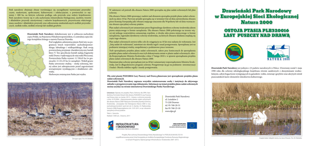 Park narodowy obejmuje obszar wyróżniający się szczególnymi wartościami przyrodniczymi, naukowymi, społecznymi, kulturowymi i edukacyjnymi, o powierzchni co najmniej 1 000 ha, na którym ochronie podlega cała przyroda oraz walory krajobrazowe. Park narodowy tworzy się w celu zachowania różnorodności biologicznej, zasobów, tworów i składników przyrody nieożywionej i walorów krajobrazowych, przywrócenia właściwego stanu zasobów i składników przyrody oraz odtworzenia zniekształconych siedlisk przyrodniczych, siedlisk roślin, siedlisk zwierząt lub siedlisk grzybów. Drawieński Park Narodowy zlokalizowany jest w północno-zachodniej części Polski, na Pojezierzu Południowopomorskim, w centralnej części dużego kompleksu leśnego o nazwie Puszcza Drawska. Pod względem administracyjnym Park leży na pograniczu trzech województw: zachodniopomorskiego, lubuskiego i wielkopolskiego. Park swoją powierzchnią przyjmuje charakterystyczny kształt litery V. Ten specyficzny kształt nadają fragmenty rzeki Drawy i wpływającej do niej rzeki Płocicznej. Powierzchnia Parku wynosi: 11 538,45 ha (w granicach); 11 211,35 ha (w zarządzie). Wokół granic Parku utworzono otulinę – strefę ochronną, której celem jest zabezpieczenie przed zagrożeniami zewnętrznymi wynikającymi z działalności człowieka. Herbowym zwierzęciem Parku jest wydra. W zależności od potrzeb dla obszaru Natura 2000 sporządza się plan zadań ochronnych lub plan ochrony. Dla obszaru Natura 2000 sprawujący nadzór nad obszarem sporządza projekt planu zadań ochronnych na okres 10 lat. Pierwszy projekt sporządza się w terminie 6 lat od dnia zatwierdzenia obszaru przez Komisję Europejską jako obszaru mającego znaczenie dla Wspólnoty lub od dnia wyznaczenia obszaru specjalnej ochrony ptaków. Plan zadań ochronnych jest ustanawiany przez Regionalnego dyrektora ochrony środowiska aktem prawa miejscowego w formie zarządzenia. Dla obszaru Natura 2000 położonego na terenie więcej niż jednego województwa ustanawiają wspólnie, w drodze aktu prawa miejscowego w formie zarządzenia, regionalni dyrektorzy ochrony środowiska, na których obszarze działania znajdują się części tego obszaru. OSTOJA PTASIA PLB320016 LASY PUSZCZY NAD DRAWĄ Plan zadań ochronnych zawiera tylko cele do osiągnięcia na 10 lat oraz zadania do wykonania. Jest „listą zadań do wykonania”, natomiast nie określa reguł i zasad postępowania. Sporządzany jest na podstawie istniejącej wiedzy, uzupełnionej o podstawowe prace terenowe. Tryb sporządzania projektu planu zadań ochronnych, zakres prac koniecznych do sporządzenia projektu planu zadań ochronnych oraz tryb dokonywania zmian w planie zadań ochronnych, określa Rozporządzenie Ministra Środowiska z dnia 17 lutego 2010 r. w sprawie sporządzania projektu planu zadań ochronnych dla obszaru Natura 2000. Natomiast plan ochrony sporządzany jest na 20 lat i ustanawiany rozporządzeniem Ministra Środowiska. Jest to długookresowy program ochrony. Przygotowuje się go na podstawie inwentaryzacji i badań. Określa stabilne reguły i zasady postępowania. Dla ostoi ptasiej PLB320016 Lasy Puszczy nad Drawą planowane jest sporządzenie projektu planu zadań ochronnych. Drawieński Park Narodowy zaprasza wszystkie zainteresowane osoby i instytucje do aktywnego udziału w przygotowywaniu tego dokumentu. Informacje na temat projektu planu zadań ochronnych można uzyskać na stronie internetowej Drawieńskiego Parku Narodowego. Literatura: Operaty do projektu Planu Ochrony dla DPN; Standardowy Formularz Danych dla obszaru PLB320016 Lasy Puszczy nad Drawą (stan na marzec 2011); Ustawa o ochronie przyrody z dnia 16.10.2004; „Opracowywanie planów zadań ochronnych dla obszaru Natura 2000” Wytyczne Generalnej Dyrekcji Ochrony Środowiska; „Europejska Sieć Ekologiczna Natura 2000 w woj. zachodniopomorskim”, pod red. zb. K. Ziarnka i D. Piątkowskiej, Szczecin 2008; Rozporządzenie z dn. 12.01.2011, w spr. obszarów specjalnej ochrony ptaków. Tekst: J. Sanocka Nakład: 5 000 szt.; Drawno, 2011 Żerujące gęsi. Fot. M. Bielatko Drawieński Park Narodowy w Europejskiej Sieci Ekologicznej Natura 2000 Drawieński Park Narodowy jest jednym z 23 parków narodowych w Polsce. Utworzony został 1 maja 1990 roku dla ochrony młodoglacjalnego krajobrazu równin sandrowych z ekosystemami wodnoleśnymi, całym bogactwem występujących tu gatunków: roślin, zwierząt i grzybów oraz ukrytych wśród puszczańskich lasów elementów dziedzictwa kulturowego. Drawieński Park Narodowy ul. Leśników 2 73-220 Drawno tel. 95-768-20-51 fax 95-768-25-10 www.dpn.pl Projekt „Plan ochrony Drawieńskiego Parku Narodowego” nr POIS.05.03.00-00-272/10 współfinansowany przez Unię Europejską ze środków Europejskiego Funduszu Rozwoju Regionalnego w ramach Programu Operacyjnego Infrastruktura i Środowisko 2007–2013. Czapla biała i łabędź niemy na rzece Drawie. Fot. M. Bielatko W Parku dominują lasy. Najbardziej charakterystyczne są żyzne i kwaśne buczyny, do dziś dobrze zachowane w dolinie rzeki Drawy i na zachód od niej. Powierzchniowo przeważają jednak lasy sosnowe, będące wynikiem gospodarki leśnej prowadzonej niegdyś na tych terenach. W Parku występują także bardzo cenne przyrodniczo: grądy, olsy, łęgi oraz bory i brzeziny bagienne. Istotnym elementem przyrody są również ekosystemy wodne. Wśród nich rzeki: Drawa, Płociczna, Słopica, Korytnica, Moczel, Sucha, Runica oraz Cieszyna, a także liczne jeziora. Jeziora Drawieńskiego Parku Narodowego zróżnicowane są pod względem charakteru ekologicznego. W Parku występują jeziora eutroficzne, np. Sitno, Płociczno i Ostrowiec, mezotroficzne jeziora ramienicowe, np. Martew, Płociowe, Pecnik Duży oraz dystroficzne Głodne Jeziorka. Puchacz – gatunek z I Załącznika Dyrektywy Ptasiej. Fot. J. Gizicki Świat ssaków charakteryzuje silna populacja wydry oraz bobra europejsk