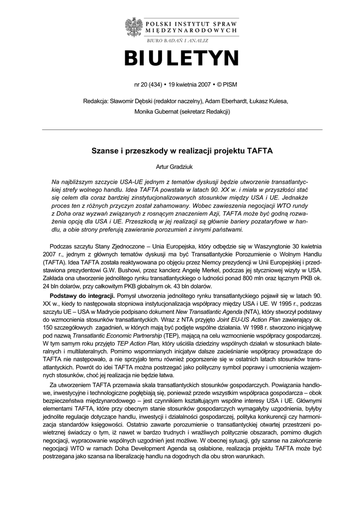BIURO BADAŃ I ANALIZ BIULETYN nr 20 (434) • 19 kwietnia 2007 • © PISM Redakcja: Sławomir Dębski (redaktor naczelny), Adam Eberhardt, Łukasz Kulesa, Monika Gubernat (sekretarz Redakcji) Szanse i przeszkody w realizacji projektu TAFTA Artur Gradziuk Na najbliższym szczycie USA-UE jednym z tematów dyskusji będzie utworzenie transatlantyckiej strefy wolnego handlu. Idea TAFTA powstała w latach 90. XX w. i miała w przyszłości stać się celem dla coraz bardziej zinstytucjonalizowanych stosunków między USA i UE. Jednakże proces ten z różnych przyczyn został zahamowany. Wobec zawieszenia negocjacji WTO rundy z Doha oraz wyzwań związanych z rosnącym znaczeniem Azji, TAFTA może być godną rozważenia opcją dla USA i UE. Przeszkodą w jej realizacji są głównie bariery pozataryfowe w handlu, a obie strony preferują zawieranie porozumień z innymi państwami. Podczas szczytu Stany Zjednoczone – Unia Europejska, który odbędzie się w Waszyngtonie 30 kwietnia 2007 r., jednym z głównych tematów dyskusji ma być Transatlantyckie Porozumienie o Wolnym Handlu (TAFTA). Idea TAFTA została reaktywowana po objęciu przez Niemcy prezydencji w Unii Europejskiej i przedstawiona prezydentowi G.W. Bushowi, przez kanclerz Angelę Merkel, podczas jej styczniowej wizyty w USA. Zakłada ona utworzenie jednolitego rynku transatlantyckiego o ludności ponad 800 mln oraz łącznym PKB ok. 24 bln dolarów, przy całkowitym PKB globalnym ok. 43 bln dolarów. Podstawy do integracji. Pomysł utworzenia jednolitego rynku transatlantyckiego pojawił się w latach 90. XX w., kiedy to następowała stopniowa instytucjonalizacja współpracy między USA i UE. W 1995 r., podczas szczytu UE – USA w Madrycie podpisano dokument New Transatlantic Agenda (NTA), który stworzył podstawy do wzmocnienia stosunków transatlantyckich. Wraz z NTA przyjęto Joint EU-US Action Plan zawierający ok. 150 szczegółowych zagadnień, w których mają być podjęte wspólne działania. W 1998 r. stworzono inicjatywę pod nazwą Transatlantic Economic Partnership (TEP), mającą na celu wzmocnienie współpracy gospodarczej. W tym samym roku przyjęto TEP Action Plan, który uściśla dziedziny wspólnych działań w stosunkach bilateralnych i multilateralnych. Pomimo wspomnianych inicjatyw dalsze zacieśnianie współpracy prowadzące do TAFTA nie następowało, a nie sprzyjało temu również pogorszenie się w ostatnich latach stosunków transatlantyckich. Powrót do idei TAFTA można postrzegać jako polityczny symbol poprawy i umocnienia wzajemnych stosunków, choć jej realizacja nie będzie łatwa. Za utworzeniem TAFTA przemawia skala transatlantyckich stosunków gospodarczych. Powiązania handlowe, inwestycyjne i technologiczne pogłębiają się, ponieważ przede wszystkim współpraca gospodarcza – obok bezpieczeństwa międzynarodowego – jest czynnikiem kształtującym wspólne interesy USA i UE. Głównymi elementami TAFTA, które przy obecnym stanie stosunków gospodarczych wymagałyby uzgodnienia, byłyby jednolite regulacje dotyczące handlu, inwestycji i działalności gospodarczej, polityka konkurencji czy harmonizacja standardów księgowości. Ostatnio zawarte porozumienie o transatlantyckiej otwartej przestrzeni powietrznej świadczy o tym, iż nawet w bardzo trudnych i wrażliwych politycznie obszarach, pomimo długich negocjacji, wypracowanie wspólnych uzgodnień jest możliwe. W obecnej sytuacji, gdy szanse na zakończenie negocjacji WTO w ramach Doha Development Agenda są osłabione, realizacja projektu TAFTA może być postrzegana jako szansa na liberalizację handlu na dogodnych dla obu stron warunkach. 1770 Polski Instytut Spraw Międzynarodowych Optymistyczny scenariusz rozwoju inicjatywy zakłada utworzenie rynku transatlantyckiego do 2015 r., przy czym w obszarze usług finansowych i rynków kapitałowych byłoby to możliwe już w 2010 r. Dodatkowa likwidacja barier handlowych oraz harmonizacja przepisów spowodowałaby ułatwienie i zwiększenie dwustronnej wymiany towarów i usług oraz przepływu inwestycji. Przeszkody w realizacji. Wobec korzyści wynikających z jednolitego rynku transatlantyckiego można zastanawiać się, dlaczego dwie największe gospodarki świata, mające zbliżone interesy gospodarcze, dotychczas nie zrealizowały jeszcze tego pomysłu. Główną przyczyną jest brak aktywnego zainteresowania jego realizacją. NTA miała zainspirować zacieśnianie współpracy gospodarczej i urzeczywistniania się idei TAFTA, jednak proces ten nie spełnił oczekiwań, ponieważ nie było wystarczającego zaangażowania politycznego w tej sprawie. Ponadto główne kwestie sporne w stosunkach gospodarczych od wielu lat pozostają te same. Wraz z redukcją ceł i coraz większą współzależnością gospodarczą różnice w wewnętrznych regulacjach i filozofii myślenia o polityce gospodarczej okazują się głównym źródłem konfliktów. Świadczy o tym chociażby problematyka obecnych sporów handlowych, która dotyczy przede wszystkim pozataryfowych barier handlowych, takich jak: standardy bezpieczeństwa żywności, certyfikacja towarów, polityka konkurencji, ochrona środowiska, ulgi podatkowe a także zamówienia publiczne. Dyskusje na te tematy często przybierają charakter polityczny, gdyż dotyczą sposobu prowadzenia wewnętrznej polityki gospodarczej, zmiana której jest znacznie trudniejsza niż liberalizacja handlu poprzez obniżenie ceł. Politycy, podejmując decyzje biorą pod uwagę opinie różnych grup interesu, które nie zawsze widzą korzyści w wolnym handlu i integracji gospodarczej między UE i USA. Po stronie UE trudności tkwią już na etapie wspólnych uzgodnień między 27 państwami członkowskimi w sprawie ewentualnych zasad funkcjonowania rynku transatlantyckiego. Pożądanym przez UE modelem byłoby ujednolicenie regulacji rynkowych wzorowane na wewnętrznych regulacjach unijnych. Oznaczałoby to jednak narzucenie USA wie