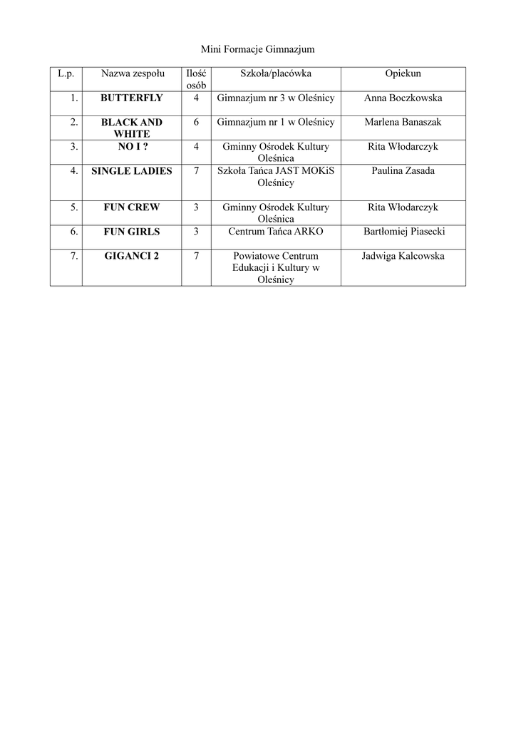 Mini Formacje Gimnazjum L.p. Nazwa zespołu Ilość osób 4 Szkoła/placówka Opiekun Gimnazjum nr 3 w Oleśnicy Anna Boczkowska 1. BUTTERFLY 2. 6 Gimnazjum nr 1 w Oleśnicy Marlena Banaszak 3. BLACK AND WHITE NO I ? 4 Rita Włodarczyk 4. SINGLE LADIES 7 Gminny Ośrodek Kultury Oleśnica Szkoła Tańca JAST MOKiS Oleśnicy 5. FUN CREW 3 Rita Włodarczyk 6. FUN GIRLS 3 Gminny Ośrodek Kultury Oleśnica Centrum Tańca ARKO 7. GIGANCI 2 7 Powiatowe Centrum Edukacji i Kultury w Oleśnicy Paulina Zasada Bartłomiej Piasecki Jadwiga Kalcowska