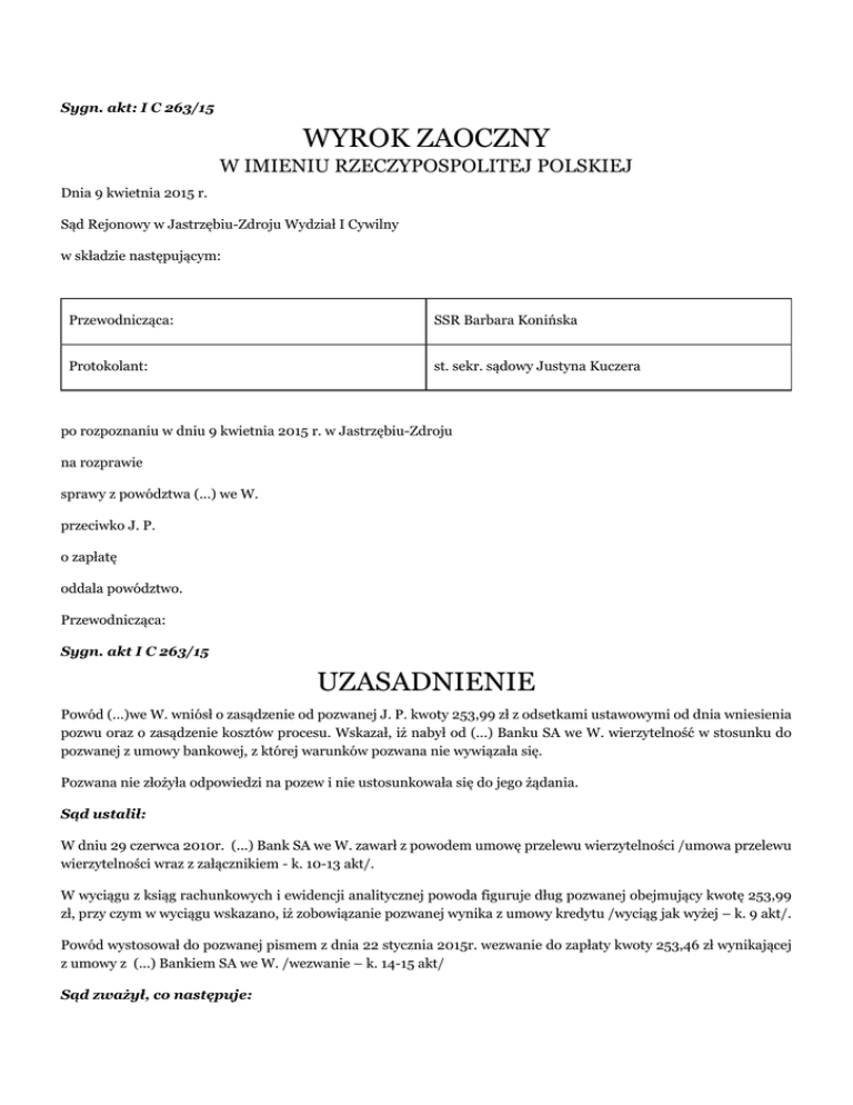 Sygn. akt: I C 263/15 WYROK ZAOCZNY W IMIENIU RZECZYPOSPOLITEJ POLSKIEJ Dnia 9 kwietnia 2015 r. Sąd Rejonowy w Jastrzębiu-Zdroju Wydział I Cywilny w składzie następującym: Przewodnicząca: SSR Barbara Konińska Protokolant: st. sekr. sądowy Justyna Kuczera po rozpoznaniu w dniu 9 kwietnia 2015 r. w Jastrzębiu-Zdroju na rozprawie sprawy z powództwa (...) we W. przeciwko J. P. o zapłatę oddala powództwo. Przewodnicząca: Sygn. akt I C 263/15 UZASADNIENIE Powód (...)we W. wniósł o zasądzenie od pozwanej J. P. kwoty 253,99 zł z odsetkami ustawowymi od dnia wniesienia pozwu oraz o zasądzenie kosztów procesu. Wskazał, iż nabył od (...) Banku SA we W. wierzytelność w stosunku do pozwanej z umowy bankowej, z której warunków pozwana nie wywiązała się. Pozwana nie złożyła odpowiedzi na pozew i nie ustosunkowała się do jego żądania. Sąd ustalił: W dniu 29 czerwca 2010r. (...) Bank SA we W. zawarł z powodem umowę przelewu wierzytelności /umowa przelewu wierzytelności wraz z załącznikiem - k. 10-13 akt/. W wyciągu z ksiąg rachunkowych i ewidencji analitycznej powoda figuruje dług pozwanej obejmujący kwotę 253,99 zł, przy czym w wyciągu wskazano, iż zobowiązanie pozwanej wynika z umowy kredytu /wyciąg jak wyżej – k. 9 akt/. Powód wystosował do pozwanej pismem z dnia 22 stycznia 2015r. wezwanie do zapłaty kwoty 253,46 zł wynikającej z umowy z (...) Bankiem SA we W. /wezwanie – k. 14-15 akt/ Sąd zważył, co następuje: Powód wywodził swoje roszczenie z faktu nabycia w drodze przelewu (art. 509 k.c.) wierzytelności z tytułu umowy zawartej przez pozwaną z (...) Bankiem SA we W.. Skoro zaś powód powoływał się na istnienie wierzytelności przysługującej zbywcy wobec pozwanego powinien był okoliczność tę dowieść zgodnie z rozkładem ciężaru dowodu określonym art. 6 k.c. W myśl art. 6 k.c. ten, kto powołując się na przysługujące mu prawo, żąda czegoś od innej osoby, obowiązany jest udowodnić fakty (okoliczności faktyczne) uzasadniające żądanie, ten zaś kto odmawia uczynienia zadość żądaniu, a więc neguje uprawnienie żądającego, obowiązany jest udowodnić fakty wskazujące na to, że uprawnienie żądającemu nie przysługuje. Obowiązek ten wynika również z treści art. 232 k.p.c. Przy tym samo twierdzenie strony nie jest dowodem, a twierdzenie dotyczące istotnej dla sprawy okoliczności powinno być udowodnione przez stronę to twierdzenie zgłaszającą (por. wyrok SN z dnia 22.11.2001r., I PKN 660/00, Wokanda 2002/7-8/44). Umowa przelewu wierzytelności nie jest wystarczającym dowodem zasadności żądania powoda. Przede wszystkim umowa ta nie określa, jakie konkretnie wierzytelności były jej przedmiotem, ani by wśród nich znalazła się wierzytelność przysługująca bankowi wobec pozwanej. O ile zaś wierzytelność ta została opisana w załączniku do umowy przelewu, sam fakt jej powołania przez strony umowy przelewu, nie dowodzi istnienia wierzytelności dochodzonej pozwem mającej przysługiwać uprzednio cedentowi. Istnienia wierzytelności nie dowodzi też samo wezwanie do zapłaty i zawiadomienie o przelewie, które dowodzi jedynie faktu, iż wezwanie takie zostało sporządzone (art. 245 k.p.c.). Takim dowodem nie jest również wyciąg z ksiąg funduszu sekurytyzacyjnego. Samo dokonanie zapisu w księgach funduszu o istnieniu wierzytelności nie wiąże się z domniemaniem prawnym, iż wierzytelność ta istnieje, brak bowiem jakiegokolwiek sposobu kontroli prawidłowości podstaw dokonywanych wpisów, poza ich prawidłowością formalną. Organy funduszu nie mają wystarczających kompetencji do zbadania, czy nabywana wierzytelność faktycznie istnieje. O ile należy przyjąć, że wyciąg z ksiąg rachunkowych funduszu potwierdza fakt dokonania cesji (nabycia wierzytelności), o tyle do wykazania skuteczności tego nabycia w świetle prawa cywilnego lub szerzej - do wykazania istnienia wierzytelności w razie zaprzeczenia przez pozwanego jej istnieniu, konieczne jest przedstawienie przez fundusz odpowiednich dowodów. Konkludując, domniemanie zgodności z prawdą treści dokumentu w postaci wyciągu z ksiąg rachunkowych funduszu sekurytyzacyjnego nie obejmuje faktu istnienia wierzytelności nabytej przez fundusz sekurytyzacyjny w drodze przelewu (uzasadnienie uchwały Sądu Najwyższego z dnia 07 października 2009r., sygn. III CZP 65/09, OSNC 2010/4/51). Nadto zgodnie z wyrokiem Trybunału Konstytucyjnego z dnia 11 lipca 2011r., sygn. akt P 1/10 (OTK-A 2011/6/53, Dz.U.2011/152/900) art. 194 ustawy z dnia 27 maja 2004r. o funduszach inwestycyjnych (Dz. U. Nr 146, poz. 1546, z 2005r. ze zm.) w części, w jakiej nadaje moc prawną dokumentu urzędowego księgom rachunkowym i wyciągom z ksiąg rachunkowych funduszu sekurytyzacyjnego w postępowaniu cywilnym prowadzonym wobec konsumenta, jest niezgodny z art. 2, art. 32 ust. 1 zdanie pierwsze i art. 76 Konstytucji Rzeczypospolitej Polskiej oraz nie jest niezgodny z art. 20 Konstytucji. Posłużenie się zatem przez powoda wyciągiem z ksiąg rachunkowych funduszu, który wprawdzie ma moc prawną dokumentu urzędowego, nie skutkuje w sprawach z udziałem konsumentów – jak to było dotychczas - zmianą rozkładu ciężaru dowodu określonego w art. 6 k.c. oraz art. 232 k.p.c. Oznacza to, że aby udowodnić istnienie dochodzonej przez fundusz wierzytelności i jej wysokość, nie wystarczy przedłożenie sądowi wyciągu z ksiąg rachunkowych, lecz istnieje potrzeba wykazania tytułu i okoliczności, w jakich zobowiązanie powstało. Pozwany konsument nie jest natomiast zmuszony udowodnić nieprawdziwości treści wyciągu z ksiąg rachunkowych funduszu. Wobec tego powód winien wykazać istnienie stosunku cywilnoprawnego łączącego poprzednika prawnego (...) Bank SA we W. - z pozwaną. Tego jednak nie uczynił, nie przedstawiając dowodów na zawarcie umowy przez pozwaną z tą spółką. Żaden z dokumentów przedło
