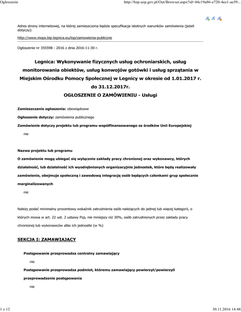 Ogłoszenie 1 z 12 http://bzp.uzp.gov.pl/Out/Browser.aspx?id=44c19a86-e720-4ee1-ae59... Adres strony internetowej, na której zamieszczona będzie specyfikacja istotnych warunków zamówienia (jeżeli dotyczy): http://www.mops.bip.legnica.eu/lop/zamowienia-publiczne Ogłoszenie nr 355598 - 2016 z dnia 2016-11-30 r. Legnica: Wykonywanie fizycznych usług ochroniarskich, usług monitorowania obiektów, usług konwojów gotówki i usług sprzątania w Miejskim Ośrodku Pomocy Społecznej w Legnicy w okresie od 1.01.2017 r. do 31.12.2017r. OGŁOSZENIE O ZAMÓWIENIU - Usługi Zamieszczanie ogłoszenia: obowiązkowe Ogłoszenie dotyczy: zamówienia publicznego Zamówienie dotyczy projektu lub programu współfinansowanego ze środków Unii Europejskiej nie Nazwa projektu lub programu O zamówienie mogą ubiegać się wyłącznie zakłady pracy chronionej oraz wykonawcy, których działalność, lub działalność ich wyodrębnionych organizacyjnie jednostek, które będą realizowały zamówienie, obejmuje społeczną i zawodową integrację osób będących członkami grup społecznie marginalizowanych nie Należy podać minimalny procentowy wskaźnik zatrudnienia osób należących do jednej lub więcej kategorii, o których mowa w art. 22 ust. 2 ustawy Pzp, nie mniejszy niż 30%, osób zatrudnionych przez zakłady pracy chronionej lub wykonawców albo ich jednostki (w %) SEKCJA I: ZAMAWIAJĄCY Postępowanie przeprowadza centralny zamawiający nie Postępowanie przeprowadza podmiot, któremu zamawiający powierzył/powierzyli przeprowadzenie postępowania nie 30.11.2016 14:48 Ogłoszenie 2 z 12 http://bzp.uzp.gov.pl/Out/Browser.aspx?id=44c19a86-e720-4ee1-ae59... Informacje na temat podmiotu któremu zamawiający powierzył/powierzyli prowadzenie postępowania: Postępowanie jest przeprowadzane wspólnie przez zamawiających nie Jeżeli tak, należy wymienić zamawiających, którzy wspólnie przeprowadzają postępowanie oraz podać adresy ich siedzib, krajowe numery identyfikacyjne oraz osoby do kontaktów wraz z danymi do kontaktów: Postępowanie jest przeprowadzane wspólnie z zamawiającymi z innych państw członkowskich Unii Europejskiej nie W przypadku przeprowadzania postępowania wspólnie z zamawiającymi z innych państw członkowskich Unii Europejskiej – mające zastosowanie krajowe prawo zamówień publicznych: Informacje dodatkowe: I. 1) NAZWA I ADRES: Miejski Ośrodek Pomocy Społecznej, krajowy numer identyfikacyjny 404656500000, ul. ul. Poselska 13, 59220 Legnica, woj. dolnośląskie, państwo Polska, tel. 767 221 803, e-mail [email protected], faks 767 221 831. Adres strony internetowej (URL): http://www.mops.bip.legnica.eu/lop/zamowienia-publiczne I. 2) RODZAJ ZAMAWIAJĄCEGO: Jednostki organizacyjne administracji samorządowej I.3) WSPÓLNE UDZIELANIE ZAMÓWIENIA (jeżeli dotyczy): Podział obowiązków między zamawiającymi w przypadku wspólnego przeprowadzania postępowania, w tym w przypadku wspólnego przeprowadzania postępowania z zamawiającymi z innych państw członkowskich Unii Europejskiej (który z zamawiających jest odpowiedzialny za przeprowadzenie postępowania, czy i w jakim zakresie za przeprowadzenie postępowania odpowiadają pozostali zamawiający, czy zamówienie będzie udzielane przez każdego z zamawiających indywidualnie, czy zamówienie zostanie udzielone w imieniu i na rzecz pozostałych zamawiających): I.4) KOMUNIKACJA: Nieograniczony, pełny i bezpośredni dostęp do dokumentów z postępowania można uzyskać pod adresem (URL) nie Adres strony internetowej, na której zamieszczona będzie specyfikacja istotnych warunków zamówienia 30.11.2016 14:48 Ogłoszenie 3 z 12 http://bzp.uzp.gov.pl/Out/Browser.aspx?id=44c19a86-e720-4ee1-ae59... tak http://www.mops.bip.legnica.eu/lop/zamowienia-publiczne Dostęp do dokumentów z postępowania jest ograniczony - więcej informacji można uzyskać pod adresem nie Oferty lub wnioski o dopuszczenie do udziału w postępowaniu należy przesyłać: Elektronicznie nie adres Dopuszczone jest przesłanie ofert lub wniosków o dopuszczenie do udziału w postępowaniu w inny sposób: tak Inny sposób: W formie pisemnej drogą pocztową lub osobiście u zamawiającego. Wymagane jest przesłanie ofert lub wniosków o dopuszczenie do udziału w postępowaniu w inny sposób: tak Inny sposób: W formie pisemnej drogą pocztową lub osobiście u zamawiającego. Adres: Miejski Ośrodek Pomocy Społecznej, ul. Poselska 13, 59-220 Legnica Komunikacja elektroniczna wymaga korzystania z narzędzi i urządzeń lub formatów plików, które nie są ogólnie dostępne nie Nieograniczony, pełny, bezpośredni i bezpłatny dostęp do tych narzędzi można uzyskać pod adresem: (URL) SEKCJA II: PRZEDMIOT ZAMÓWIENIA 30.11.2016 14:48 Ogłoszenie 4 z 12 http://bzp.uzp.gov.pl/Out/Browser.aspx?id=44c19a86-e720-4ee1-ae59... II.1) Nazwa nadana zamówieniu przez zamawiającego: Wykonywanie fizycznych usług ochroniarskich, usług monitorowania obiektów, usług konwojów gotówki i usług sprzątania w Miejskim Ośrodku Pomocy Społecznej w Legnicy w okresie od 1.01.2017 r. do 31.12.2017r. Numer referencyjny: D.O. 3814/III/2016 Przed wszczęciem postępowania o udzielenie zamówienia przeprowadzono dialog techniczny nie II.2) Rodzaj zamówienia: usługi II.3) Informacja o możliwości składania ofert częściowych Zamówienie podzielone jest na części: Nie II.4) Krótki opis przedmiotu zamówienia (wielkość, zakres, rodzaj i ilość dostaw, usług lub robót budowlanych lub określenie zapotrzebowania i wymagań ) a w przypadku partnerstwa innowacyjnego określenie zapotrzebowania na innowacyjny produkt, usługę lub roboty budowlane: Wykonywanie fizycznych usług ochroniarskich, usług monitorowania obiektów, usług konwojów gotówki i usług sprzątania w Miejskim Ośrodku Pomocy Społecznej w Legnicy w okresie od 1.01.2017 r. do 31.12.2017r. II.5) Główny kod CPV: 79710000-4 Dodatkowe kody CPV:90919200-4, 79711000-1 II