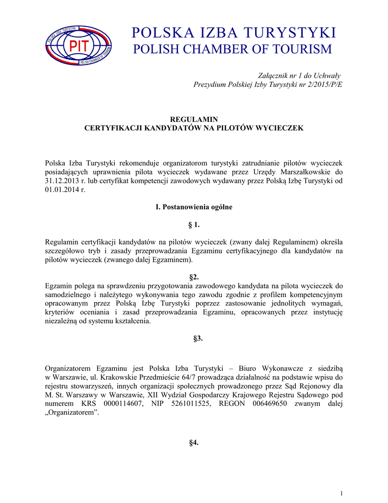 POLSKA IZBA TURYSTYKI POLISH CHAMBER OF TOURISM Załącznik nr 1 do Uchwały Prezydium Polskiej Izby Turystyki nr 2/2015/P/E REGULAMIN CERTYFIKACJI KANDYDATÓW NA PILOTÓW WYCIECZEK Polska Izba Turystyki rekomenduje organizatorom turystyki zatrudnianie pilotów wycieczek posiadających uprawnienia pilota wycieczek wydawane przez Urzędy Marszałkowskie do 31.12.2013 r. lub certyfikat kompetencji zawodowych wydawany przez Polską Izbę Turystyki od 01.01.2014 r. I. Postanowienia ogólne § 1. Regulamin certyfikacji kandydatów na pilotów wycieczek (zwany dalej Regulaminem) określa szczegółowo tryb i zasady przeprowadzania Egzaminu certyfikacyjnego dla kandydatów na pilotów wycieczek (zwanego dalej Egzaminem). §2. Egzamin polega na sprawdzeniu przygotowania zawodowego kandydata na pilota wycieczek do samodzielnego i należytego wykonywania tego zawodu zgodnie z profilem kompetencyjnym opracowanym przez Polską Izbę Turystyki poprzez zastosowanie jednolitych wymagań, kryteriów oceniania i zasad przeprowadzania Egzaminu, opracowanych przez instytucję niezależną od systemu kształcenia. §3. Organizatorem Egzaminu jest Polska Izba Turystyki – Biuro Wykonawcze z siedzibą w Warszawie, ul. Krakowskie Przedmieście 64/7 prowadząca działalność na podstawie wpisu do rejestru stowarzyszeń, innych organizacji społecznych prowadzonego przez Sąd Rejonowy dla M. St. Warszawy w Warszawie, XII Wydział Gospodarczy Krajowego Rejestru Sądowego pod numerem KRS 0000114607, NIP 5261011525, REGON 006469650 zwanym dalej „Organizatorem”. §4. 1 POLSKA IZBA TURYSTYKI POLISH CHAMBER OF TOURISM Organizator przeprowadza Egzamin za pomocą Podmiotów przeprowadzających Egzamin, którymi są: a. Polska Izba Turystki – Biuro Wykonawcze (PIT-BW), b. oddział Polskiej Izby Turystyki, c. Ośrodek Akredytowany przez Polską Izbę Turystyki. II. Organizacja Egzaminu Egzamin przeprowadza się w terminach podanych do publicznej wiadomości przez Organizatora m.in. na stronie www.certyfikacja.pit.org.pl z dokładnością co do dnia i godziny. 2. Terminy Egzaminów ustalane są przez Polską Izbę Turystyki – Biuro Wykonawcze. Oddziały Polskiej Izby Turystyki i Ośrodki Akredytowane przez Polską Izbę Turystyki do przeprowadzania Egzaminów zgłaszają swoje propozycje terminów Egzaminów do PITBW celem uzyskania zgody na przeprowadzenie Egzaminu w określonym dniu i godzinie. 3. Do Egzaminu w danym terminie mogą przystąpić osoby, które spełniają następujące warunki: a. ukończyły 18 lat, 1. b. nie były karane za przestępstwa umyślne lub inne popełnione w związku z wykonywaniem zadań pilota wycieczek, c. posiadają wykształcenie średnie, d. zarejestrowały się na dany termin Egzaminu, e. uiściły opłatę egzaminacyjną. 3. Z chwilą spełnienia warunków, o których mowa w ust. 2 powyżej osoby stają się Uczestnikami Egzaminu. 4. Rejestracja na dany termin Egzaminu odbywa się w wyznaczonym terminie, poprzez Podmiot przeprowadzający Egzamin, za pomocą Formularza zgłoszenia, którego wzór stanowi Załącznik nr 3 do niniejszego Regulaminu za pośrednictwem systemu teleinformatycznego, zawierającego również informację o wysokości opłaty egzaminacyjnej. Rejestracji dokonuje się najpóźniej na 8 dni przed danym terminem Egzaminu. Istnieje możliwość dokonania rejestracji w późniejszym terminie, za zgodą Organizatora Egzaminu. 2 POLSKA IZBA TURYSTYKI POLISH CHAMBER OF TOURISM 5. Formularz zgłoszenia zawiera następujące dane: a. Imię i nazwisko, b. Miejsce urodzenia, c. PESEL, d. Adres zamieszkania, e. Telefon kontaktowy, f. Adres e-mail. g. Informację, czy Uczestnik Egzaminu ukończył kurs dla kandydatów na pilotów wycieczek (jeżeli tak, to należy podać dane organizatora i kierownika kursu). 6. Osoba chcąca przystąpić do Egzaminu dołącza do Formularza zgłoszenia, następujące dokumenty: a. zdjęcie paszportowe w formacie .jpg (min. rozdzielczość 300 dpi), b. kserokopię świadectwa/dyplomu potwierdzającego wykształcenie min. średnie (kserokopia musi być potwierdzona przez Podmiot przeprowadzających Egzamin za zgodnością z oryginałem), c. oświadczenie o niekaralności za przestępstwa umyślne lub inne popełnione w związku z wykonywaniem zadań pilota wycieczek, d. dowód uiszczenia opłaty egzaminacyjnej. 7. Osoba chcąca przystąpić do Egzaminu może dołączyć do Formularza zgłoszenia dokument potwierdzający znajomość języka obcego, o którym mowa w Rozdziale VI ust. 4. 8. Opłatę egzaminacyjną uiszcza się na rzecz Organizatora w terminie i w sposób podany przez Podmiot przeprowadzający Egzamin, w wysokości obowiązującej w dniu przystąpienia do rejestracji na dany termin Egzaminu. Wysokość opłaty egzaminacyjnej jest podana do publicznej wiadomości m.in. na stronie www.certyfikacja.pit.org.pl. 9. W przypadku, gdy Egzamin nie dojdzie do skutku z przyczyn leżących po stronie Organizatora uiszczona opłata egzaminacyjna podlega zwrotowi. 10. Uczestnik Egzaminu może złożyć Organizatorowi pisemną rezygnację z udziału w Egzaminie. W przypadku rezygnacji złożonej na mniej niż 10 dni przed datą Egzaminu Uczestnikowi przysługuje zwrot opłaty egzaminacyjnej, pomniejszonej o faktycznie poczynione przez Organizatora koszty związane z należytym przygotowaniem Egzaminu. 3 POLSKA IZBA TURYSTYKI POLISH CHAMBER OF TOURISM III. Forma Egzaminu 1. Egzamin ma na celu sprawdzenie zgodności kompetencji Uczestnika Egzaminu z profilem kompetencyjnym pilota wycieczek, określonym w Załączniku nr 1 do niniejszego Regulaminu. Egzamin składa się z: a. testu wiedzy, b. 1 zadania praktycznego realizowanego na sali egzaminacyjnej, c. zadań praktycznych realizowanych w autokarze, d. zadań praktycznych realizowanych w terenie. 2. Test wiedzy polega na pisemnym udzieleniu odpowiedzi na 30 pytań zadanych w formie zamkniętej z jedną prawidłową odpowiedzią spośród czterech możliwych z zakresu „Wiedza” określo