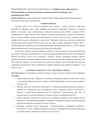 SPRAWOZDANIE Z REALIZACJI ZADANIA nr 14: Badanie typów odporności na fuzariozę kłosów u pszenżyta ozimego za pomocą markerów fenotypowych i metabolicznych, 2015r Halina Wiśniewska, Tomasz Góral, Piotr Ochodzki, Maciej Majka, Jolanta Belter, Dorota WalentynGóral oraz 6 pracowników pomocniczych WPROWADZENIE Fuzarioza kłosów jest chorobą powodowaną przez grzyby z rodzaju Fusarium, która może prowadzić do obniżenia plonu ziarna. Jednakże poważniejszym problemem związanym z fuzariozą kłosów jest skażenie ziarna mikotoksynami, takimi jak deoksyniwalenol (DON), niwalenol (NIV), zearalenon (ZEA). Spożywanie żywności lub paszy skażonej mikotoksynami wywołuje różne choroby u ludzi i zwierząt określane ogólnie, jako mikotoksykozy. Powyższe fakty stworzyły potrzebę kontroli i zredukowania zawartości mikotoksyn w ziarnie zbóż. Najbardziej skutecznym sposobem redukcji strat powodowanych przez fuzariozę kłosów zbóż może być uprawa odmian odpornych. Odmiany takie, o stabilnej odporności, charakteryzują się brakiem lub bardzo niską akumulacją DON-u w ziarnie. Uprawa takich odmian pozwoli również na ograniczenie stosowania fungicydów. Liczne nowe odmiany pszenżyta okazują się podatne na fuzariozę kłosów na poziomie zbliżonym do pszenicy. Pojawiają się doniesienia, że w ziarnie pszenżyta akumulowana może być ilość mikotoksyn zbliżona lub nawet wyższa od tej notowanej u pszenicy, pomimo mniejszego nasilenia objawów fuzariozy na kłosach i ziarniakach. Brak jak dotąd wyjaśnienia tego zjawiska. Dodatkowo pszenżyto, jako forma sztuczna, zagrożone jest zawężeniem bazy genetycznej odmian, jeżeli nie prowadzi się krzyżowań z gatunkami macierzystymi. Może to prowadzić do spadku odporności tego gatunku na patogeny, w tym Fusarium spp. MATERIAŁ BADAWCZY, CEL I METODYKA BADAŃ Materiał badawczy: 75 genotypów pszenżyta ozimego i 3 formy wzorcowe (Tomko, Fredro i Meloman) Cel badań: 1. Badanie odporności typu I (odporność na infekcję) i II (rozprzestrzenianie się Fusarium w kłosie) u wybranych genotypów pszenżyta ozimego w dwóch lokalizacjach z wykorzystaniem markerów fenotypowych. 2. Założenie polowych doświadczeń infekcyjnych z wybranymi genotypami pszenżyta ozimego w dodatkowych lokalizacjach oraz piramidyzacja genów odporności poprzez krzyżowanie z formami o podwyższonej odporności (typ III odporności). Wprowadzenie genu Fhb1 do pszenżyta przez krzyżowanie pszenżyta z formami pszenicy posiadającymi gen Fhb1 3. Analiza zebranego materiału pod kątem oceny zasiedlania ziarniaków przez patogen (typ III odporności) w tym identyfikacja białek w ziarniakach różnicujących odporne i podatne genotypy pszenżyta inokulowane szczepami Fusarium culmorum. 4. Określenie zawartości toksyn fuzaryjnych – deoksyniwalenolu i pochodnych, niwalenolu i zearalenonu w ziarnie wybranych genotypów pszenżyta wykazujących podwyższoną odporność na porażenie kłosa i uszkodzenie ziarniaków przez Fusarium. Metodyka badań: Odporność na fuzariozę kłosów testowano metodą inokulacji punktowej w warunkach szklarniowych i polowych (typ II odporności) i przez oprysk w warunkach polowych w IHAR Radzików oraz w IGR PAN w Poznaniu (typ I i II odporności). Do produkcji inokulum zastosowano 3 izolaty Fusarium culmorum (KF846, ZFR112, ZFR16) wytwarzające deoksyniwalenol, niwalenol oraz zearalenon. Zawiesiny ze wszystkich izolatów mieszano i ustalano stężenie zarodników na około 100 000 (IGR Poznań lub 500 000 (IHAR Radzików) zarodników/ml (zar./ml) w równych proporcjach. Inokulacja była prowadzona w czasie kwitnienia genotypów. Po inokulacji rośliny w lokalizacji Cerekwica były zamgławiane, natomiast w Radzikowie inokulacje prowadzone były w godzinach wieczornych. Nasilenie fuzariozy kłosów określano na podstawie proporcji porażonych kłosków w kłosie (tylko w kłosach z objawami choroby) oraz proporcji kłosów prażonych na poletku. Z tych wartości został wyliczony indeks fuzariozy kłosów (IFK). Proporcję ziarniaków uszkodzonych przez Fusarium (typ odporności III) określano wizualnie poprzez podział próby na ziarniaki zdrowe (HLK-healthy looking kernels) i ziarniaki z objawami porażenia przez Fusarium (FDK-Fusarium damaged kernels). Określano również redukcję komponentów plonu ziarna w odniesieniu do prób kontrolnych (masę ziarna z kłosa, liczbę ziarniaków w kłosie, masę tysiąca ziarniaków). Ziarno z form o najwyższej odporności i niewielkiej obniżce parametrów plonotwórczych analizowane było pod względem zawartości ergosterolu oraz toksyn fuzaryjnych – deoksyniwalenolu, niwalenolu, zearalenonu (typ IV odporności, poszukiwane markery metaboliczne). Zawartość ergosterolu określona była metodą wysokosprawnej chromatografii cieczowej. Zawartość trichotecenów z grupy B (deoksyniwalenol, niwalenol) analizowano techniką chromatografii gazowej. Zawartość zearalenonu (ZEA) oznaczana była za pomocą ilościowego testu immunoenzymatycznego (ELISA) AgraQuant® ZON 40/1000 (LOD 10 ppb) (Romer Laboratories). WYNIKI W 2015 roku badania obejmowały 89 genotypów pszenżyta ozimego o zróżnicowanym podłożu genetycznym, pochodzące z różnych kombinacji krzyżowań odmian i genotypów o poznanej podwyższonej odporności oraz trzech form kontrolnych (Tomko, Meloman Fredro). Wysiano genotypy nowo uzyskane i te, które na podstawie wyników badań w poprzednich latach wytypowano, jako formy o podwyższonej odporności. Przy wyborze genotypów do krzyżowań uwzględniano również zadawalające cechy rolnicze (plon i jakość). Zastosowano technikę inokulacji przez oprysk, ponieważ ten sposób inokulacji przypomina naturalne warunki infekcji. 1. Określono odporności typu I (na infekcję) oraz typu II (na rozprzestrzenienie się patogena wzdłuż osadki kłosowej). Inokulację przeprowadzono w pełni kwitnienia każdego genotypu, ponieważ pszenżyto je