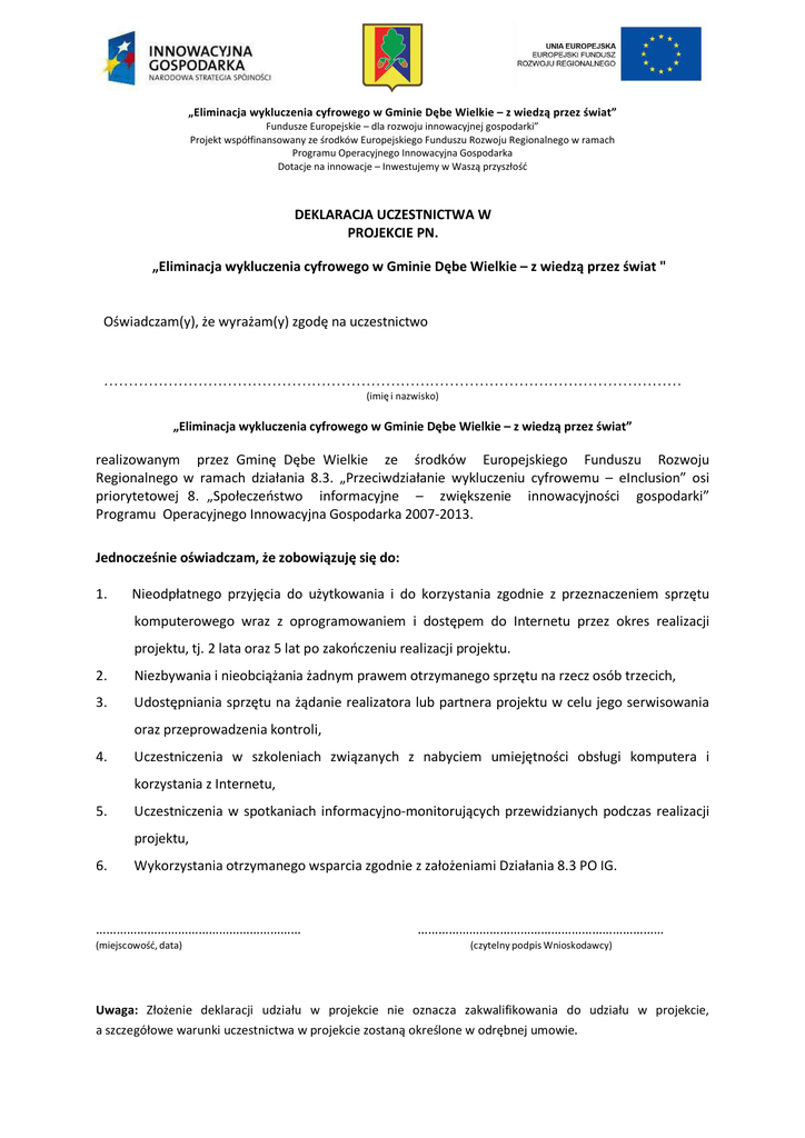 „Eliminacja wykluczenia cyfrowego w Gminie Dębe Wielkie – z wiedzą przez świat” Fundusze Europejskie – dla rozwoju innowacyjnej gospodarki” Projekt współfinansowany ze środków Europejskiego Funduszu Rozwoju Regionalnego w ramach Programu Operacyjnego Innowacyjna Gospodarka Dotacje na innowacje – Inwestujemy w Waszą przyszłość DEKLARACJA UCZESTNICTWA W PROJEKCIE PN. „Eliminacja wykluczenia cyfrowego w Gminie Dębe Wielkie – z wiedzą przez świat " Oświadczam(y), że wyrażam(y) zgodę na uczestnictwo ……………………………………………………………………………………………………… (imię i nazwisko) „Eliminacja wykluczenia cyfrowego w Gminie Dębe Wielkie – z wiedzą przez świat” realizowanym przez Gminę Dębe Wielkie ze środków Europejskiego Funduszu Rozwoju Regionalnego w ramach działania 8.3. „Przeciwdziałanie wykluczeniu cyfrowemu – eInclusion” osi priorytetowej 8. „Społeczeństwo informacyjne – zwiększenie innowacyjności gospodarki” Programu Operacyjnego Innowacyjna Gospodarka 2007-2013. Jednocześnie oświadczam, że zobowiązuję się do: 1. Nieodpłatnego przyjęcia do użytkowania i do korzystania zgodnie z przeznaczeniem sprzętu komputerowego wraz z oprogramowaniem i dostępem do Internetu przez okres realizacji projektu, tj. 2 lata oraz 5 lat po zakończeniu realizacji projektu. 2. Niezbywania i nieobciążania żadnym prawem otrzymanego sprzętu na rzecz osób trzecich, 3. Udostępniania sprzętu na żądanie realizatora lub partnera projektu w celu jego serwisowania oraz przeprowadzenia kontroli, 4. Uczestniczenia w szkoleniach związanych z nabyciem umiejętności obsługi komputera i korzystania z Internetu, 5. Uczestniczenia w spotkaniach informacyjno-monitorujących przewidzianych podczas realizacji projektu, 6. Wykorzystania otrzymanego wsparcia zgodnie z założeniami Działania 8.3 PO IG. …………………………………………………… (miejscowość, data) ……………………………………………………………… (czytelny podpis Wnioskodawcy) Uwaga: Złożenie deklaracji udziału w projekcie nie oznacza zakwalifikowania do udziału w projekcie, a szczegółowe warunki uczestnictwa w projekcie zostaną określone w odrębnej umowie.