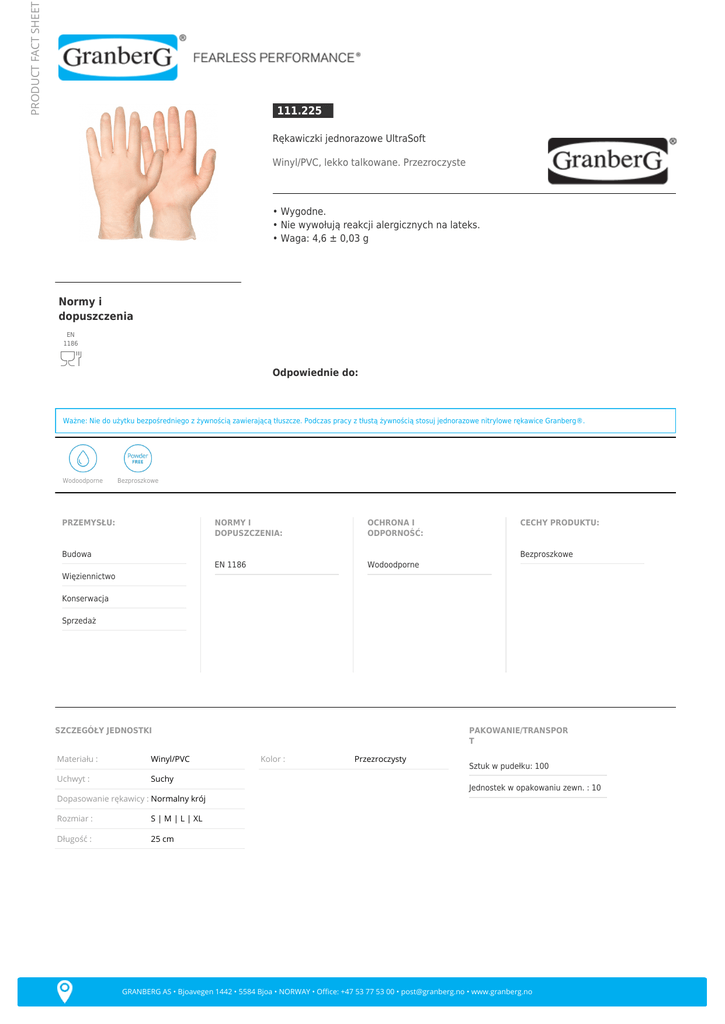 PRODUCT FACT SHEET 111.225 Rękawiczki jednorazowe UltraSoft Winyl/PVC, lekko talkowane. Przezroczyste • Wygodne. • Nie wywołują reakcji alergicznych na lateks. • Waga: 4,6 ± 0,03 g Normy i dopuszczenia EN 1186 Odpowiednie do: Ważne: Nie do użytku bezpośredniego z żywnością zawierającą tłuszcze. Podczas pracy z tłustą żywnością stosuj jednorazowe nitrylowe rękawice Granberg®. Wodoodporne Bezproszkowe PRZEMYSŁU: NORMY I DOPUSZCZENIA: OCHRONA I ODPORNOŚĆ: EN 1186 Wodoodporne Budowa CECHY PRODUKTU: Bezproszkowe Więziennictwo Konserwacja Sprzedaż SZCZEGÓŁY JEDNOSTKI Materiału : Winyl/PVC Uchwyt : Suchy PAKOWANIE/TRANSPOR T Kolor : Przezroczysty Sztuk w pudełku: 100 Jednostek w opakowaniu zewn. : 10 Dopasowanie rękawicy : Normalny krój Rozmiar : S | M | L | XL Długość : 25 cm GRANBERG AS • Bjoavegen 1442 • 5584 Bjoa • NORWAY • Office: +47 53 77 53 00 • [email protected] • www.granberg.no