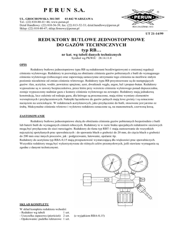 P E R U N S.A. UL. GROCHOWSKA 301/305 03-842 WARSZAWA Tel.: (22) 810-80-41÷46; www.perun.pl Dział Handlowy: (22) 810-56-39, fax: (22) 813-52-33; [email protected] Sklep: (22) 810-80-47; [email protected] UT 21-14/99 REDUKTORY BUTLOWE JEDNOSTOPNIOWE DO GAZÓW TECHNICZNYCH typ RB… nr kat. wg tabeli danych technicznych Symbol wg PKWiU 28.14.11.0 OPIS Reduktory butlowe jednostopniowe typu RB są reduktorami bezdźwigniowymi o zmiennej regulacji ciśnienia wylotowego. Reduktory te pozwalają na obniżanie ciśnienia gazów pobieranych z butli do wymaganego ciśnienia wylotowego (roboczego) oraz zapewniają samoczynne utrzymanie tego ciśnienia na możliwie stałym poziomie niezależnie od zmian ciśnienia wlotowego. Reduktory typu RB przystosowane są do następujących gazów: tlen, acetylen, wodór, powietrze sprężone, azot, dwutlenek węgla, argon, hel i propan-butan. Reduktory wyposażone są w zawory bezpieczeństwa, przez które przy wzroście ciśnienia wylotowego ponad dopuszczalne, zostaje wypuszczony nadmiar gazu z komory ciśnienia wylotowego na zewnątrz. Reduktory mają jednakową konstrukcję, lecz zależnie od rodzaju gazu, dla którego są przeznaczone, mają różne wymiary elementów wewnętrznych i przyłączeniowych. Nakrętki łącznikowe do gazów palnych mają lewe gwinty i są oznaczone nacięciem na sześciokącie. W reduktorach acetylenowych, jako przyłączenie do butli, stosowane jest jarzmo ze śrubą. Maksymalne ciśnienia wlotowe i wylotowe reduktora oznaczone są, na manometrach, czerwoną kresą. ZASTOSOWANIE Reduktory butlowe jednostopniowe służą do obniżania ciśnienia gazów pobieranych bezpośrednio z butli lub baterii butli do wymaganych ciśnień roboczych. Reduktory te w razie braku specjalnych reduktorów sieciowych mogą być przyłączone do sieci rurociągów. Reduktory do tlenu typ RBT-1 mają zastosowanie do wszystkich najczęściej spotykanych prac spawalniczych : do spawania blach o grubości do 20 mm, do cięcia blach o grubości do 200 mm oraz innych procesów, jak : podgrzewanie, lutowanie, opalanie itp. Reduktory do acetylenu typ RBA-0,15 mają przepustowość wystarczającą dla większości prac spawalniczych. Wszystkie reduktory mogą być wykorzystywane do różnych celów przemysłowych, jeśli stawiane wymagania są zgodne z danymi technicznymi. SKŁAD KOMPLETU W skład kompletu reduktora wchodzi: - Reduktor wg tabeli 1 szt. - Uszczelka zapasowa (pierścień) 2 szt. - Opakowanie: pudełko tekturowe 1 szt. (z wyjątkiem RBA-0,15) 2 UT 21-14/99 DANE TECHNICZNE Typ reduktora RBT-1 Znakowanie reduktora wg PN-EN 585 3-O-200 RBA-0,15 2-A RBW-0,3 200 bar* RBW-1 3-H-200 RBPs-1 3-D-200 RBPs-0,3 200 bar* RBAz-0,3 200 bar* RBAz-1 3-N-200 RBGP-0,15 25 bar* RBArg-0,3 200 bar* RBArg-1 3-Na-200 RBKW-0,15 185 bar* RBKW-1 185 bar* RBHe-0,3 200 bar* RBHe-1 3-NH-200 Rodzaj gazu Gwint na wlocie Znam. ciśnienie wlotowe bar (MPa) Tlen G3/4 Acetylen jarzmo 200 (20,0) 25 (2,5) Wodór W21,8 x l/14” LH Sprężone powietrze G5/8 (zewn.) Zakres Gwint Znam. ciśnień nakrętki na przewylotowych wylocie pustowość bar Końcówka 3 m /h (MPa) węża (Φ) mm 0,5-10 (0,05-1) 0,1-1,5 (0,01-0,15) 0,1-3 (0,01-0,3) 30 5 15 0,5-10 (0,05-1) 30 0,1-3 (0,01-0,3) 6 200 (20,0) Azot W24,32 x 1/14” Propan-butan W21,8 x l/14” LH 15 (1,5) Argon W21,8 x 1/14” 200 (20,0) Dwutlenek węgla W21,8 x 1/14” 185 (18,5) Hel W21,8 x 1/14” 200 (20,0) 0,5-10 (0,05-1) 0,1-1,5 (0,01-0,15) 0,1-3 (0,01-0,3) 0,5-10 (0,05-1) 0,1-1,5 (0,01-0,15) 0,5-10 (0,05-1) 0,1-3 (0,01-0,3) 0,5-10 (0,05-1) 30 4 6 30 2,5 15 6 30 G1/4 6,3 G3/8 LH 8 G3/8 LH 8 G1/4 LH 6,3 G1/4 6,3 G3/8 8 G1/4 6,3 G3/8 LH 8 G3/8 8 G1/4 6,3 G3/8 8 G1/4 6,3 G3/8 8 G1/4 6,3 Nr kat. 212-6301 212-6311 212-6321 212-6322 212-6331 212-6332 212-6341 212-6342 212-6351 212-6361 212-6362 212-6371 212-6372 212-6391 212-6392 Uwagi: 1. Dopuszczalna temperatura gazów na wlocie do reduktorów 5 ÷ 45°C. 2. Przyjęto: l bar = 0,1 MPa. 3. Znakowanie reduktora (wg PN EN 585): klasa reduktora, rodzaj gazu, znamionowe ciśnienie wlotowe. 4. * - znamionowe ciśnienie wlotowe dla typów reduktorów nie podanych w normie PN EN 585. INFORMACJE DODATKOWE 1. 2. 3. Do każdego reduktora załączane są ; "Przepisy obsługi reduktorów butlowych jednostopniowych do gazów technicznych" wg nr 2D-6/97. Dla każdego reduktora udzielana jest gwarancja na okres 24 miesięcy od daty sprzedaży (z wyjątkiem części szybko zużywających się), jednak nie dłużej niż 30 miesięcy od daty produkcji. Przyłączenie reduktora RBGP-0,15 do butli 33 kg wymaga zastosowania załączonej uszczelki nr kat. 811-0010.