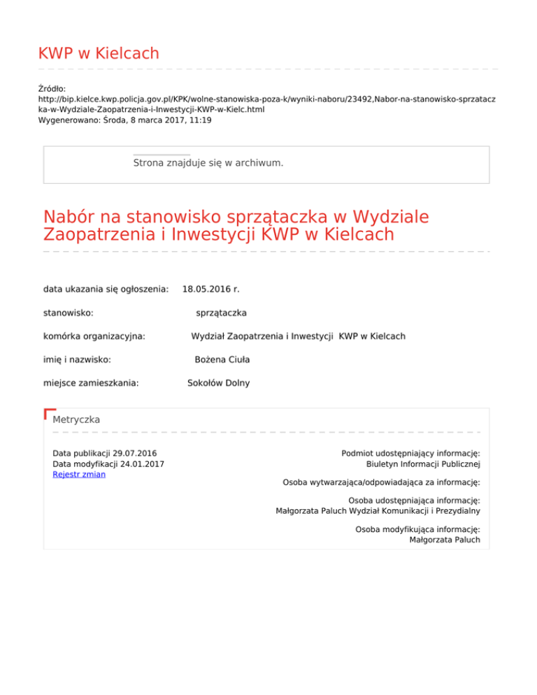 KWP w Kielcach Źródło: http://bip.kielce.kwp.policja.gov.pl/KPK/wolne-stanowiska-poza-k/wyniki-naboru/23492,Nabor-na-stanowisko-sprzatacz ka-w-Wydziale-Zaopatrzenia-i-Inwestycji-KWP-w-Kielc.html Wygenerowano: Środa, 8 marca 2017, 11:19 Strona znajduje się w archiwum. Nabór na stanowisko sprzątaczka w Wydziale Zaopatrzenia i Inwestycji KWP w Kielcach data ukazania się ogłoszenia: stanowisko: komórka organizacyjna: imię i nazwisko: miejsce zamieszkania: 18.05.2016 r. sprzątaczka Wydział Zaopatrzenia i Inwestycji KWP w Kielcach Bożena Ciuła Sokołów Dolny Metryczka Data publikacji 29.07.2016 Data modyfikacji 24.01.2017 Rejestr zmian Podmiot udostępniający informację: Biuletyn Informacji Publicznej Osoba wytwarzająca/odpowiadająca za informację: Osoba udostępniająca informację: Małgorzata Paluch Wydział Komunikacji i Prezydialny Osoba modyfikująca informację: Małgorzata Paluch